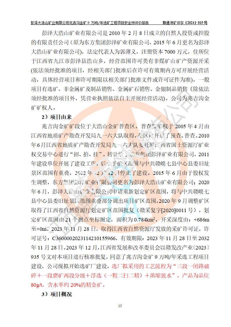 项目简介 | 彭泽大浩山矿业有限公司是2010年2月8日成立的自然人投资或控股的有限责任公司,法定**人为郭薄义,注册资本7000万元,住所位于江西省九江市彭泽县浩山乡,经营范围许可类有非煤矿山矿产资源开采(依法须经批准的项目,经相关部门批准后在许可**期内方可开展经营活动,具体经营项目和许可期限以相关部门批准文件或许可证件为准),一般项目有选矿、非金属矿及制品销售、金属矿石销售、金银制品销售《除依法须经批准的项目外,凭营业执照依法自主开展经营活动)。彭泽县兆吉沟金矿矿段位于大浩山金矿普查区,大浩山金矿普查探矿权于2005年4月由江西省地质矿产勘查开发局九一六大队取得,在区内开展了预查、普查。2010年6月江西省地质矿产勘查开发局九一六大队委托原江西省国土资源厅矿业权交易中心进行“招、拍、挂”公开**给东方集团彭泽矿业有限公司(2015年6月更名为彭泽大浩山矿业有限公司)。2020年6月,彭泽大浩山矿业有限公司申请重新划定矿区范围,将与**赣皖七县中心县委旧址景区范围重叠部分调出项目矿区范围。2020年9月,江西省自然资源厅同意了划定申请,并下发了划定矿区范围批复(赣采复字[2020]0011号)。划定矿区范围由21个拐点坐标圈定,面积为0.784km2,开采深度由:+686m至+0m。 2021年4月公司编制了《彭泽大浩山矿业有限公司兆吉沟金矿地下开采工程可行性研究报告》,拟对矿区进行采选。2023年12月取得了江西省发展和改革委员会《关于彭泽大浩山矿业有限公司兆吉沟金矿9万吨/年采选工程项目核准的批复》赣发改产业〔2023〕935号,同意了兆吉沟金矿9万吨/年采选工程项目建设。现公司拟开展项目选矿厂工程建设。 | |||||
