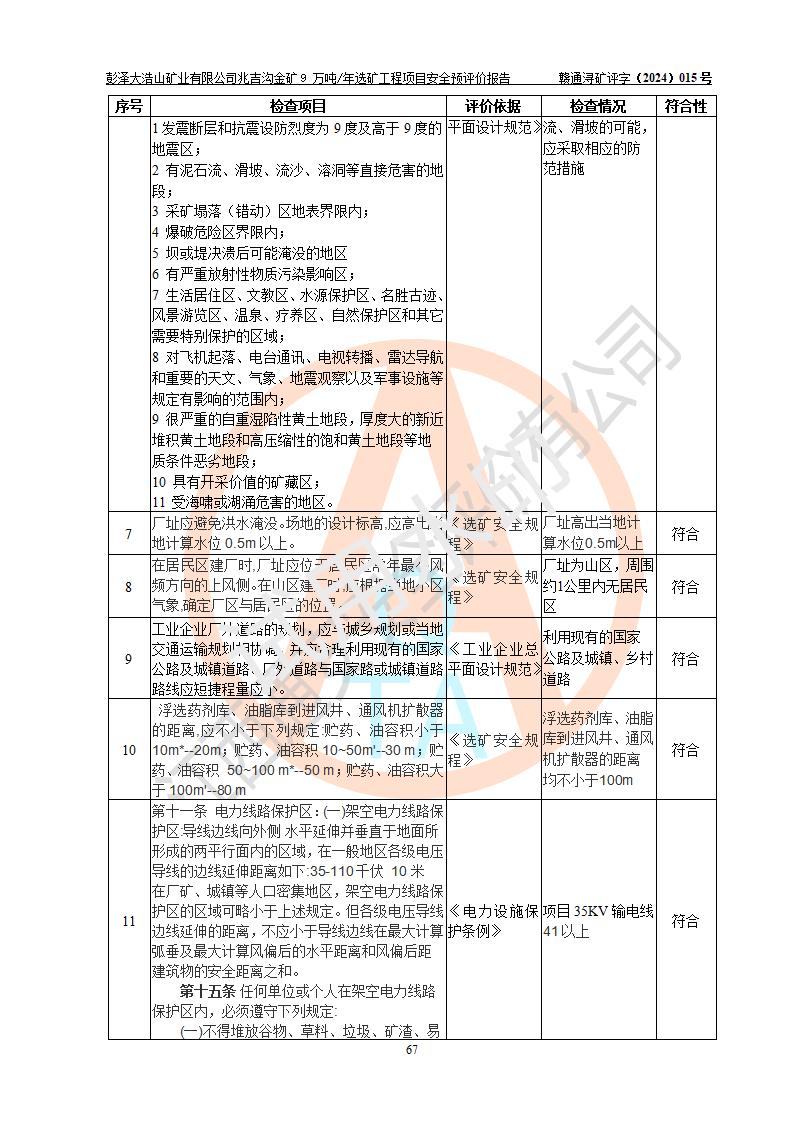 评价结论 | 总体结论:彭泽大浩山矿业有限公司兆吉沟金矿9 万吨/年选矿工程项目的厂址、总平面布置和拟设置的场所及设备设施的安全可靠性能达到**法规、标准规定要求;项目存在的危险有害因素可控,在落实本评价报告提出的有关安全对策措施后,其危险有害程度能达到可以接受的程度,项目建设能够实现安全运行的目标。 | |||||