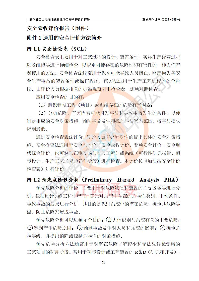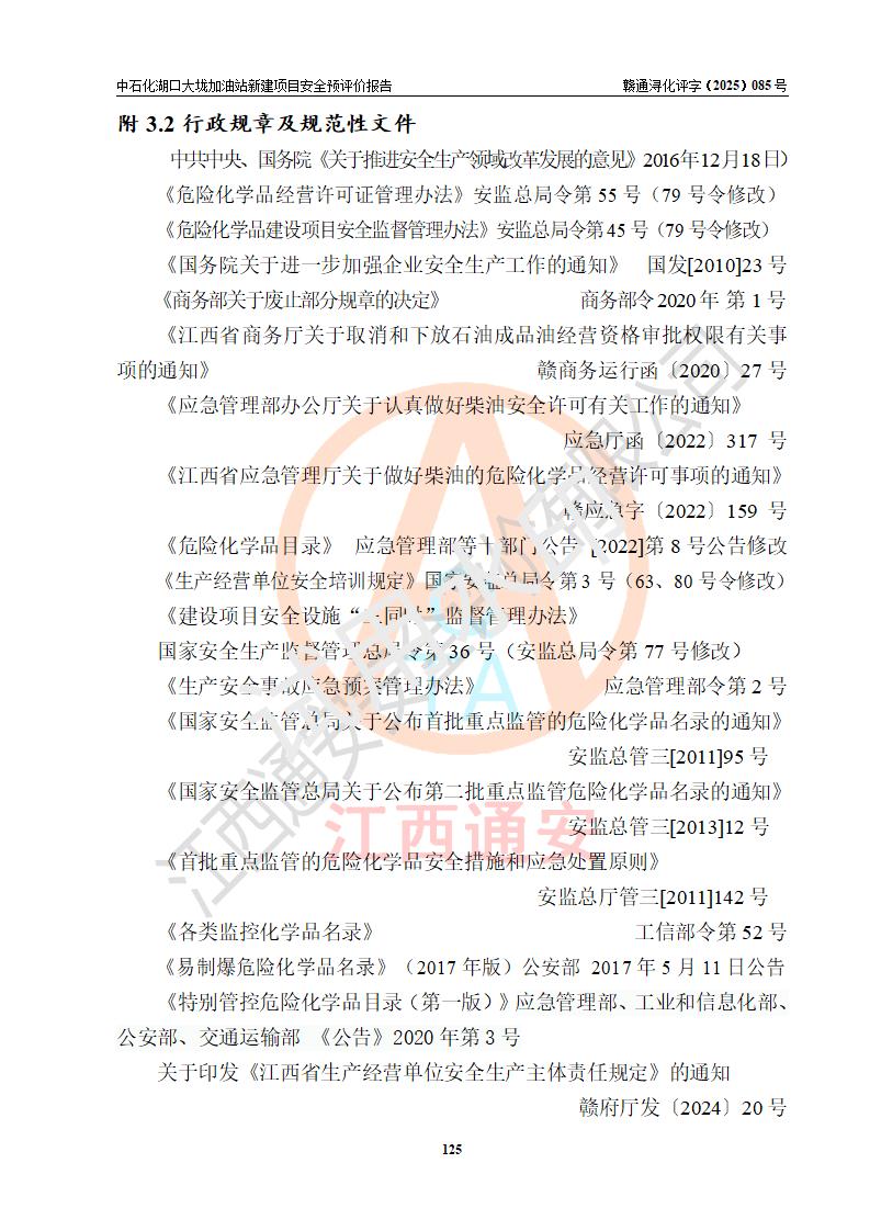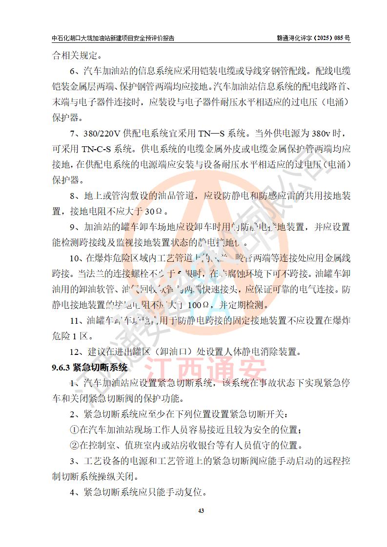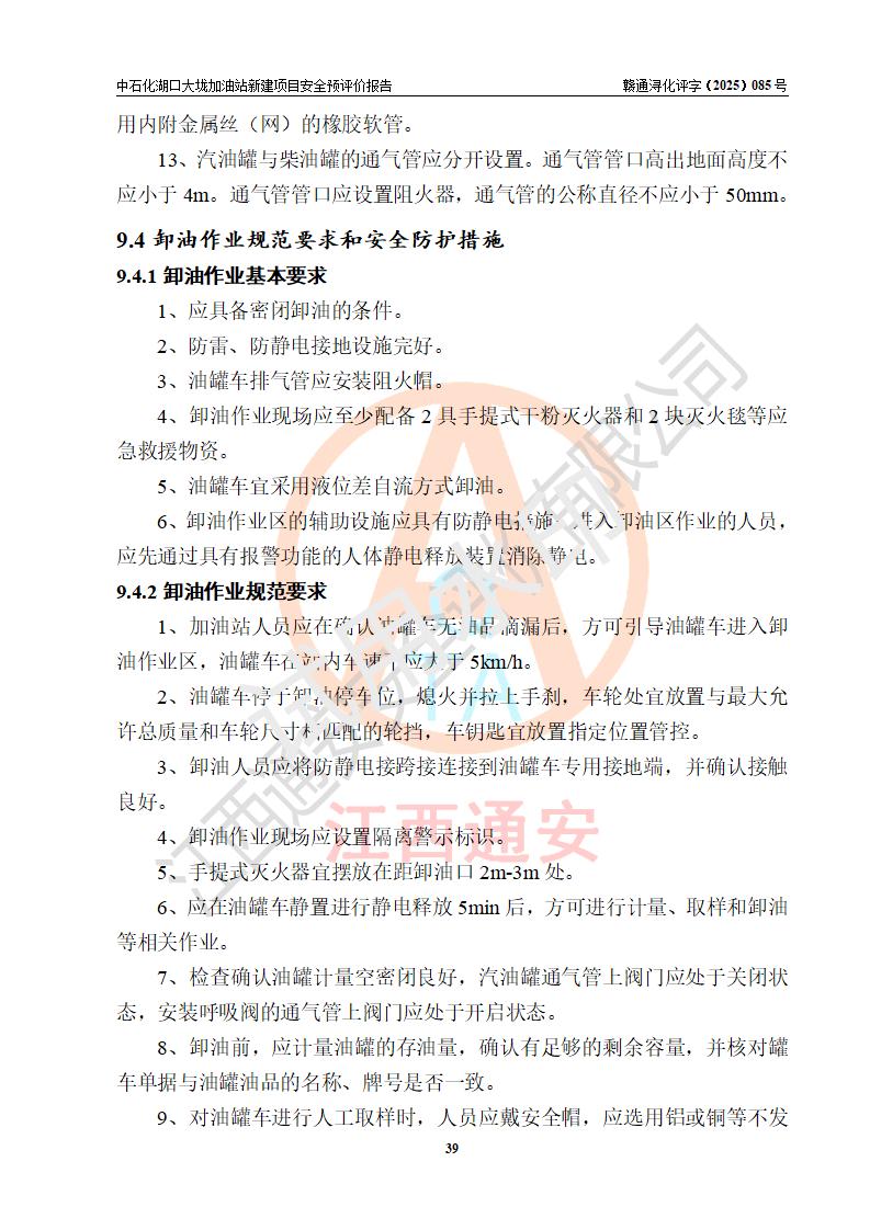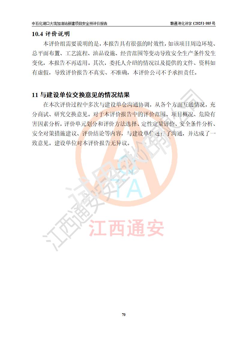 评价结论 | 中国石化销售股份有限公司江西九江石油分公司湖口大垅加油站新建项目的选址、自然条件适宜该项目工程的建设;项目规划设计中的总体布局方案可行,符合有关法规、标准要求;项目选择的工艺过程及设备设施的安全可靠性能达到**法规、标准规定要求;项目存在的危险有害因素可控,在落实项目建设方案及评价报告提出的有关安全对策措施后,其危险有害程度能达到可以接受的程度,项目建设能够实现安全运行的目标。 | |||