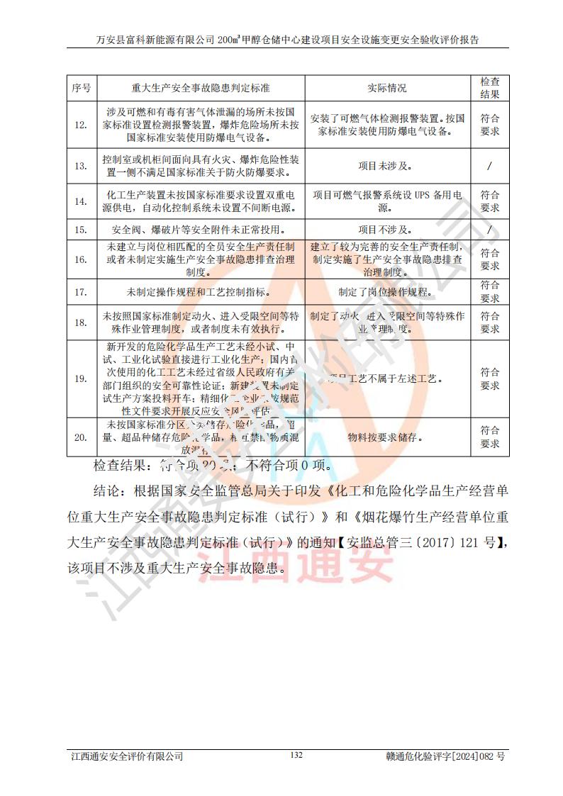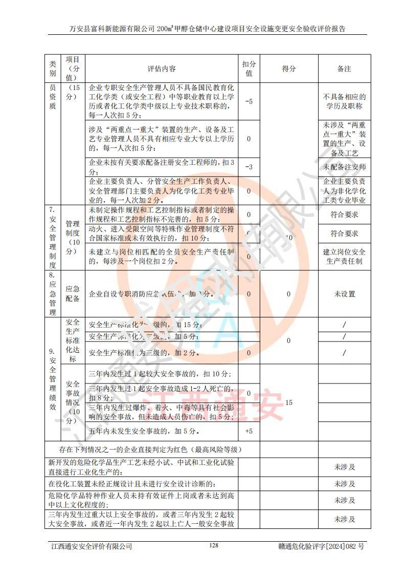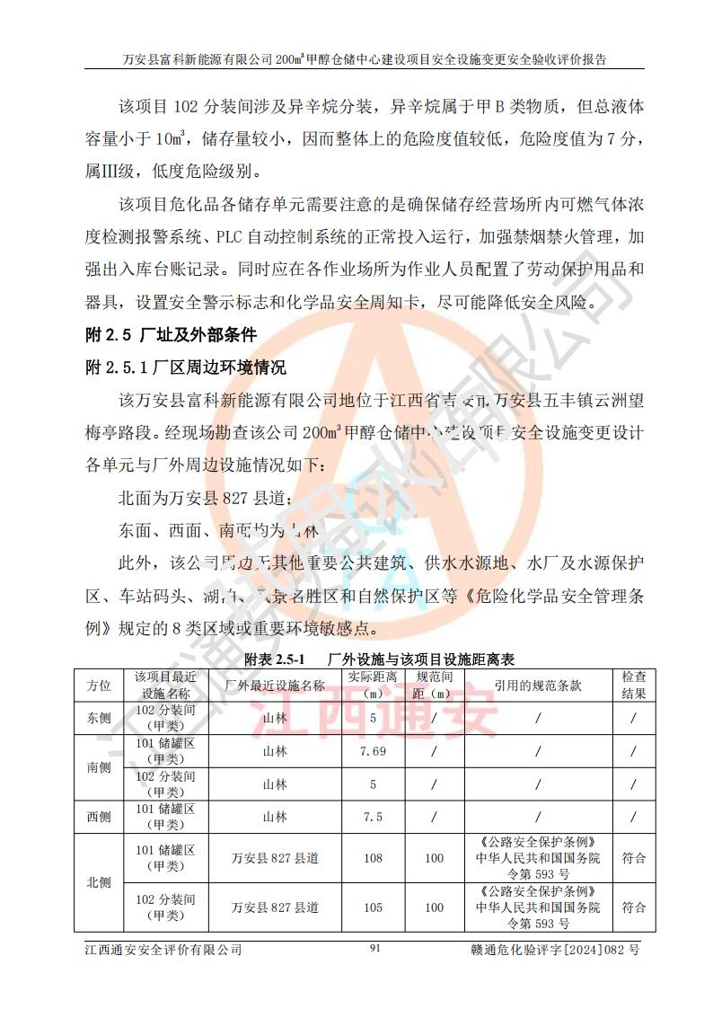 评价结论 | 1、万安县富科新能源有限公司200m3甲醇仓储中心建设项目安全设施变更设计各储存经营单元的安全设施与主体工程同时设计、同时施工、同时投入使用,符合**有关建设项目“三同时”的规定和要求。 2、万安县富科新能源有限公司200m3甲醇仓储中心建设项目安全设施变更的主体工程安全设施、安全措施符合法律法规的规定和要求,并运行**;公用工程及辅助设施满足主体工程生产安全的需要;企业安全管理体系满足生产安全的要求。 3、万安县富科新能源有限公司已针对本报告提出的安全隐患整改意见组织人员进行整改,经过整改已落实到位,企业安全生产的风险控制在可以接受的范围内。 综上所述,万安县富科新能源有限公司200m3甲醇仓储中心建设项目安全设施变更相关的设备设施和安全设施运行正常,企业安全管理机制运行正常,安全设施、措施达到规范要求和预期结果,可以满足该项目危险化学品储存经营的要求,安全管理**。万安县富科新能源有限公司200m3甲醇仓储中心建设项目安全设施变更具备安全设施竣工验收条件。 | |||