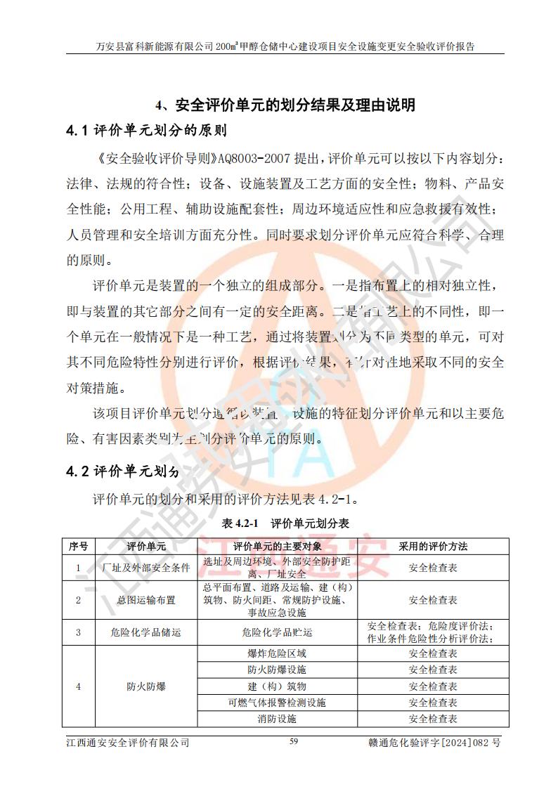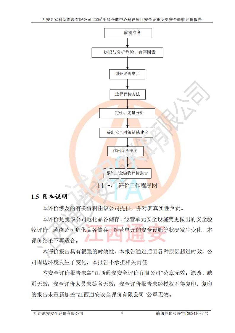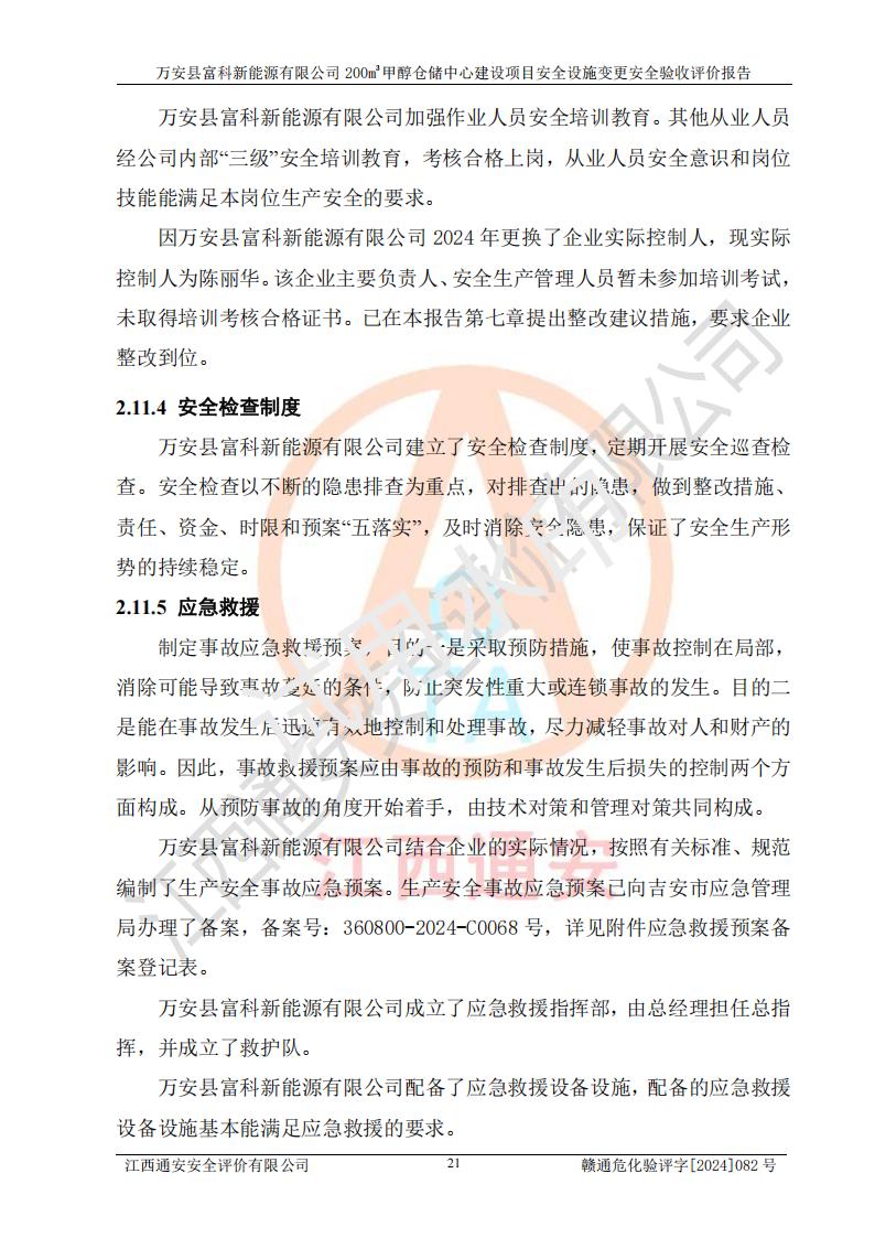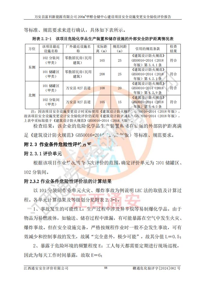 评价结论 | 1、万安县富科新能源有限公司200m3甲醇仓储中心建设项目安全设施变更设计各储存经营单元的安全设施与主体工程同时设计、同时施工、同时投入使用,符合**有关建设项目“三同时”的规定和要求。 2、万安县富科新能源有限公司200m3甲醇仓储中心建设项目安全设施变更的主体工程安全设施、安全措施符合法律法规的规定和要求,并运行**;公用工程及辅助设施满足主体工程生产安全的需要;企业安全管理体系满足生产安全的要求。 3、万安县富科新能源有限公司已针对本报告提出的安全隐患整改意见组织人员进行整改,经过整改已落实到位,企业安全生产的风险控制在可以接受的范围内。 综上所述,万安县富科新能源有限公司200m3甲醇仓储中心建设项目安全设施变更相关的设备设施和安全设施运行正常,企业安全管理机制运行正常,安全设施、措施达到规范要求和预期结果,可以满足该项目危险化学品储存经营的要求,安全管理**。万安县富科新能源有限公司200m3甲醇仓储中心建设项目安全设施变更具备安全设施竣工验收条件。 | |||