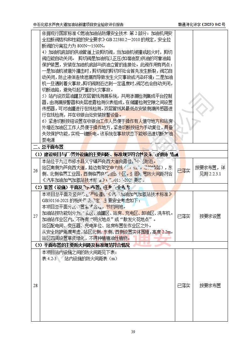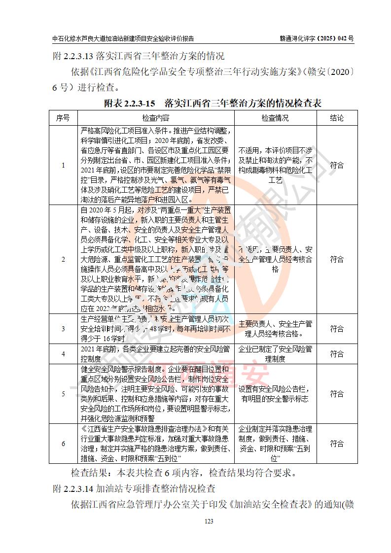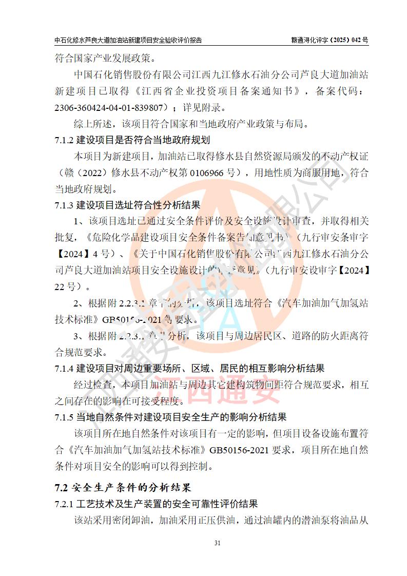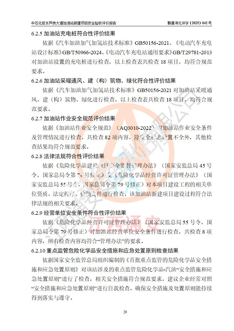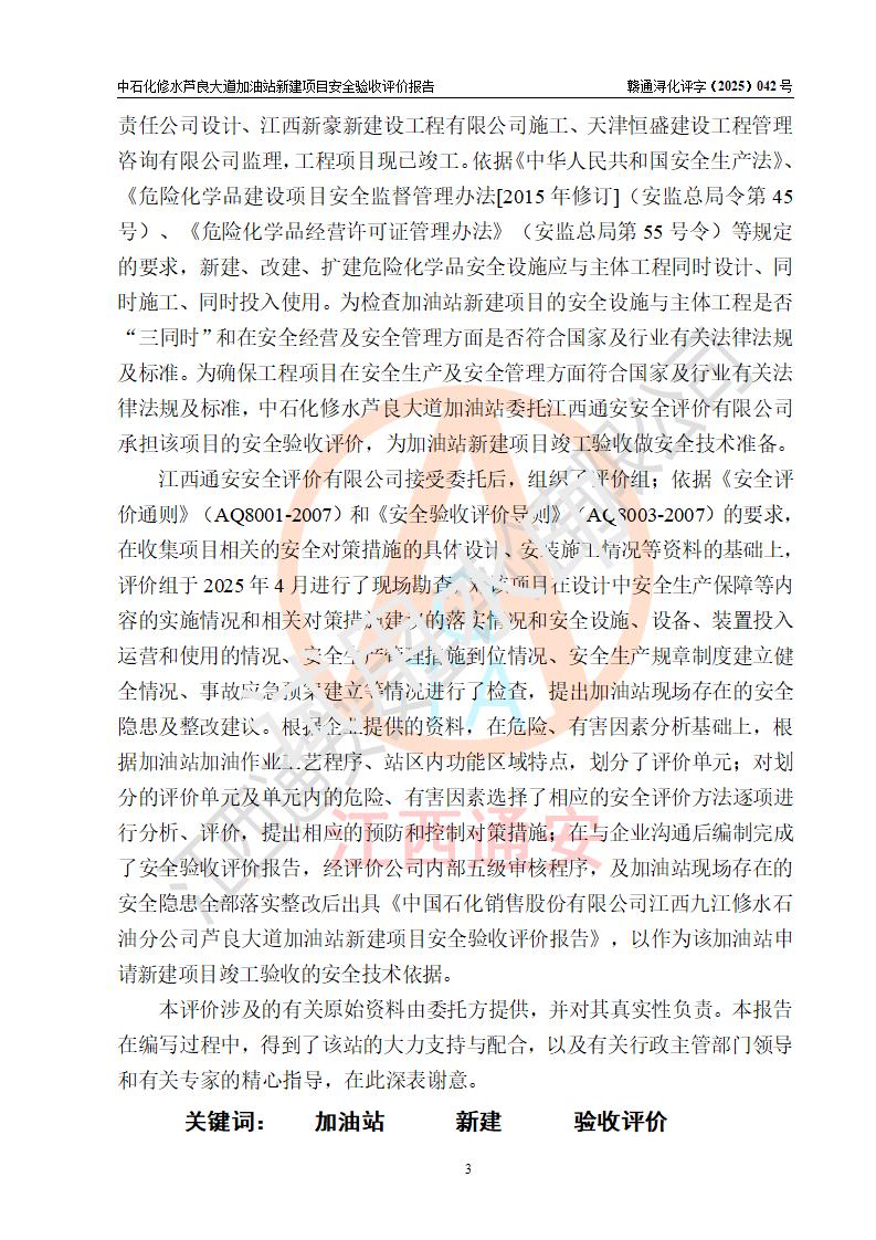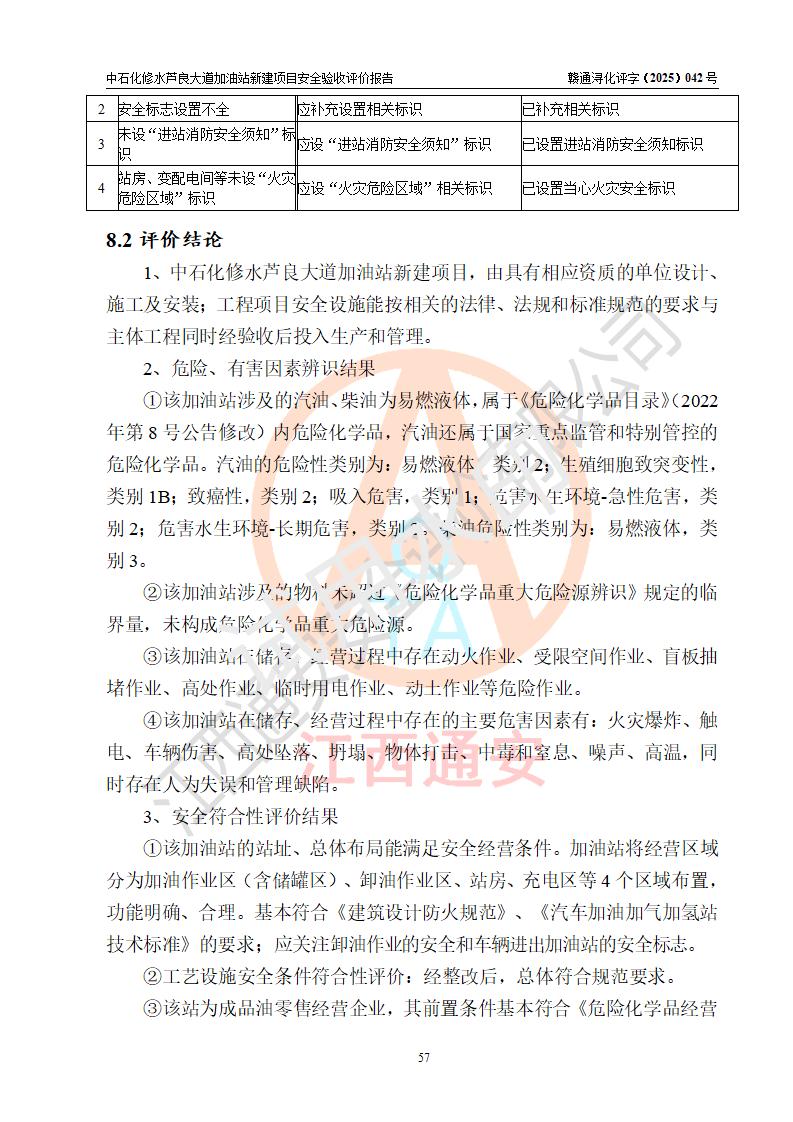 评价结论 | 中国石化销售股份有限公司江西九江修水石油分公司芦良大道加油站新建项目涉及的安全条件、安全生产条件、安全生产管理符合《危险化学品经营许可证管理办法》、《汽车加油加气加氢站技术标准》等**有关法规、标准、规范要求,能满足成品油零售经营单位的安全条件,具备项目竣工验收的条件。 | |||