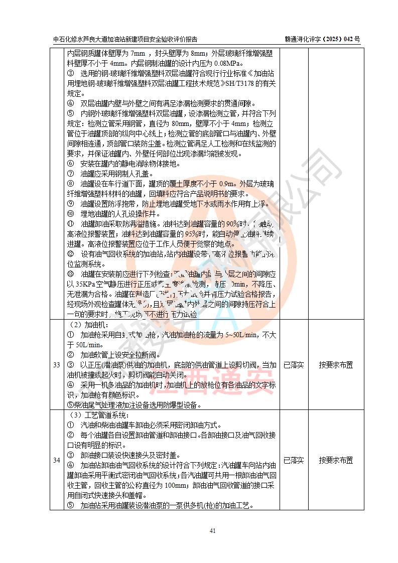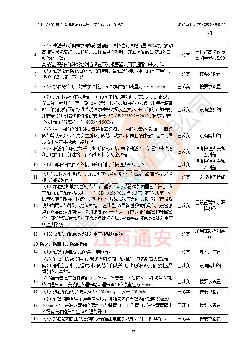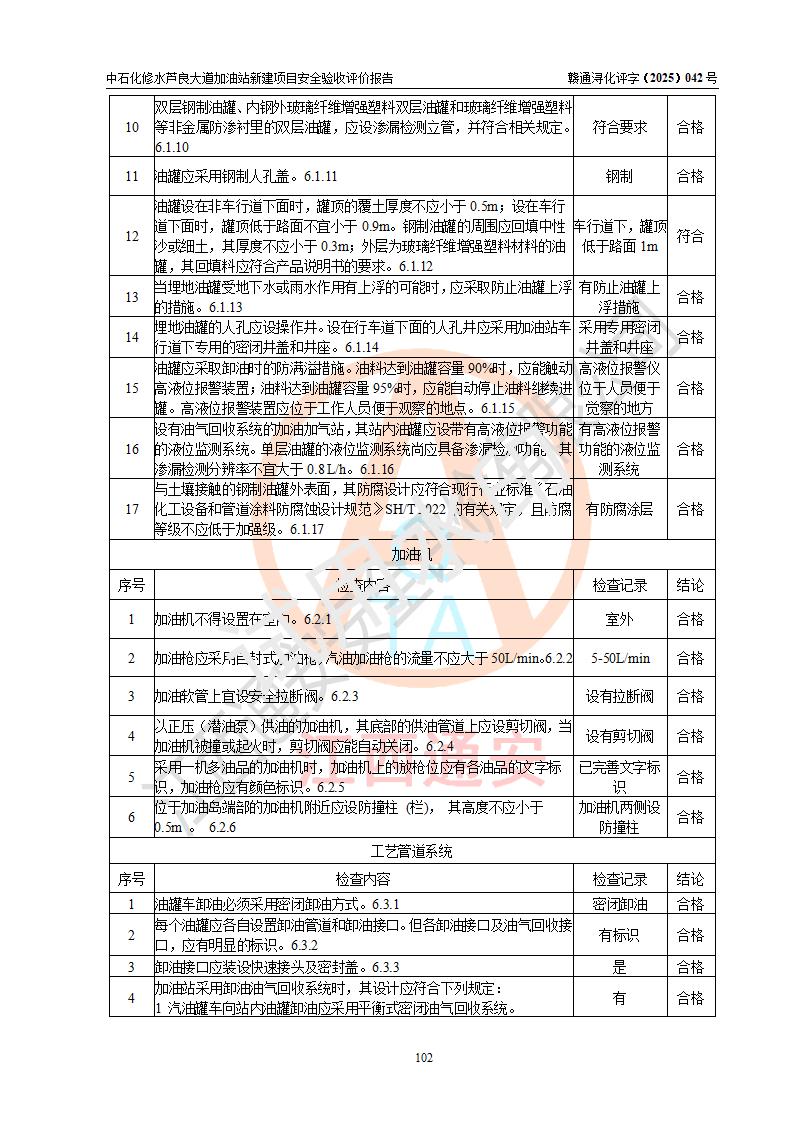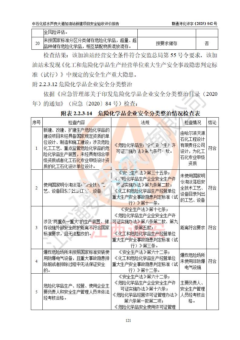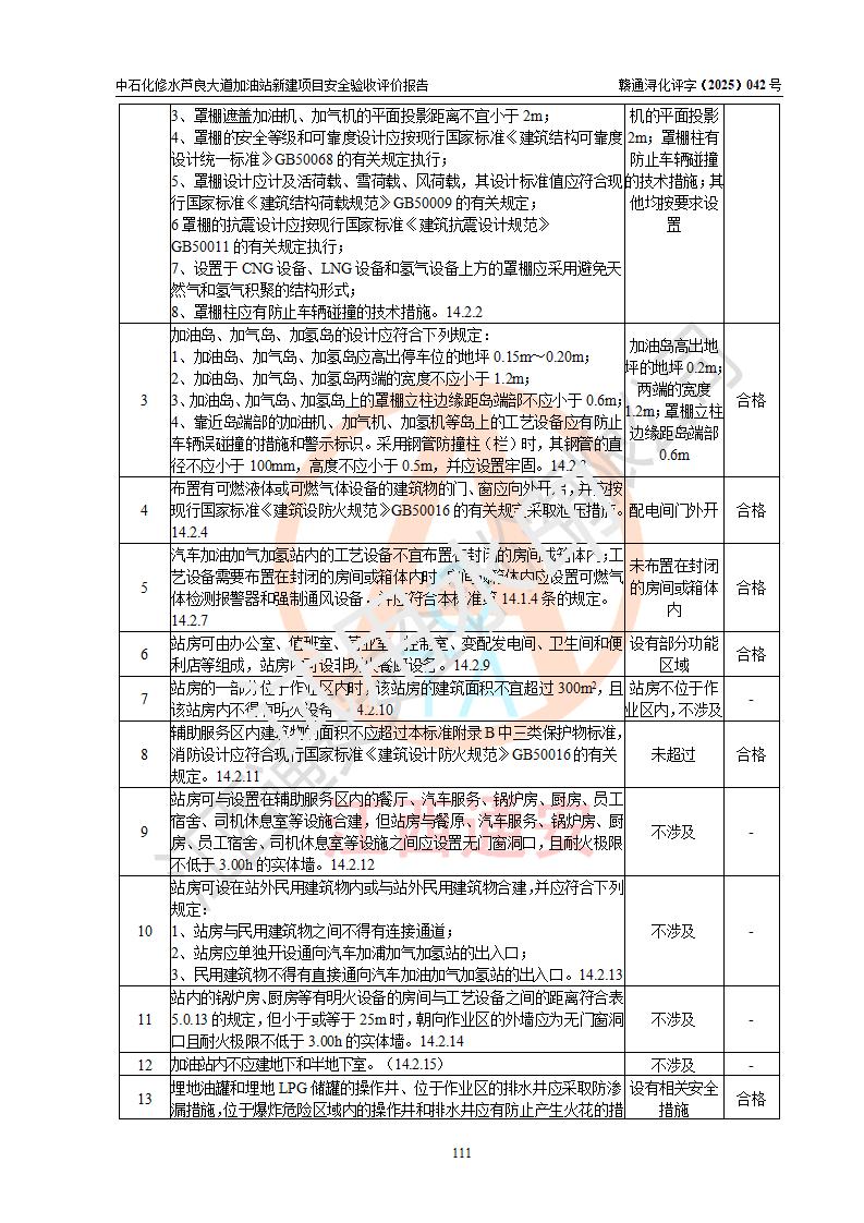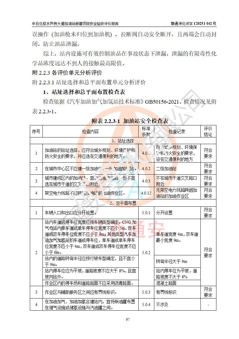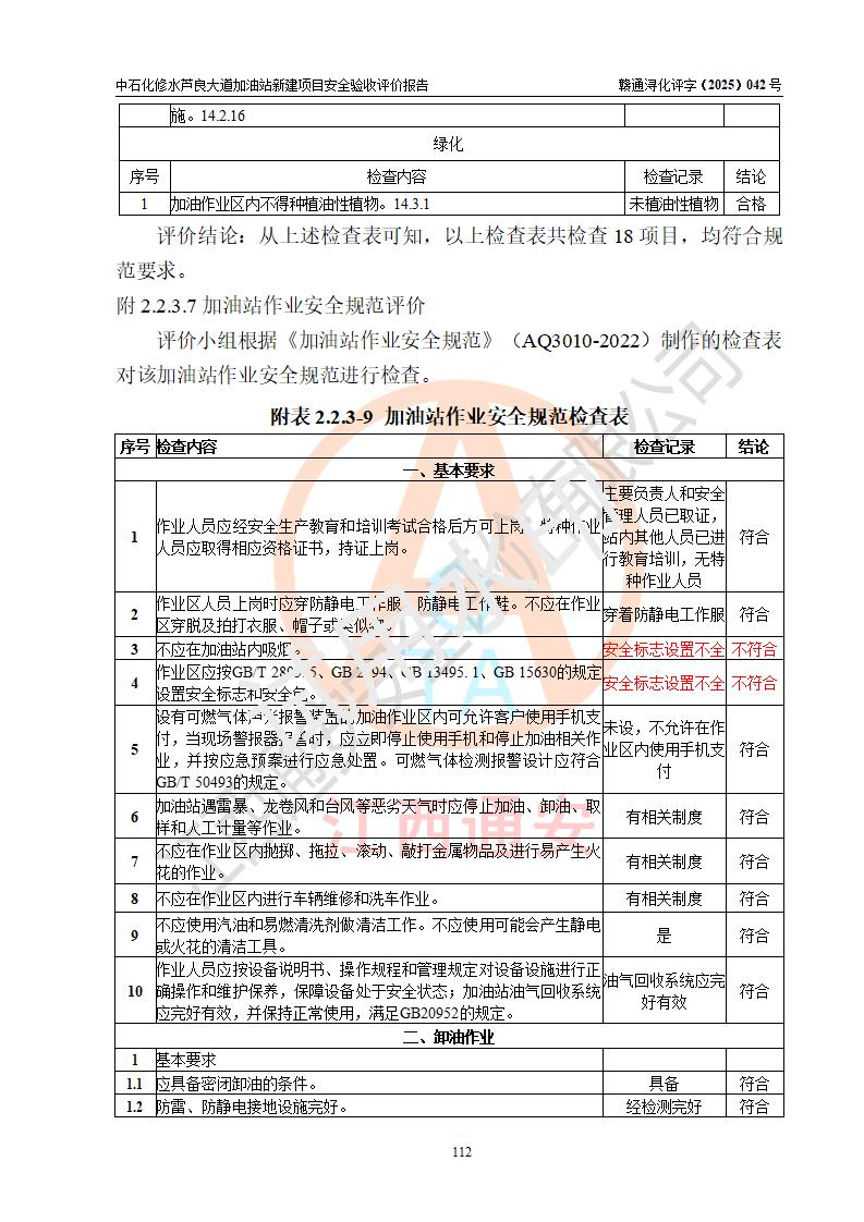 评价结论 | 中国石化销售股份有限公司江西九江修水石油分公司芦良大道加油站新建项目涉及的安全条件、安全生产条件、安全生产管理符合《危险化学品经营许可证管理办法》、《汽车加油加气加氢站技术标准》等**有关法规、标准、规范要求,能满足成品油零售经营单位的安全条件,具备项目竣工验收的条件。 | |||
