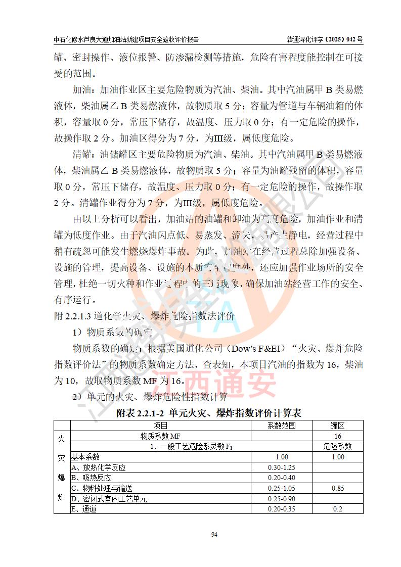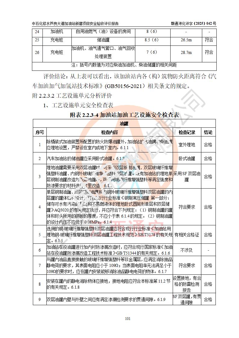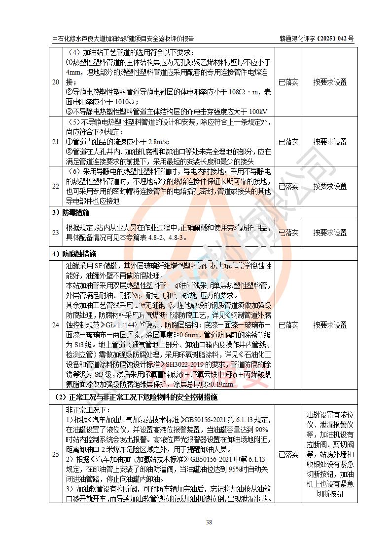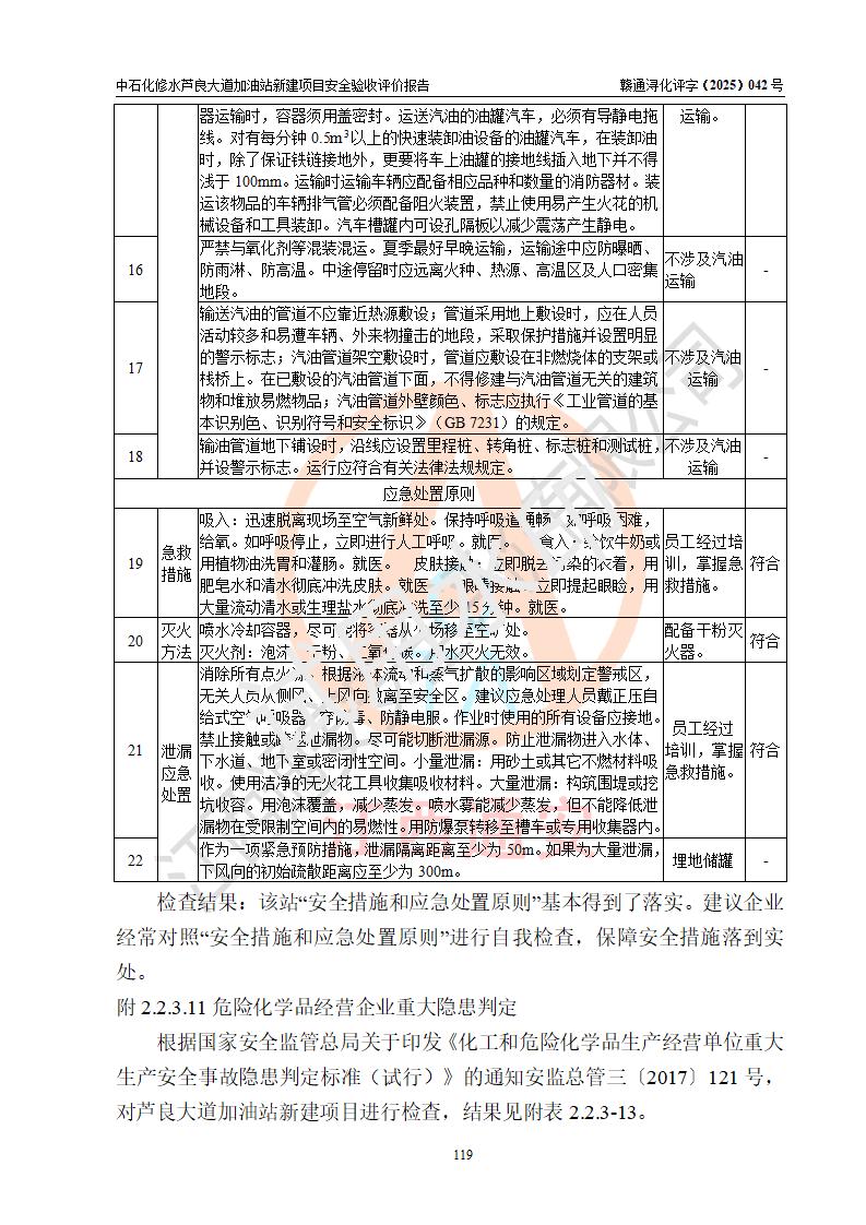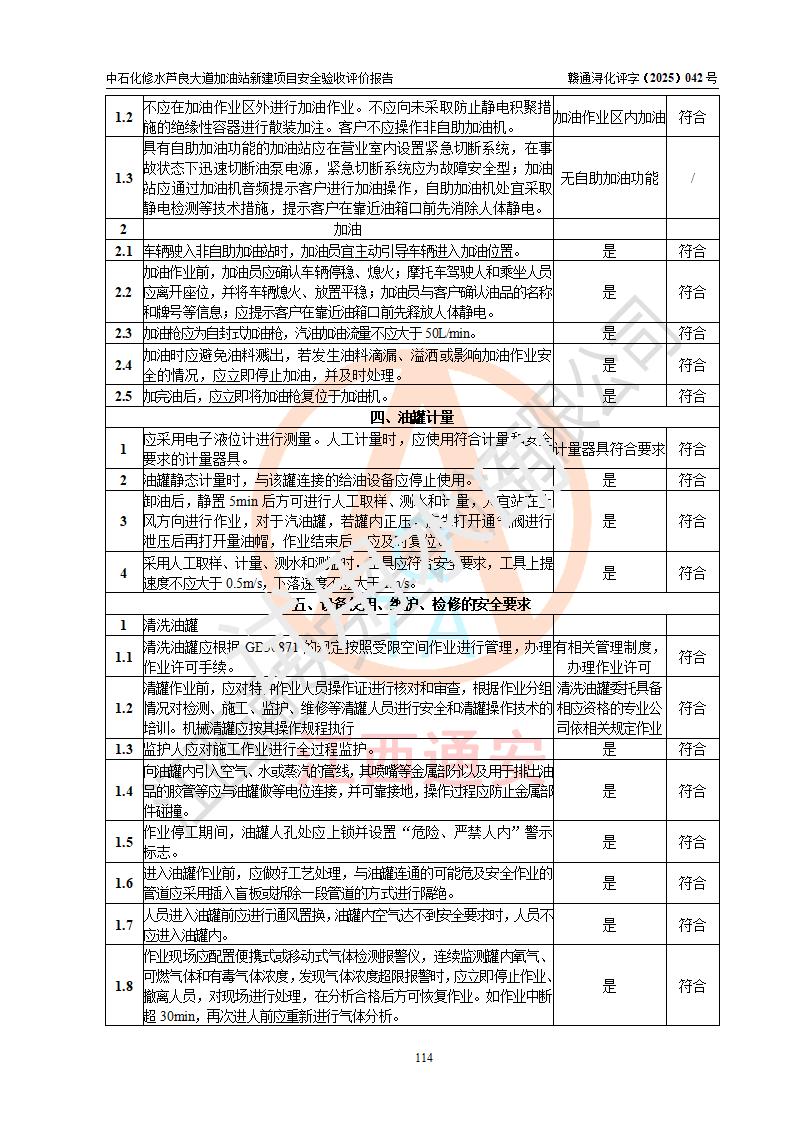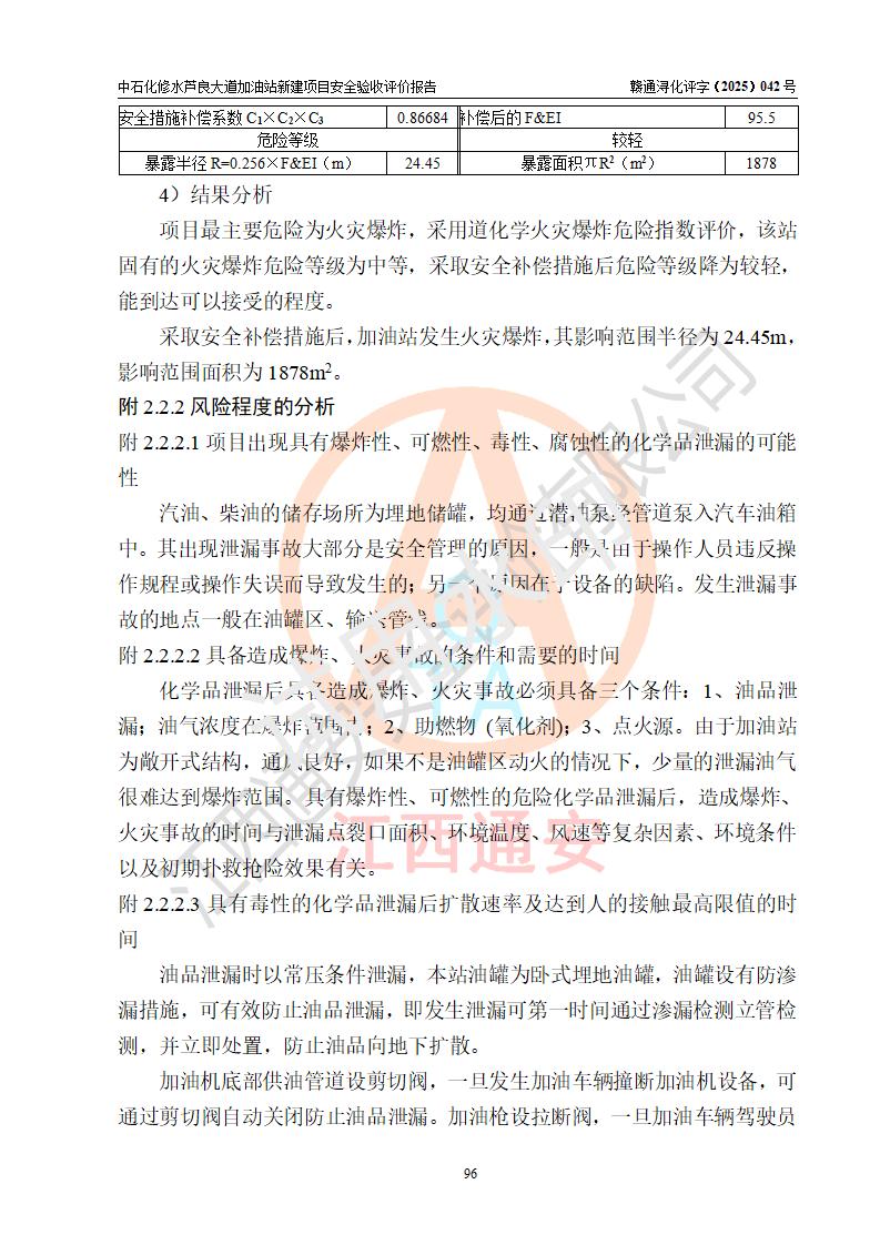 评价结论 | 中国石化销售股份有限公司江西九江修水石油分公司芦良大道加油站新建项目涉及的安全条件、安全生产条件、安全生产管理符合《危险化学品经营许可证管理办法》、《汽车加油加气加氢站技术标准》等**有关法规、标准、规范要求,能满足成品油零售经营单位的安全条件,具备项目竣工验收的条件。 | |||