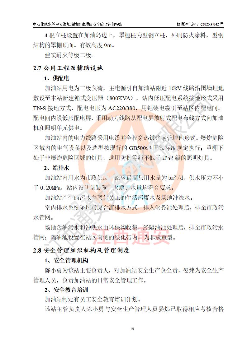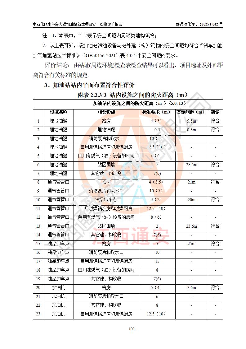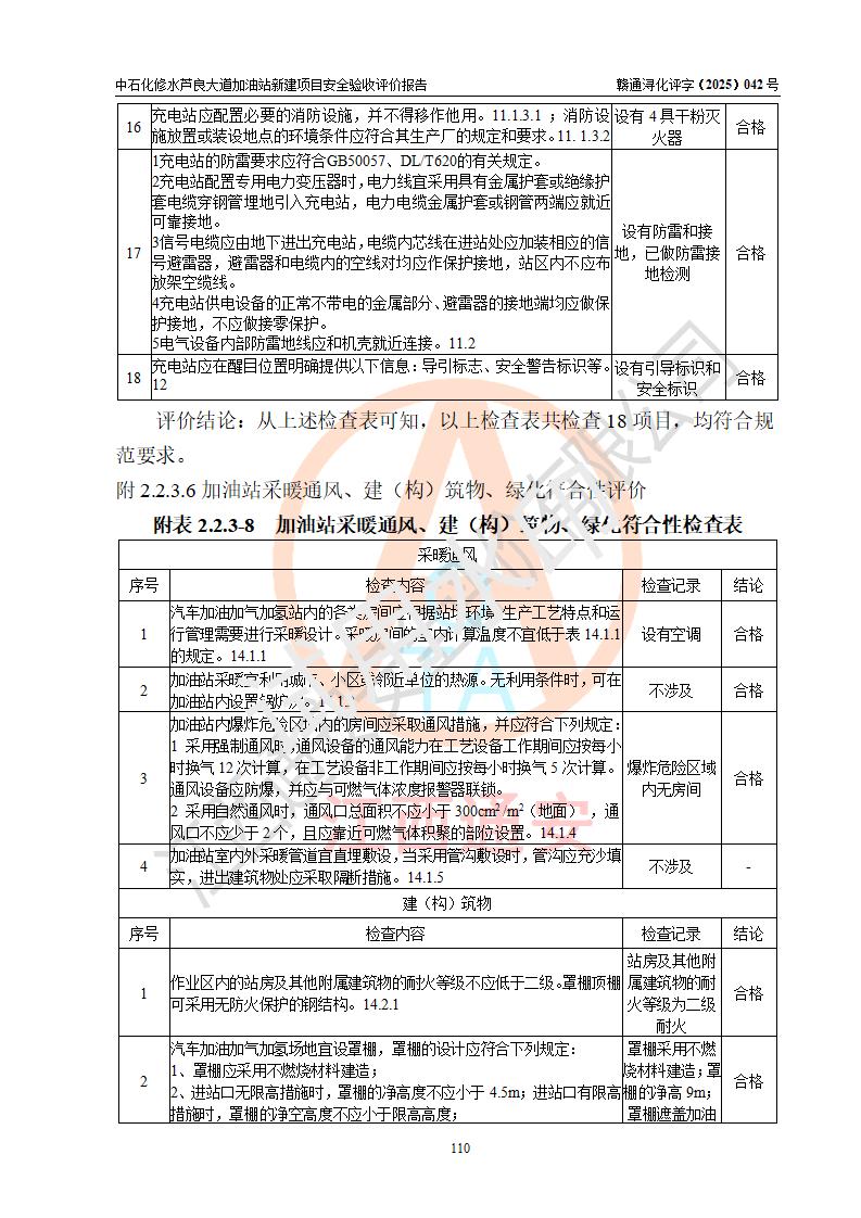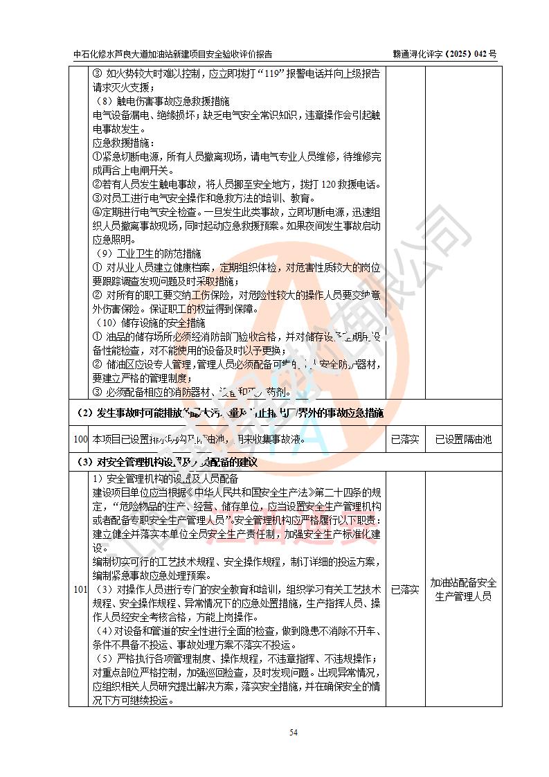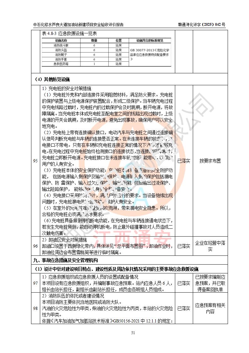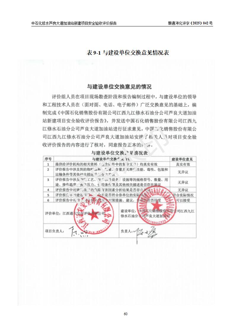 评价结论 | 中国石化销售股份有限公司江西九江修水石油分公司芦良大道加油站新建项目涉及的安全条件、安全生产条件、安全生产管理符合《危险化学品经营许可证管理办法》、《汽车加油加气加氢站技术标准》等**有关法规、标准、规范要求,能满足成品油零售经营单位的安全条件,具备项目竣工验收的条件。 | |||
