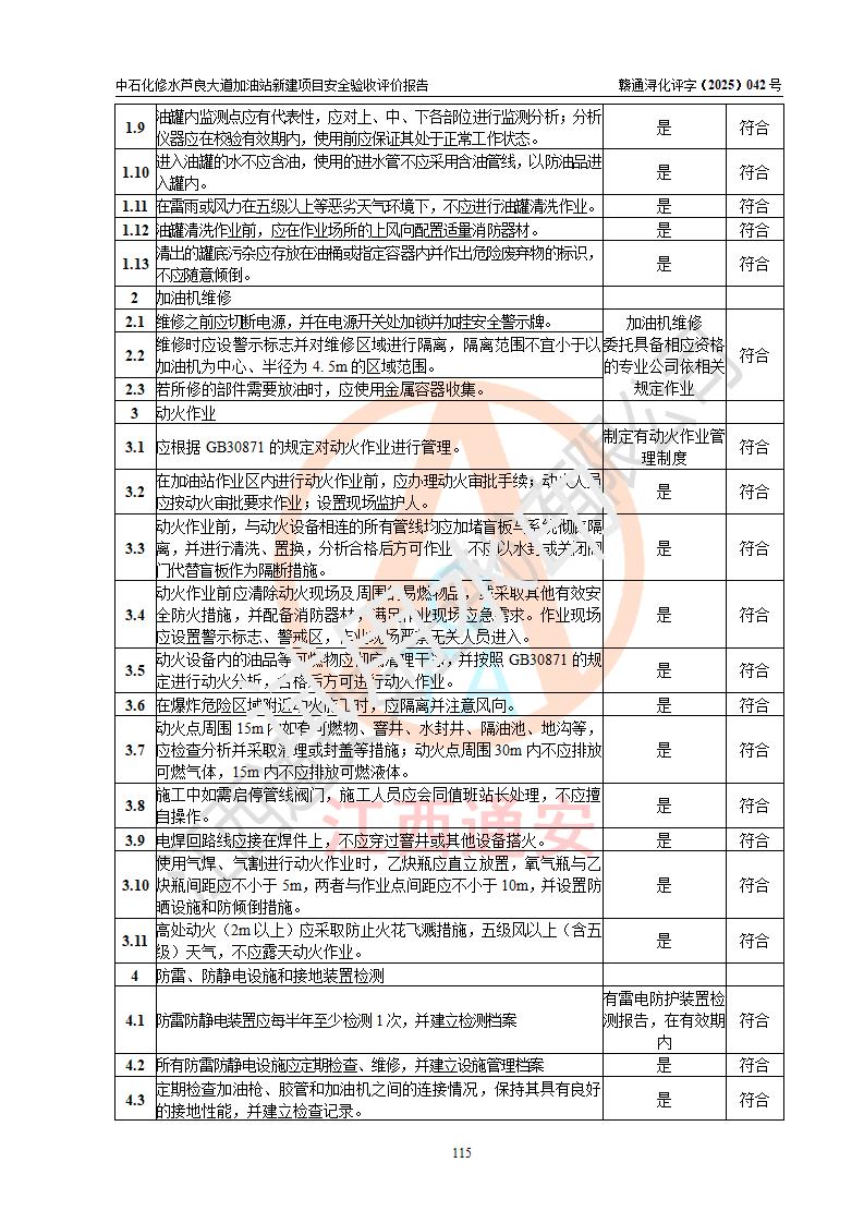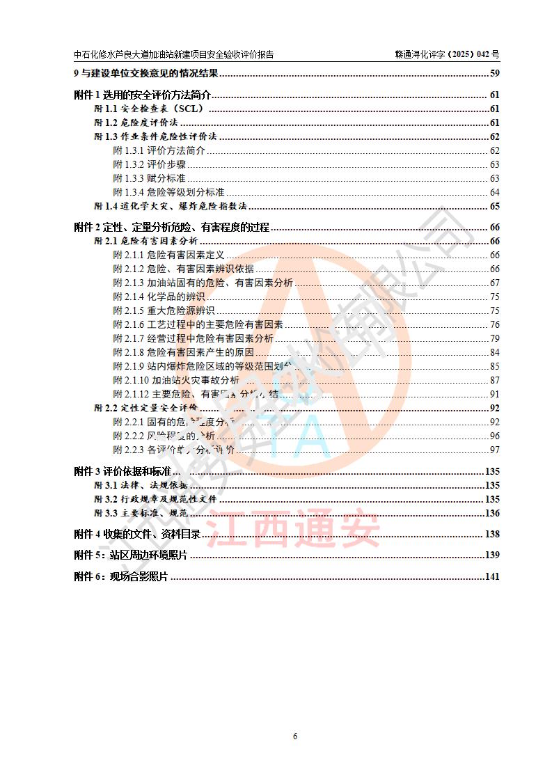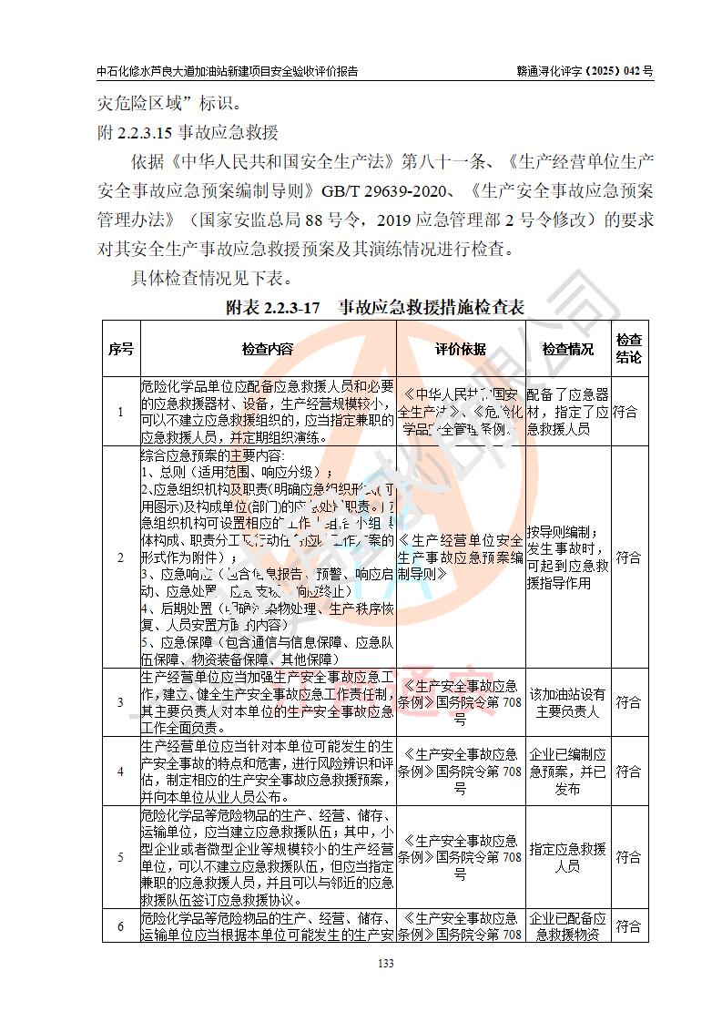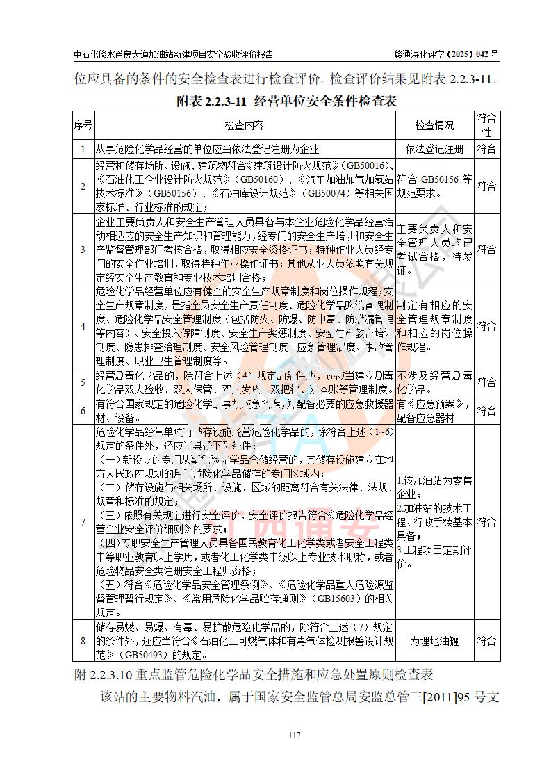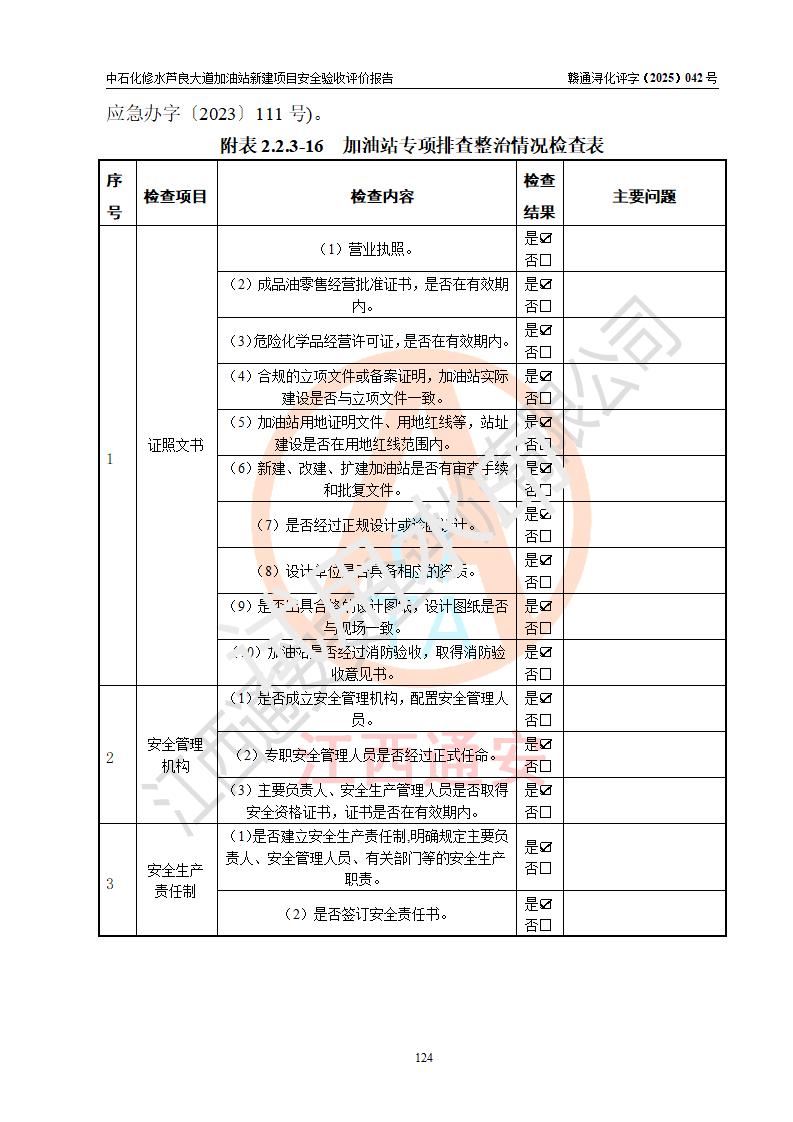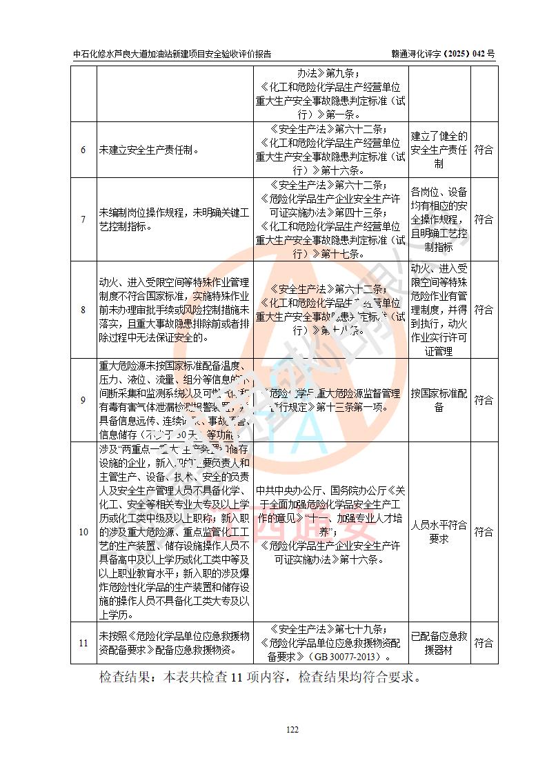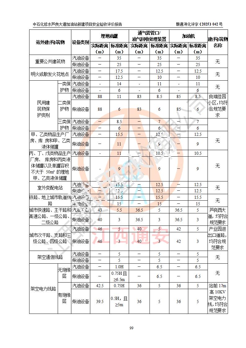 评价结论 | 中国石化销售股份有限公司江西九江修水石油分公司芦良大道加油站新建项目涉及的安全条件、安全生产条件、安全生产管理符合《危险化学品经营许可证管理办法》、《汽车加油加气加氢站技术标准》等**有关法规、标准、规范要求,能满足成品油零售经营单位的安全条件,具备项目竣工验收的条件。 | |||
