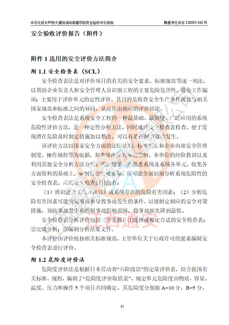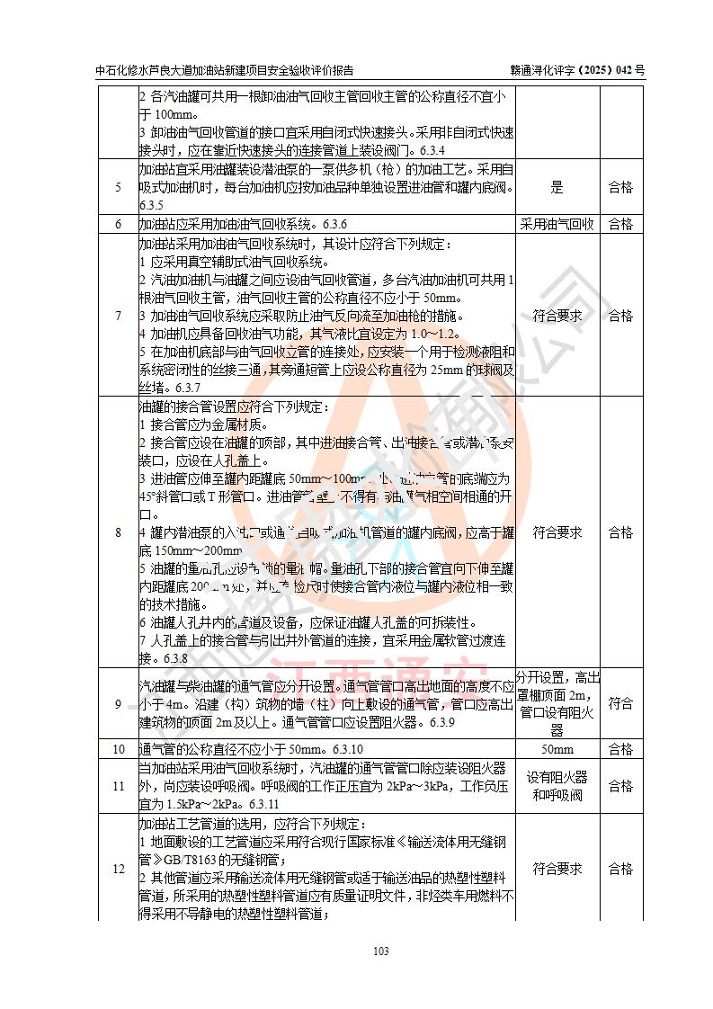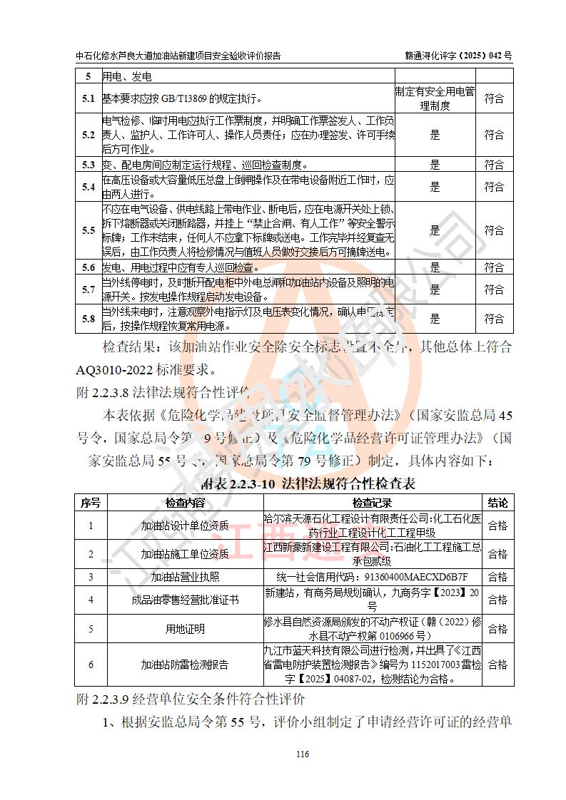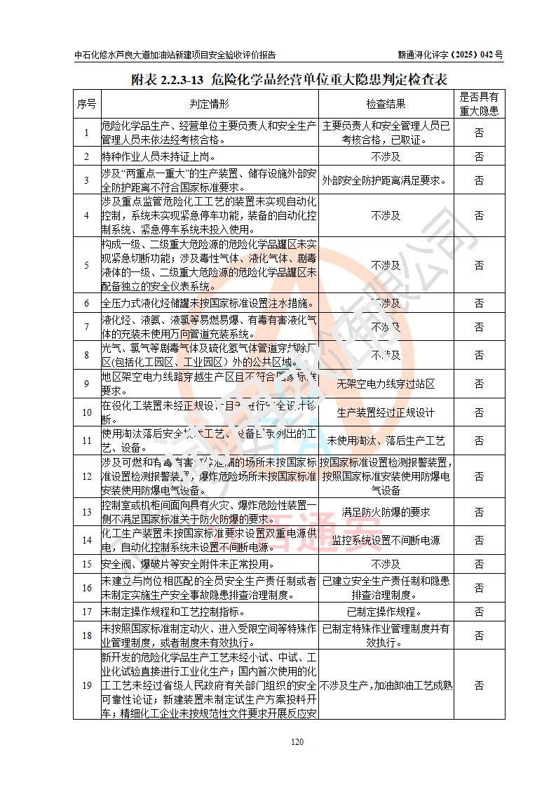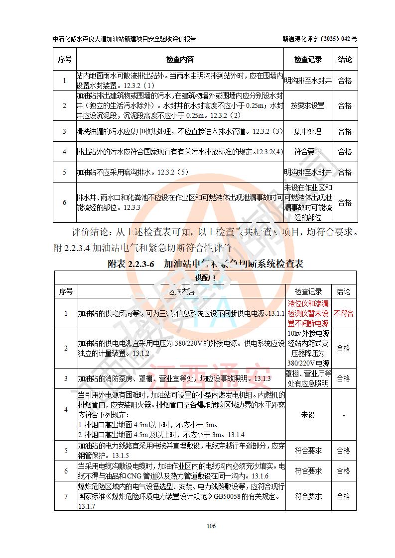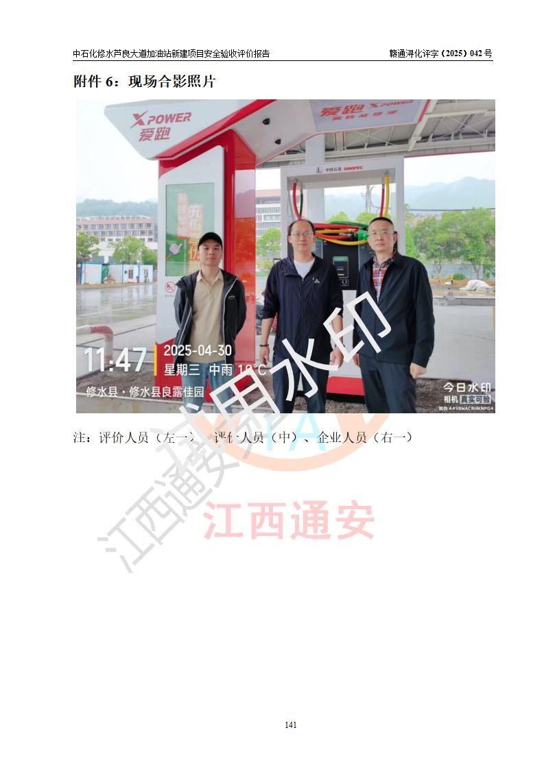 评价结论 | 中国石化销售股份有限公司江西九江修水石油分公司芦良大道加油站新建项目涉及的安全条件、安全生产条件、安全生产管理符合《危险化学品经营许可证管理办法》、《汽车加油加气加氢站技术标准》等**有关法规、标准、规范要求,能满足成品油零售经营单位的安全条件,具备项目竣工验收的条件。 | |||