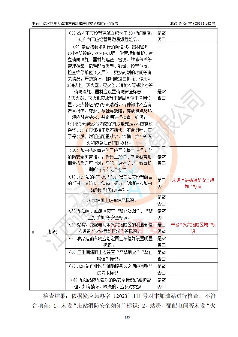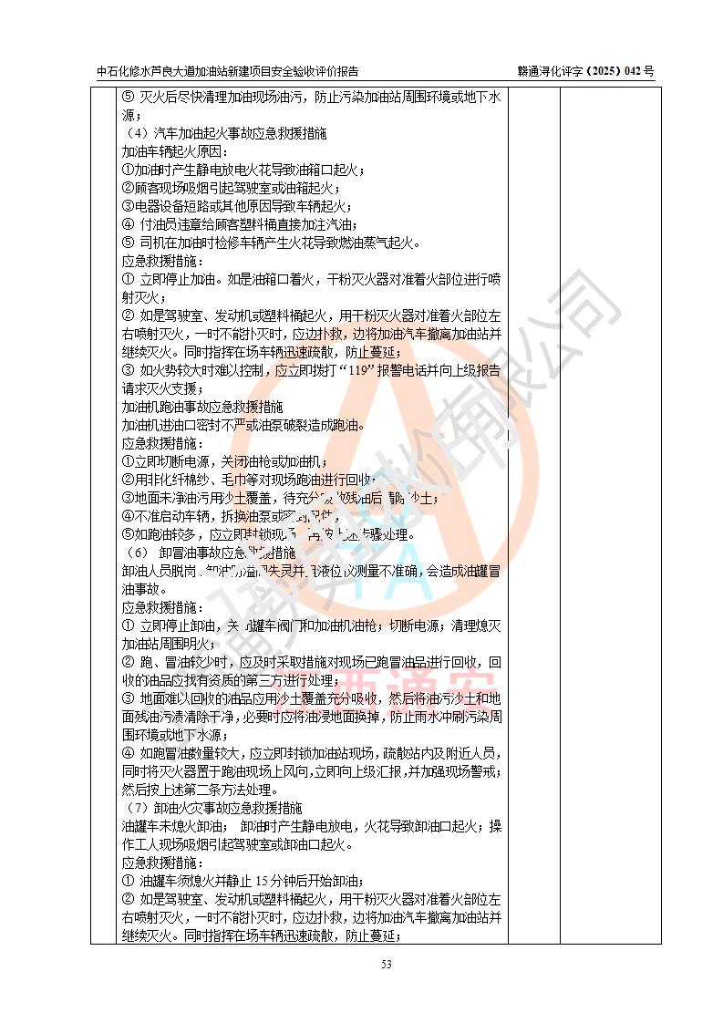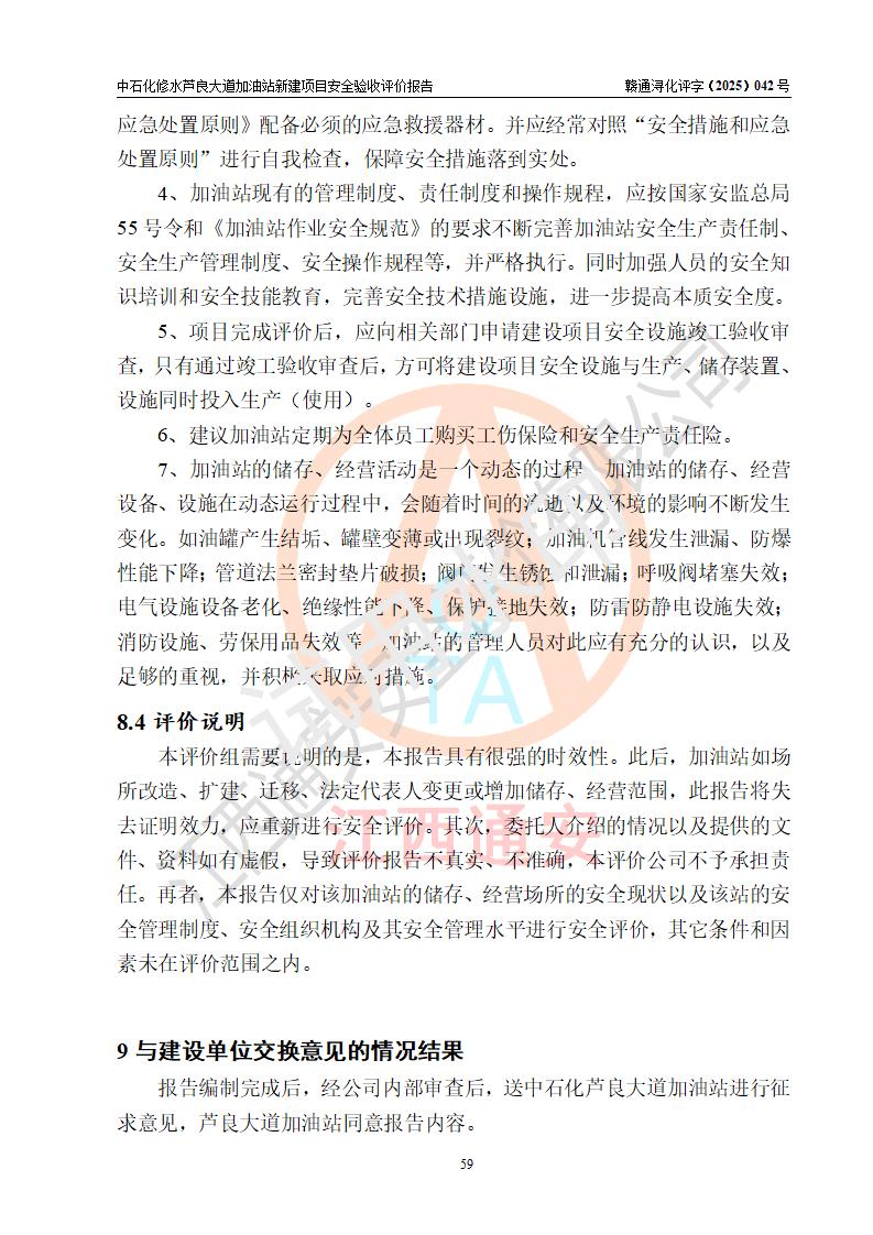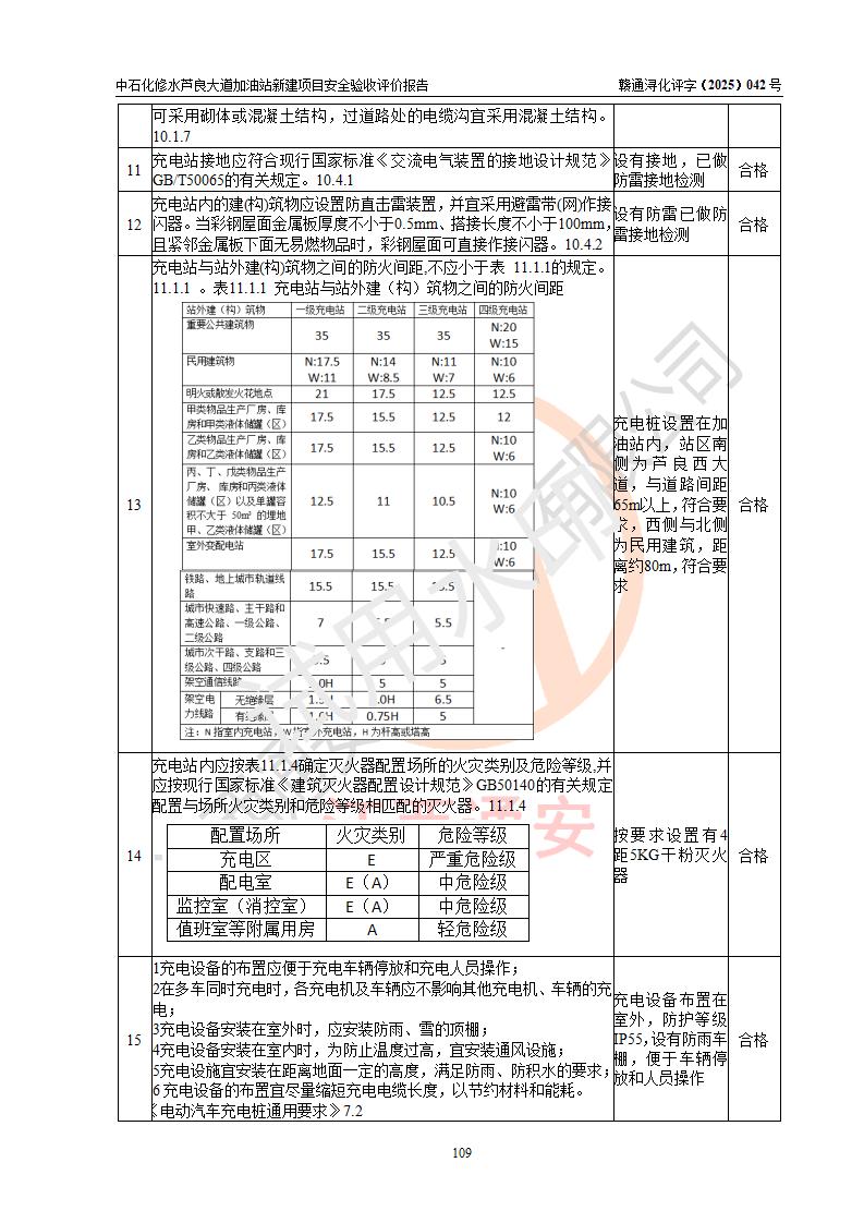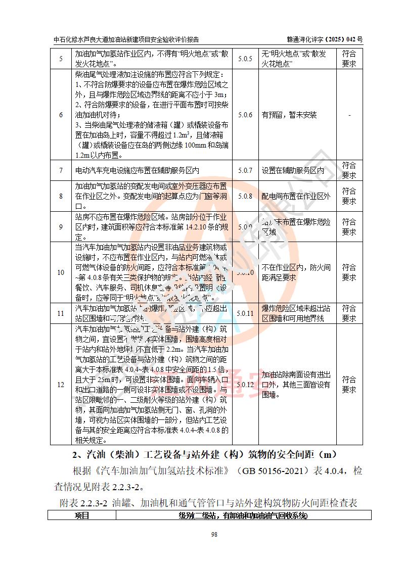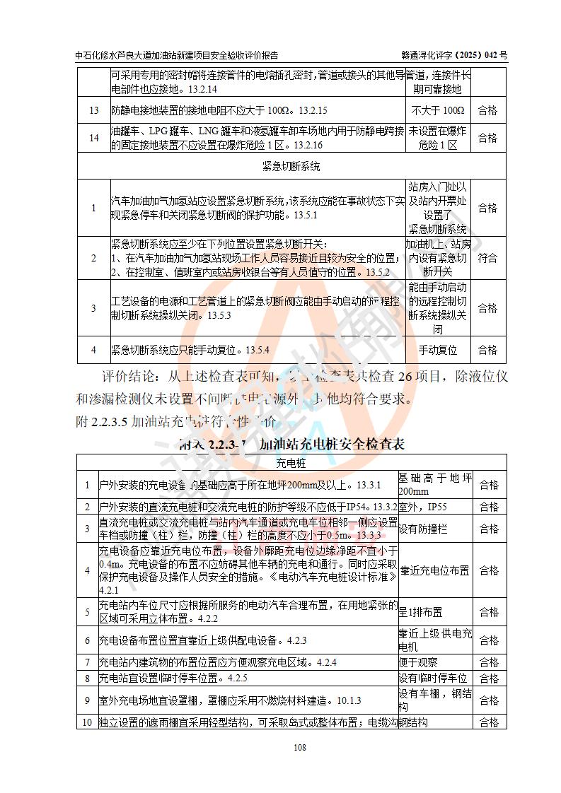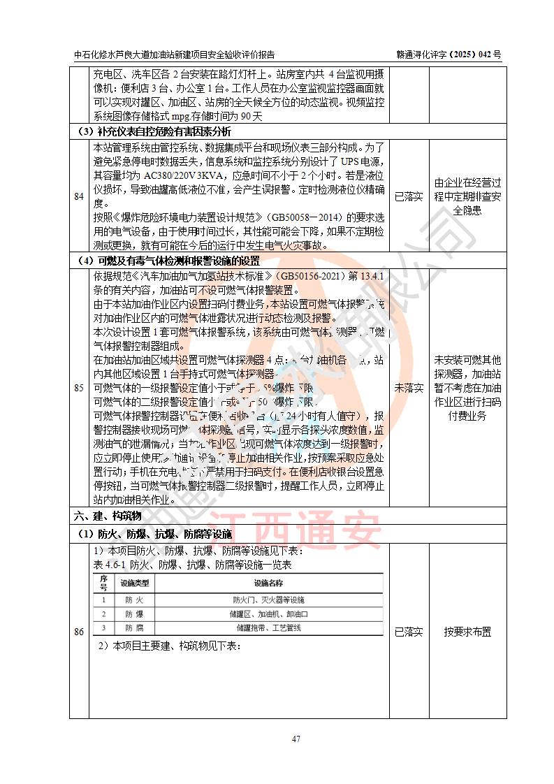 评价结论 | 中国石化销售股份有限公司江西九江修水石油分公司芦良大道加油站新建项目涉及的安全条件、安全生产条件、安全生产管理符合《危险化学品经营许可证管理办法》、《汽车加油加气加氢站技术标准》等**有关法规、标准、规范要求,能满足成品油零售经营单位的安全条件,具备项目竣工验收的条件。 | |||