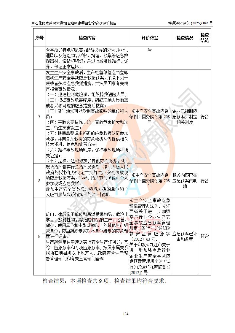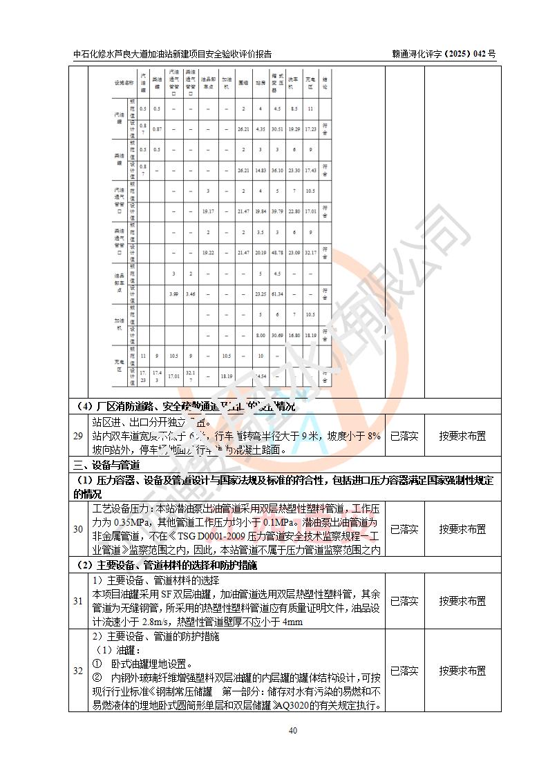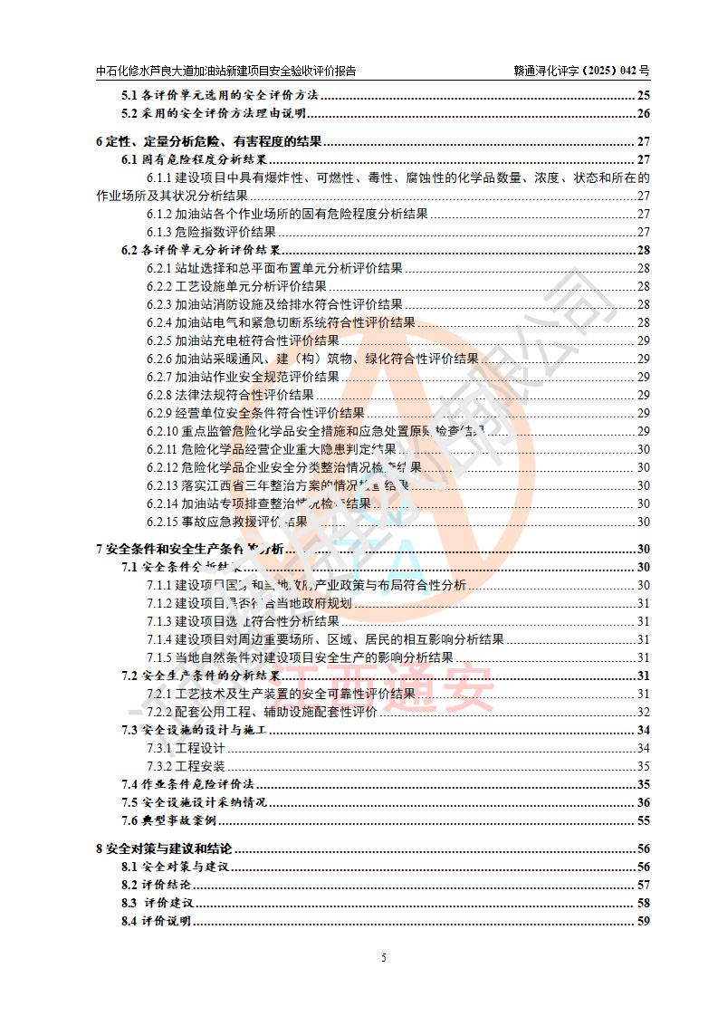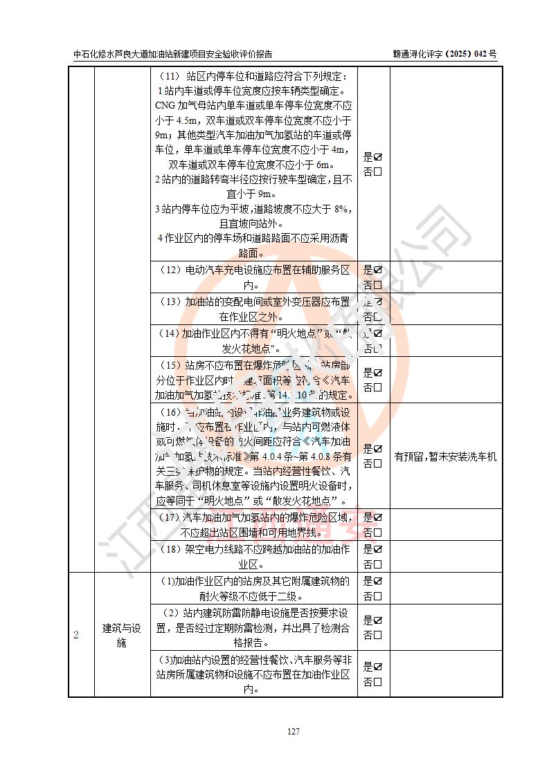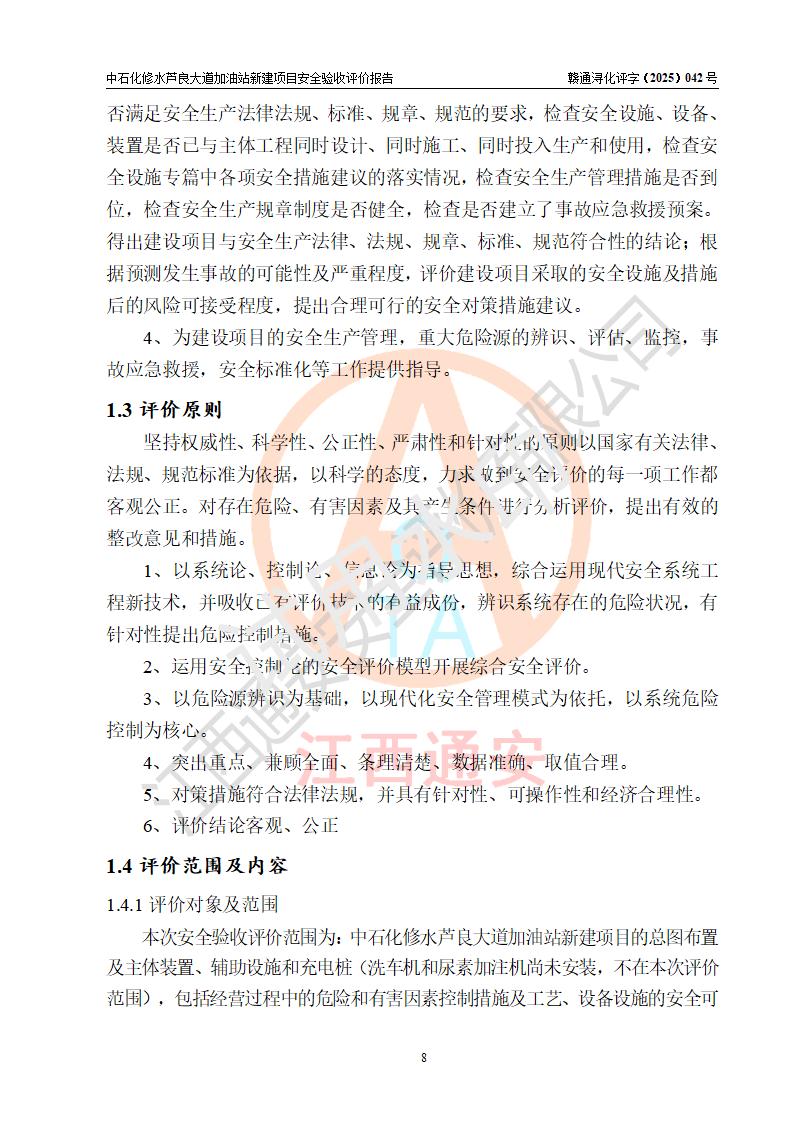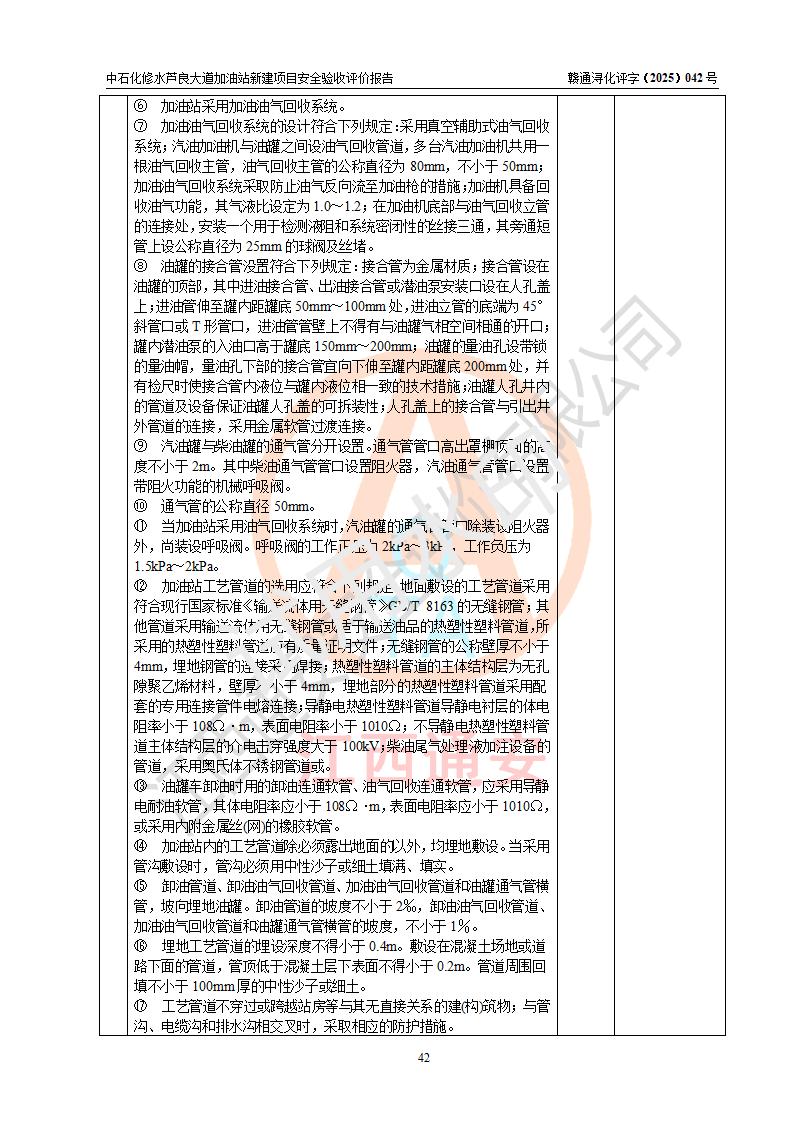 评价结论 | 中国石化销售股份有限公司江西九江修水石油分公司芦良大道加油站新建项目涉及的安全条件、安全生产条件、安全生产管理符合《危险化学品经营许可证管理办法》、《汽车加油加气加氢站技术标准》等**有关法规、标准、规范要求,能满足成品油零售经营单位的安全条件,具备项目竣工验收的条件。 | |||