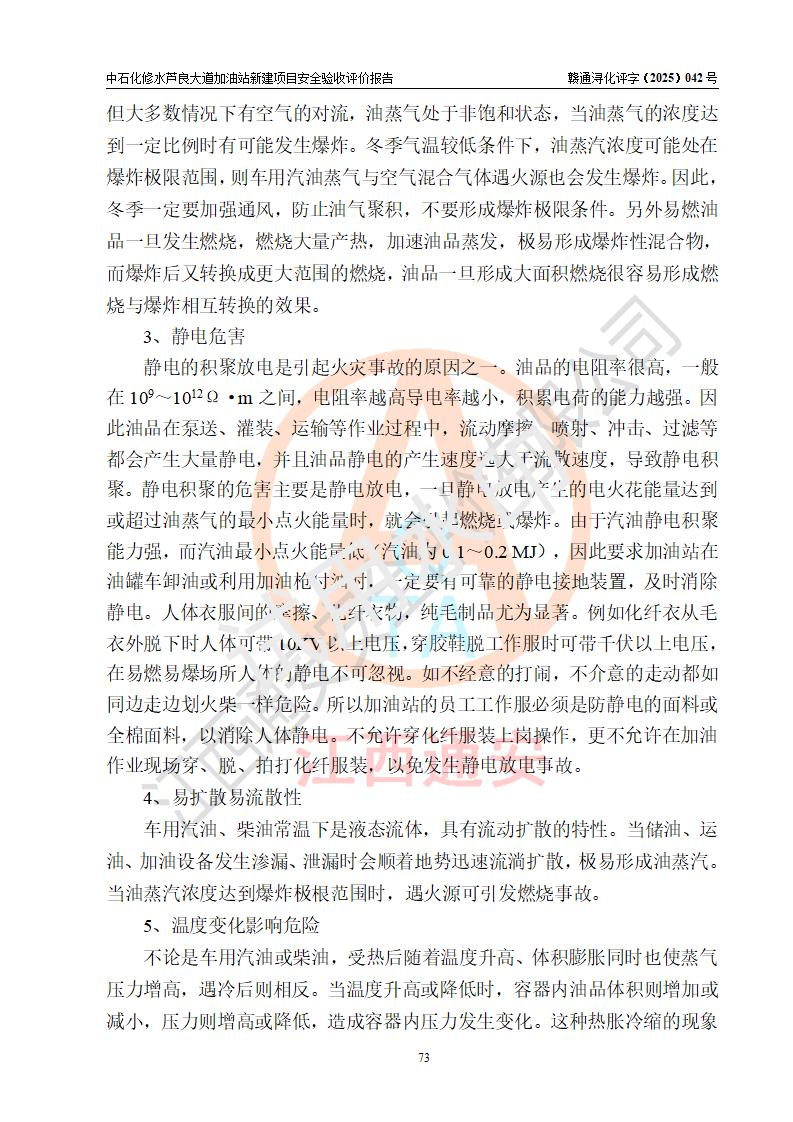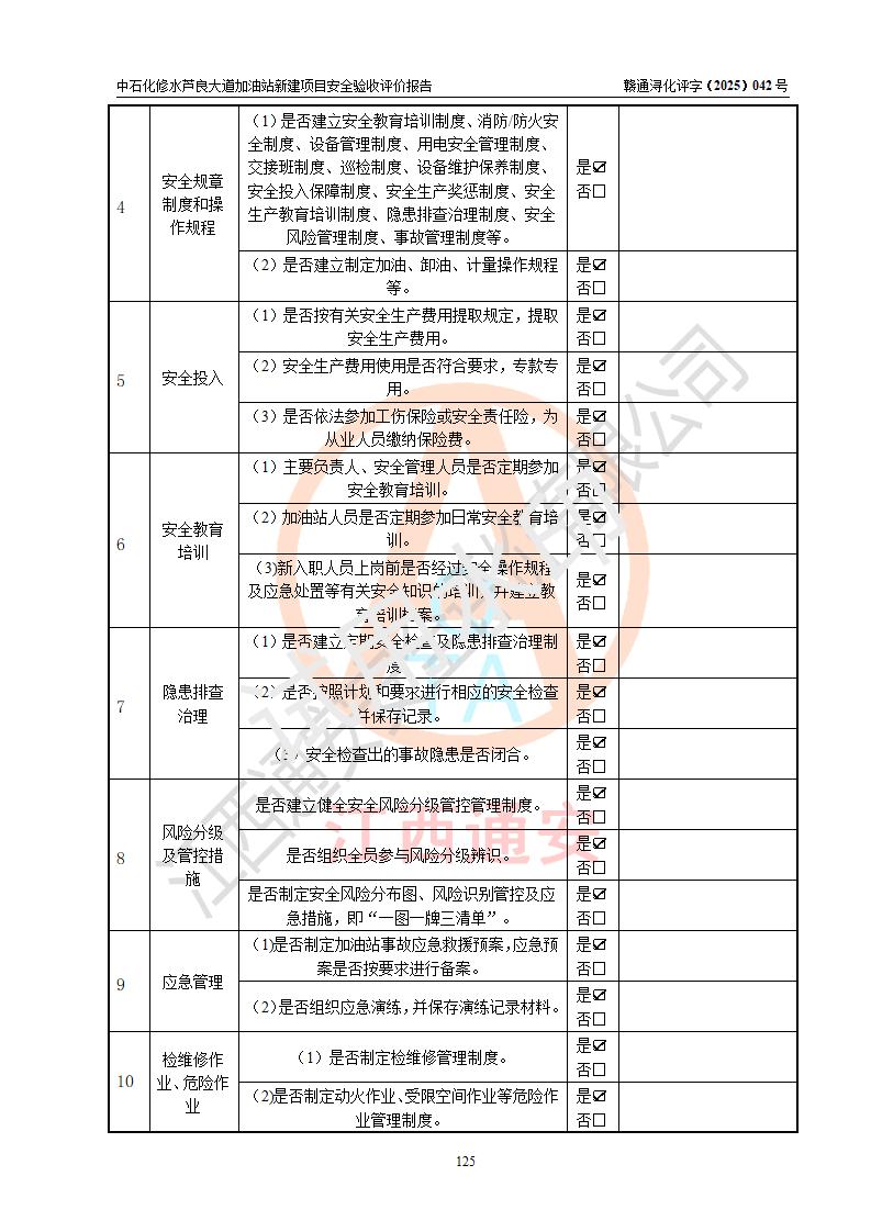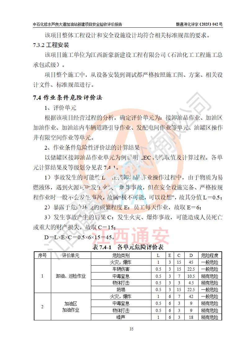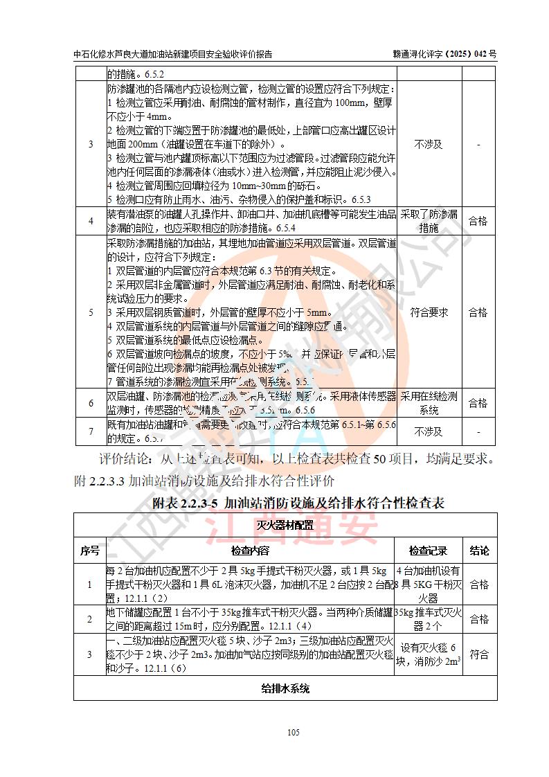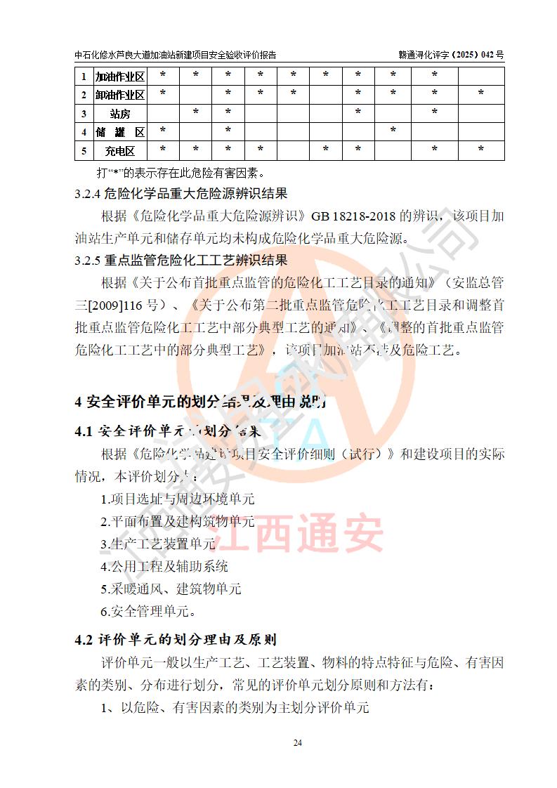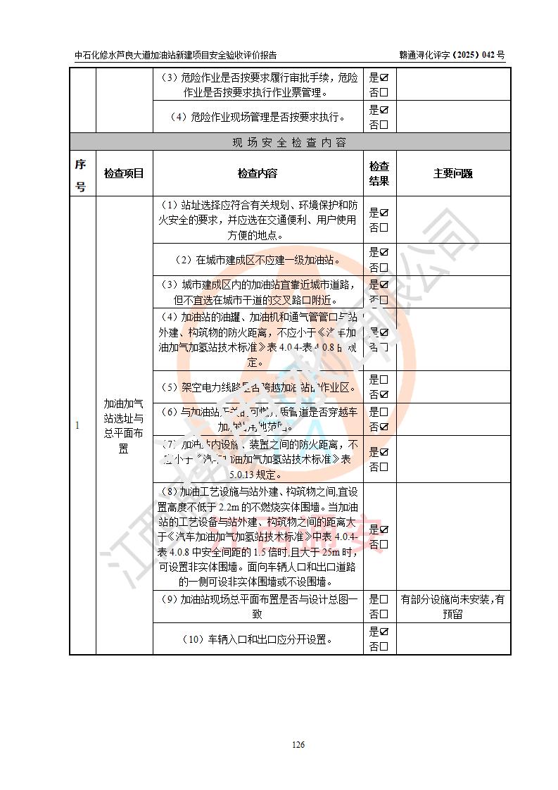 评价结论 | 中国石化销售股份有限公司江西九江修水石油分公司芦良大道加油站新建项目涉及的安全条件、安全生产条件、安全生产管理符合《危险化学品经营许可证管理办法》、《汽车加油加气加氢站技术标准》等**有关法规、标准、规范要求,能满足成品油零售经营单位的安全条件,具备项目竣工验收的条件。 | |||