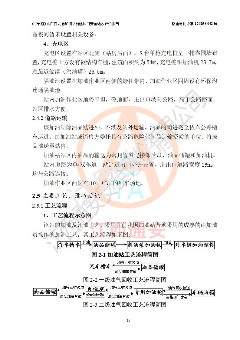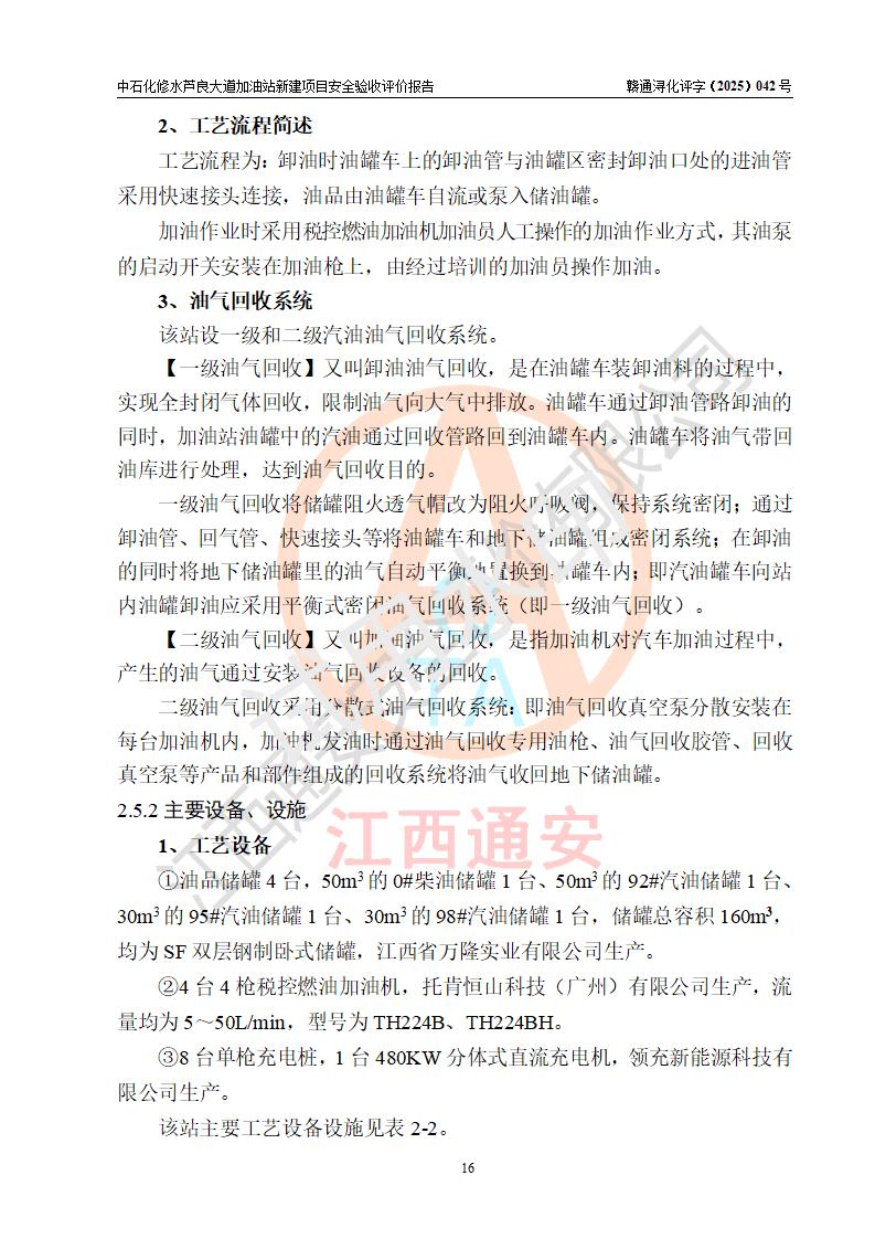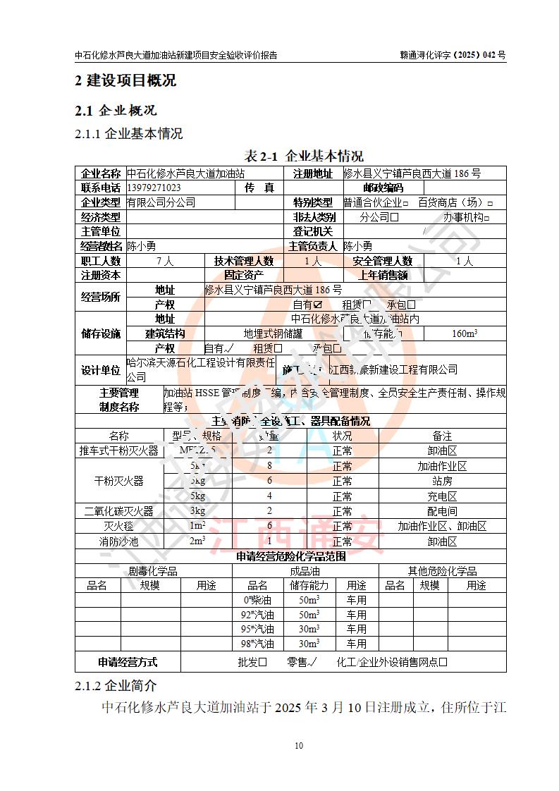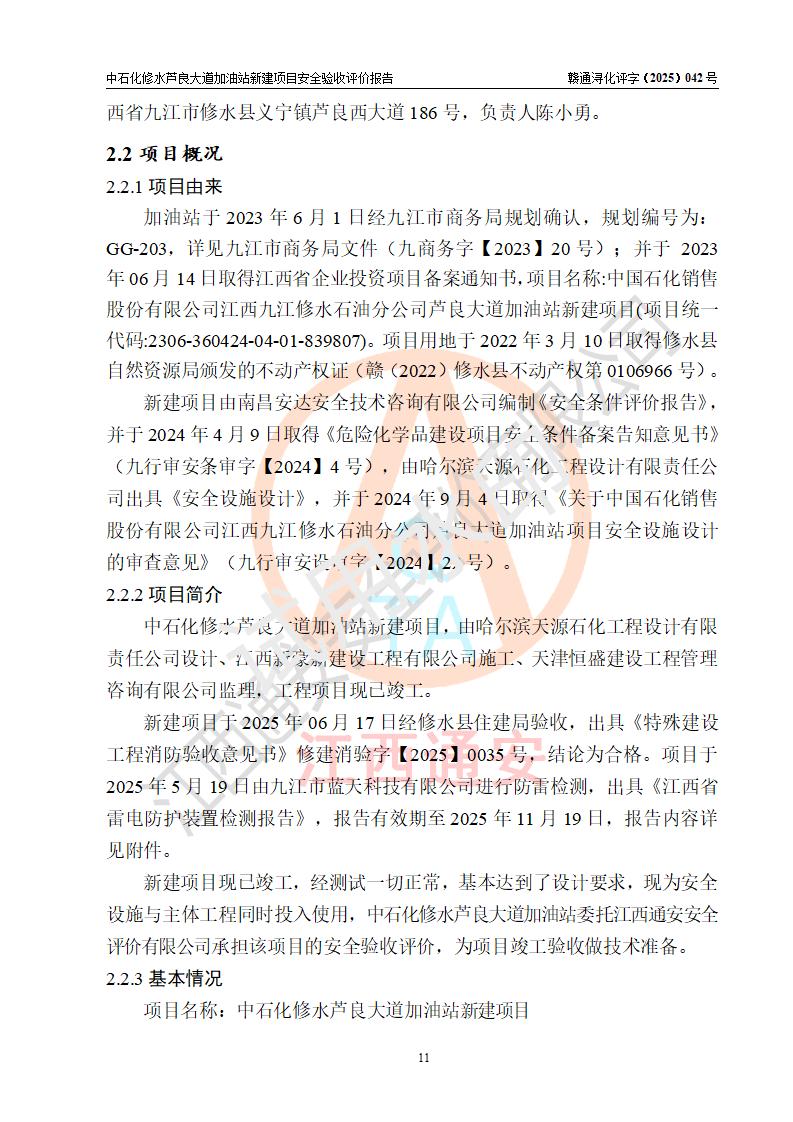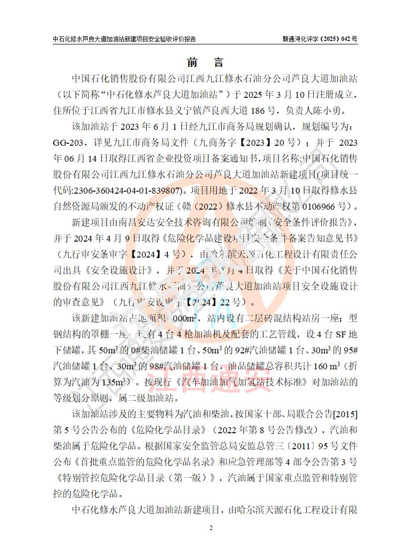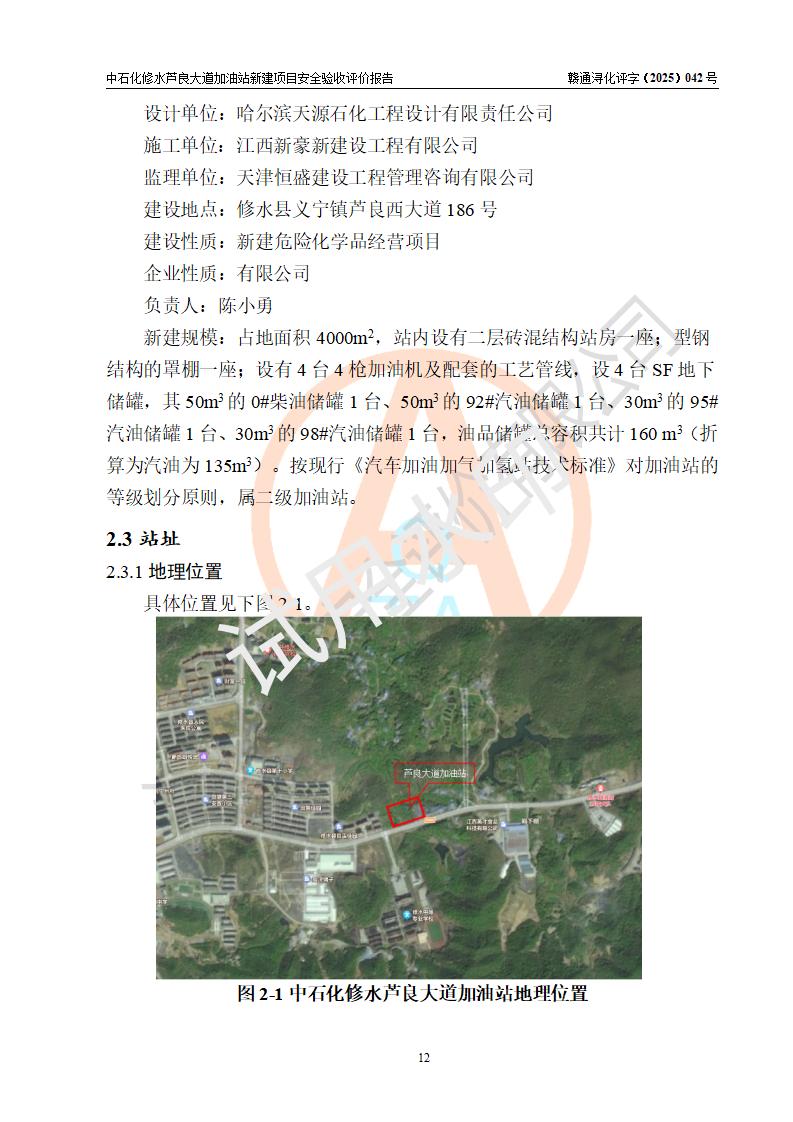 项目简介 | 中国石化销售股份有限公司江西九江修水石油分公司芦良大道加油站于2025年3月10日注册成立,住所位于江西省九江市修水县义宁镇芦良西大道186号,负责人陈小勇。 该加油站于2023年6月1日经九江市商务局规划确认,规划编号为:GG-203,详见九江市商务局文件(九商务字【2023】20号);并于 2023年06月14日取得江西省企业投资项目备案通知书,项目名称:中国石化销售股份有限公司江西九江修水石油分公司芦良大道加油站新建项目(项目统一代码:2306-360424-04-01-839807)。项目用地于2022年3月10日取得修水县自然资源局颁发的不动产权证(赣(2022)修水县不动产权第0106966号)。 新建项目由南昌安达安全技术咨询有限公司编制《安全条件评价报告》,并于2024年4月9日取得《危险化学品建设项目安全条件备案告知意见书》(九行审安条审字【2024】4号),由哈尔滨天源石化工程设计有限责任公司出具《安全设施设计》,并于2024年9月4日取得《关于中国石化销售股份有限公司江西九江修水石油分公司芦良大道加油站项目安全设施设计的审查意见》(九行审安设审字【2024】22号)。 该新建加油站占地面积4000m2,站内设有二层砖混结构站房一座;型钢结构的罩棚一座;设有4台4枪加油机及配套的工艺管线,设4台SF地下储罐,其50m3的0#柴油储罐1台、50m3的92#汽油储罐1台、30m3的95#汽油储罐1台、30m3的98#汽油储罐1台,油品储罐总容积共计160 m3(折算为汽油为135m3)。按现行《汽车加油加气加氢站技术标准》对加油站的等级划分原则,属二级加油站。 | |||