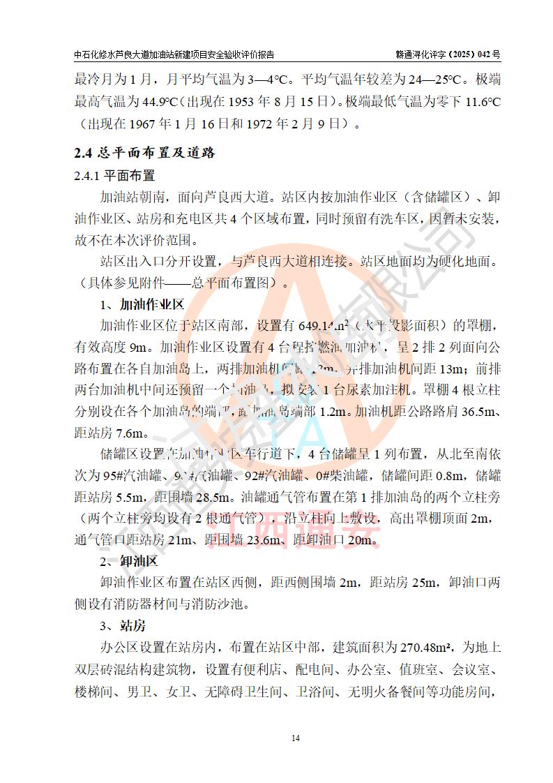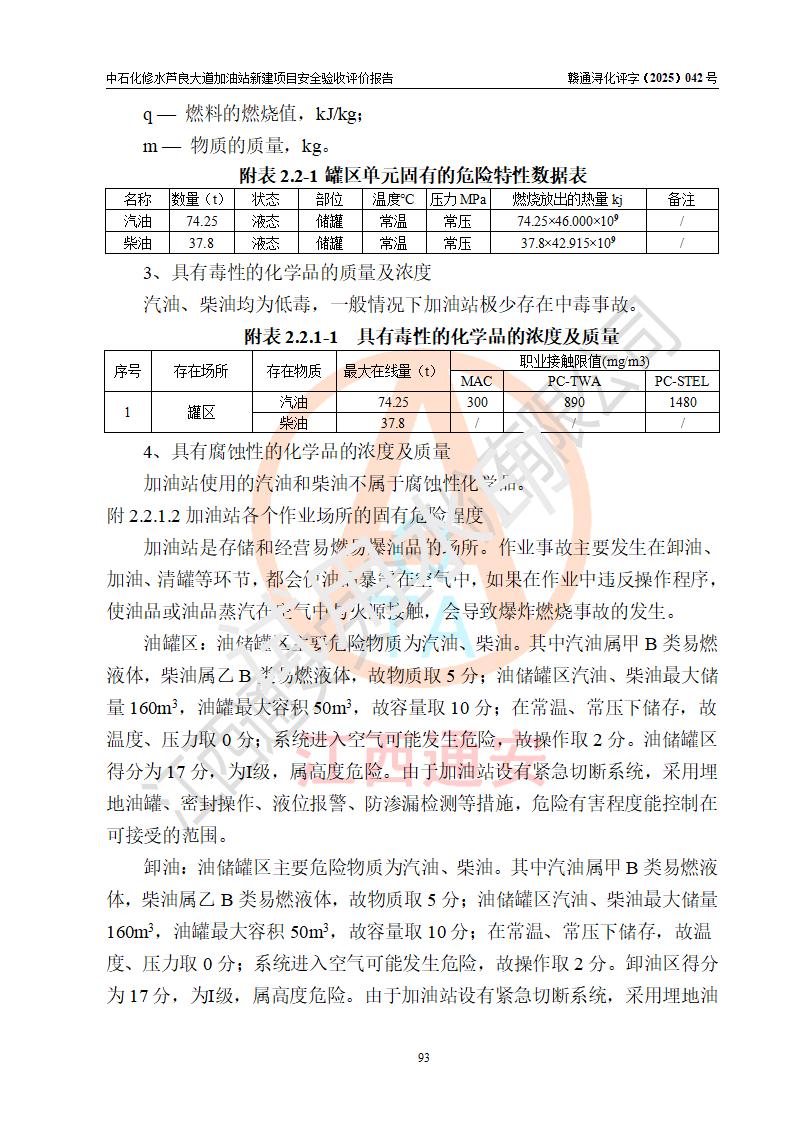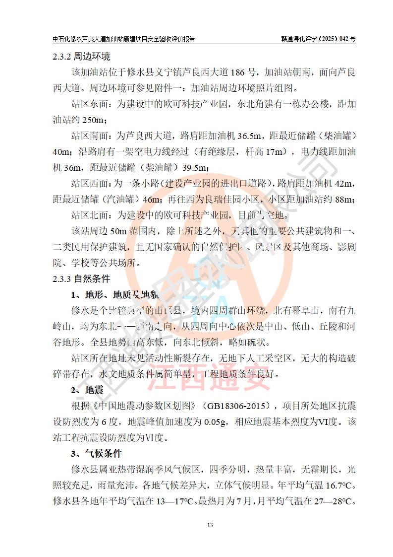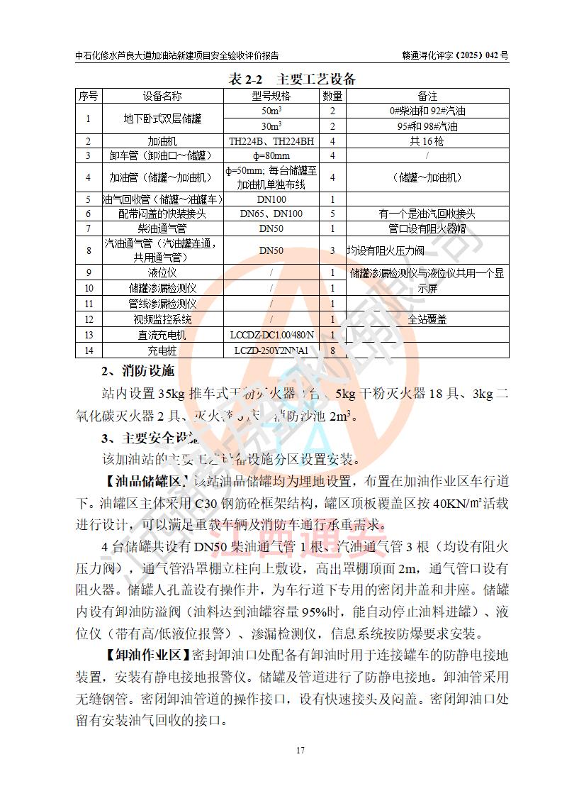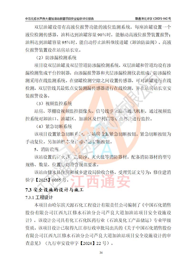 项目简介 | 中国石化销售股份有限公司江西九江修水石油分公司芦良大道加油站于2025年3月10日注册成立,住所位于江西省九江市修水县义宁镇芦良西大道186号,负责人陈小勇。 该加油站于2023年6月1日经九江市商务局规划确认,规划编号为:GG-203,详见九江市商务局文件(九商务字【2023】20号);并于 2023年06月14日取得江西省企业投资项目备案通知书,项目名称:中国石化销售股份有限公司江西九江修水石油分公司芦良大道加油站新建项目(项目统一代码:2306-360424-04-01-839807)。项目用地于2022年3月10日取得修水县自然资源局颁发的不动产权证(赣(2022)修水县不动产权第0106966号)。 新建项目由南昌安达安全技术咨询有限公司编制《安全条件评价报告》,并于2024年4月9日取得《危险化学品建设项目安全条件备案告知意见书》(九行审安条审字【2024】4号),由哈尔滨天源石化工程设计有限责任公司出具《安全设施设计》,并于2024年9月4日取得《关于中国石化销售股份有限公司江西九江修水石油分公司芦良大道加油站项目安全设施设计的审查意见》(九行审安设审字【2024】22号)。 该新建加油站占地面积4000m2,站内设有二层砖混结构站房一座;型钢结构的罩棚一座;设有4台4枪加油机及配套的工艺管线,设4台SF地下储罐,其50m3的0#柴油储罐1台、50m3的92#汽油储罐1台、30m3的95#汽油储罐1台、30m3的98#汽油储罐1台,油品储罐总容积共计160 m3(折算为汽油为135m3)。按现行《汽车加油加气加氢站技术标准》对加油站的等级划分原则,属二级加油站。 | |||