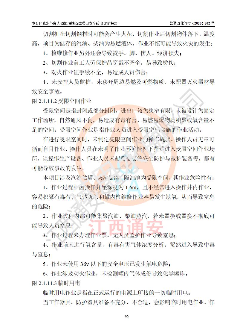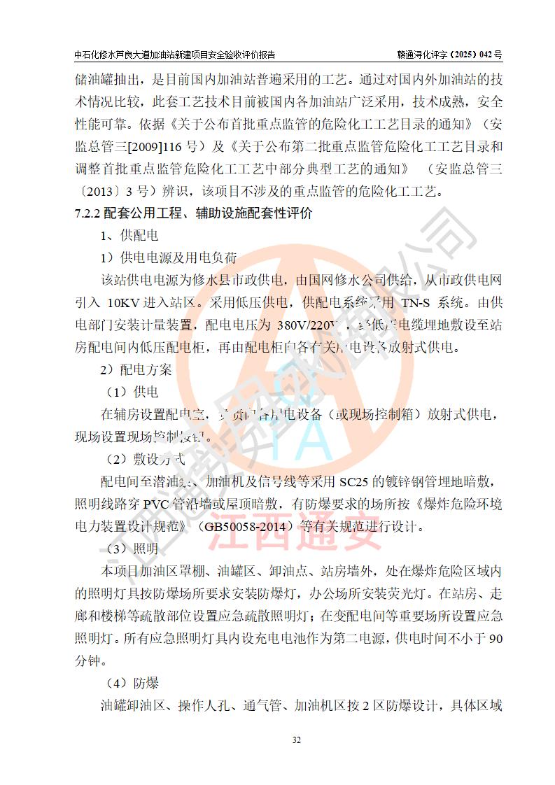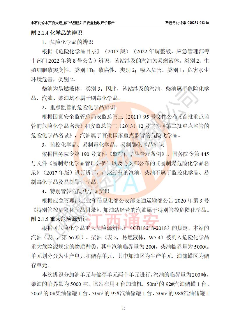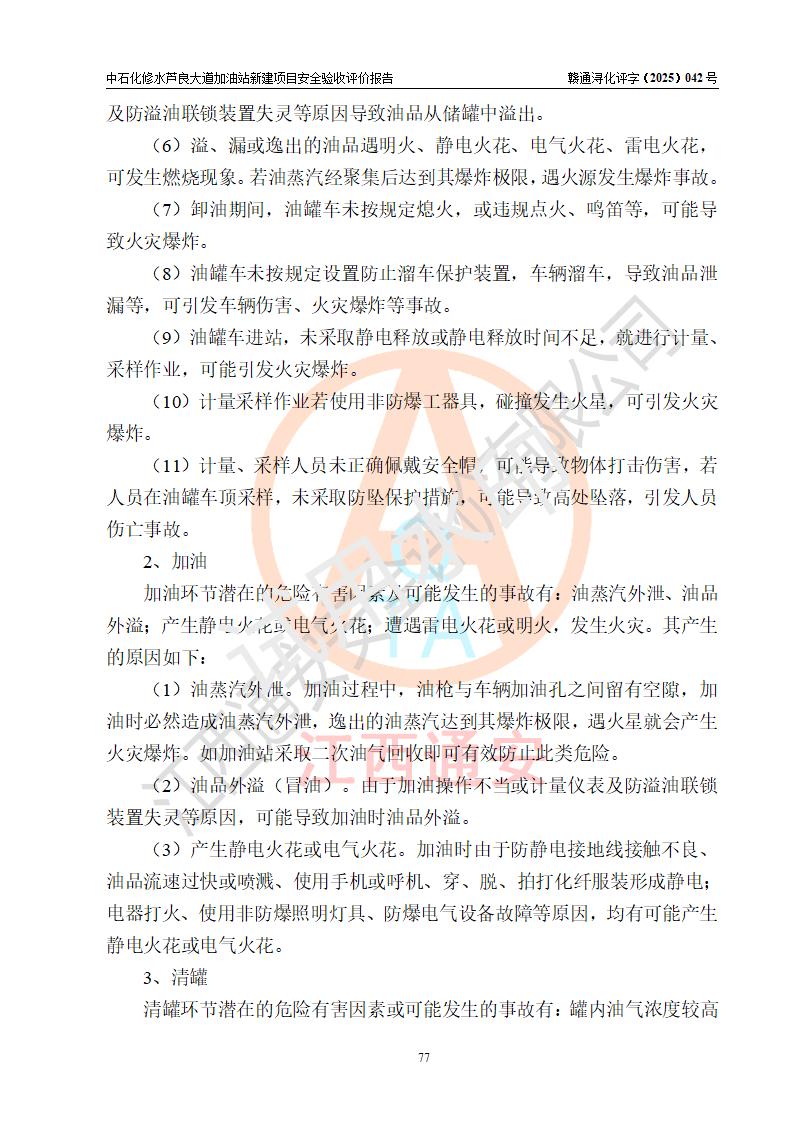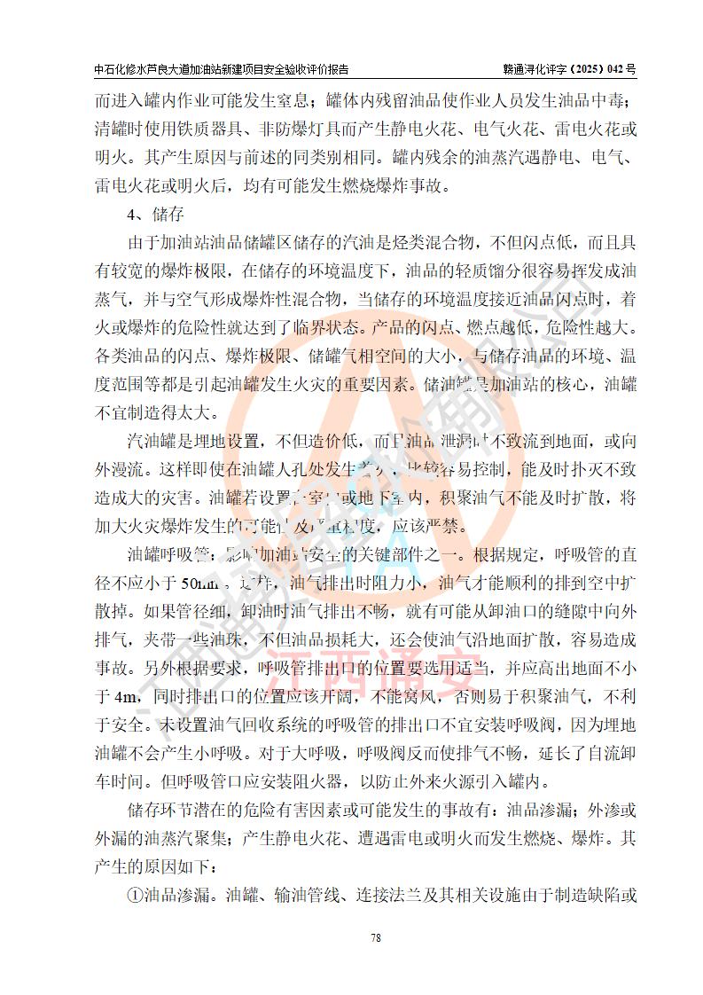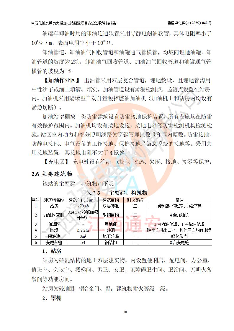 项目简介 | 中国石化销售股份有限公司江西九江修水石油分公司芦良大道加油站于2025年3月10日注册成立,住所位于江西省九江市修水县义宁镇芦良西大道186号,负责人陈小勇。 该加油站于2023年6月1日经九江市商务局规划确认,规划编号为:GG-203,详见九江市商务局文件(九商务字【2023】20号);并于 2023年06月14日取得江西省企业投资项目备案通知书,项目名称:中国石化销售股份有限公司江西九江修水石油分公司芦良大道加油站新建项目(项目统一代码:2306-360424-04-01-839807)。项目用地于2022年3月10日取得修水县自然资源局颁发的不动产权证(赣(2022)修水县不动产权第0106966号)。 新建项目由南昌安达安全技术咨询有限公司编制《安全条件评价报告》,并于2024年4月9日取得《危险化学品建设项目安全条件备案告知意见书》(九行审安条审字【2024】4号),由哈尔滨天源石化工程设计有限责任公司出具《安全设施设计》,并于2024年9月4日取得《关于中国石化销售股份有限公司江西九江修水石油分公司芦良大道加油站项目安全设施设计的审查意见》(九行审安设审字【2024】22号)。 该新建加油站占地面积4000m2,站内设有二层砖混结构站房一座;型钢结构的罩棚一座;设有4台4枪加油机及配套的工艺管线,设4台SF地下储罐,其50m3的0#柴油储罐1台、50m3的92#汽油储罐1台、30m3的95#汽油储罐1台、30m3的98#汽油储罐1台,油品储罐总容积共计160 m3(折算为汽油为135m3)。按现行《汽车加油加气加氢站技术标准》对加油站的等级划分原则,属二级加油站。 | |||