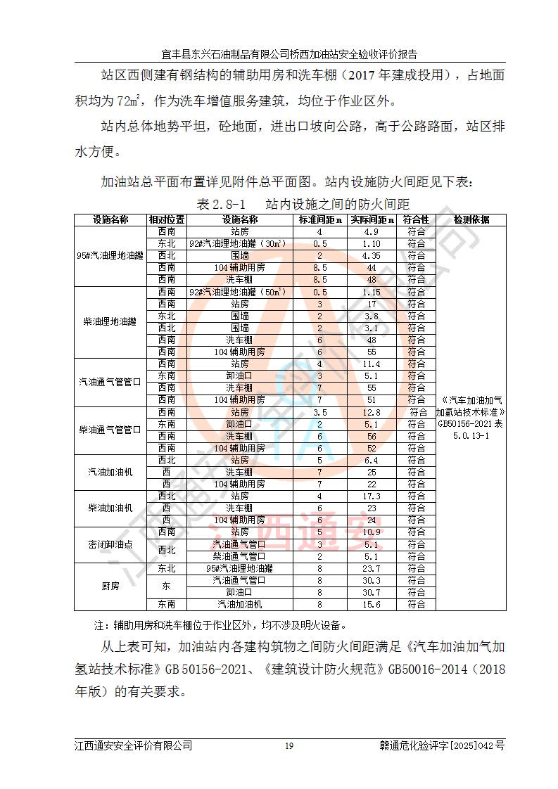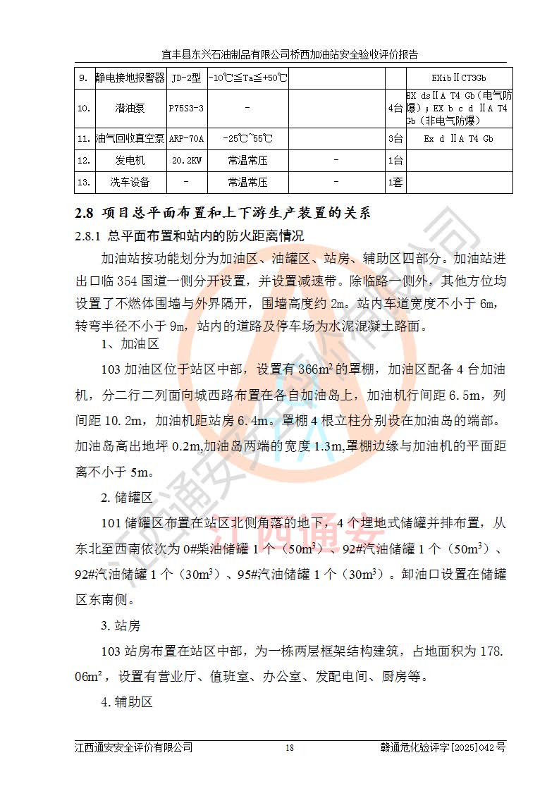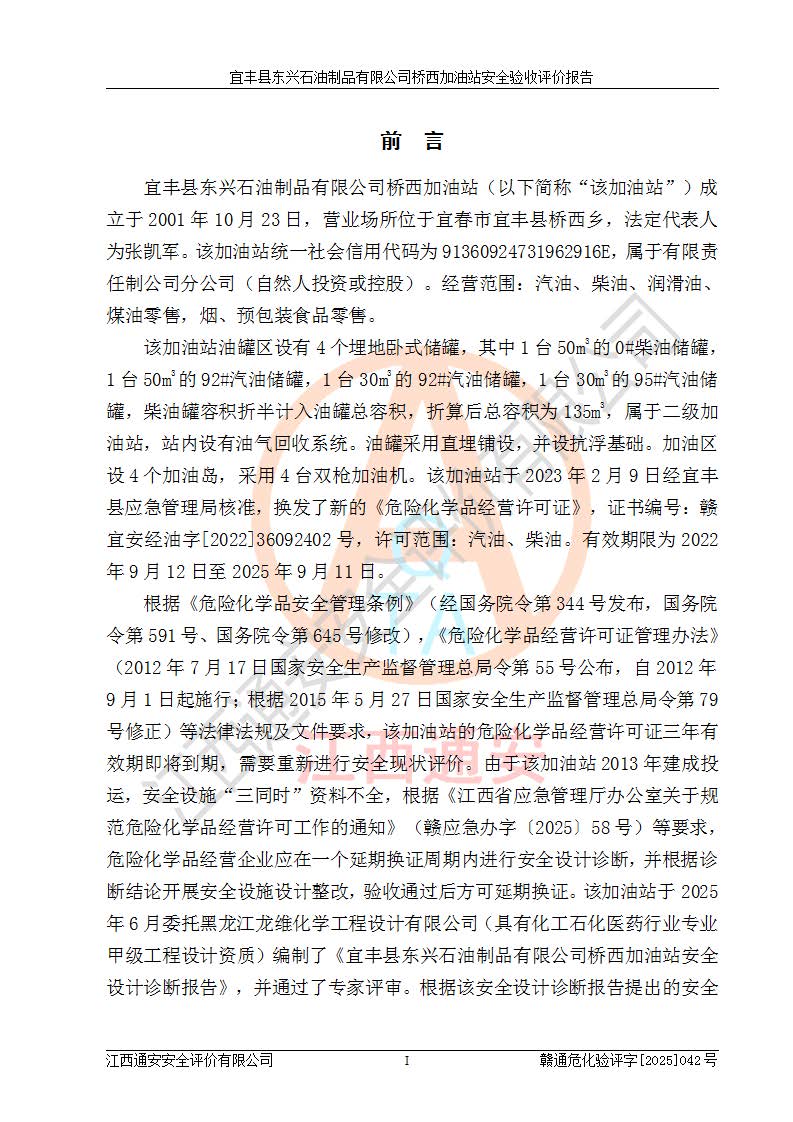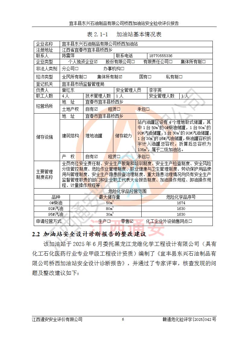 项目简介 | 宜丰县东兴石油制品有限公司桥西加油站(以下简称“该加油站”)成立于2001年10月23日,营业场所位于宜春市宜丰县桥西乡,法定**人为张凯军。该加油站统一社会信用代码为91360924731962916E,属于有限责任制公司分公司(自然人投资或控股)。经营范围:汽油、柴油、润滑油、煤油零售,烟、预包装食品零售。 该加油站油罐区设有4个埋地卧式储罐,其中1台50m3的0#柴油储罐,1台50m3的92#汽油储罐,1台30m3的92#汽油储罐,1台30m3的95#汽油储罐,柴油罐容积折半计入油罐总容积,折算后总容积为135m3,属于二级加油站,站内设有油气回收系统。油罐采用直埋铺设,并设抗浮基础。加油区设4个加油岛,采用4台双枪加油机。该加油站于2023年2月9日经宜丰县应急管理局核准,换发了新的《危险化学品经营许可证》,证书编号:赣宜安经油字[2022]36092402号,许可范围:汽油、柴油。**期限为2022年9月12日至2025年9月11日。 根据《危险化学品安全管理条例》(经***令第344号发布,***令第591号、***令第645号修改),《危险化学品经营许可证管理办法》(2012年7月17日**安全生产监督管理总局令第55号公布,自2012年9月1日起施行;根据2015年5月27日**安全生产监督管理总局令第79号修正)等法律法规及文件要求,该加油站的危险化学品经营许可证三年**期即将到期,需要重新进行安全现状评价。由于该加油站2013年建成投运,安全设施“三同时”资料不全,根据《江西省应急管理厅办公室关于规范危险化学品经营许可工作的通知》(赣应急办字〔2025〕58号)等要求,危险化学品经营企业应在一个延期换证周期内进行安全设计诊断,并根据诊断结论开展安全设施设计整改,验收通过后方可延期换证。该加油站于2025年6月委托黑龙江龙维化学工程设计有限公司(具有化工石化医药行业专业**工程设计资质)编制了《宜丰县东兴石油制品有限公司桥西加油站安全设计诊断报告》,并通过了专家评审。根据该安全设计诊断报告提出的安全隐患及整改建议,该加油站及时进行了整改,目前已整改到位,具备安全设施验收条件。
