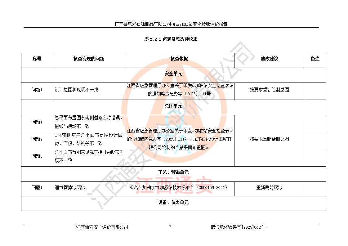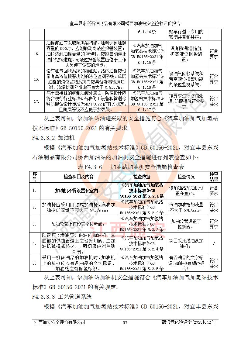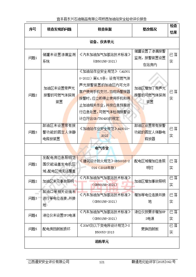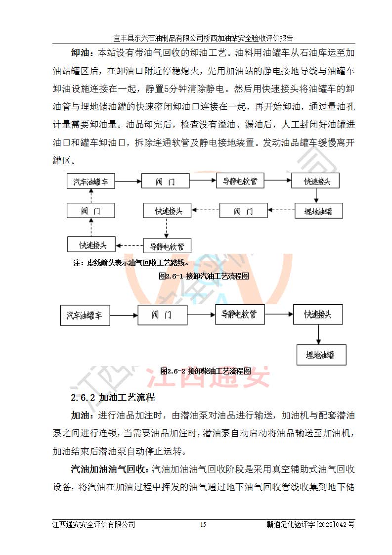 项目简介 | 宜丰县东兴石油制品有限公司桥西加油站(以下简称“该加油站”)成立于2001年10月23日,营业场所位于宜春市宜丰县桥西乡,法定**人为张凯军。该加油站统一社会信用代码为91360924731962916E,属于有限责任制公司分公司(自然人投资或控股)。经营范围:汽油、柴油、润滑油、煤油零售,烟、预包装食品零售。 该加油站油罐区设有4个埋地卧式储罐,其中1台50m3的0#柴油储罐,1台50m3的92#汽油储罐,1台30m3的92#汽油储罐,1台30m3的95#汽油储罐,柴油罐容积折半计入油罐总容积,折算后总容积为135m3,属于二级加油站,站内设有油气回收系统。油罐采用直埋铺设,并设抗浮基础。加油区设4个加油岛,采用4台双枪加油机。该加油站于2023年2月9日经宜丰县应急管理局核准,换发了新的《危险化学品经营许可证》,证书编号:赣宜安经油字[2022]36092402号,许可范围:汽油、柴油。**期限为2022年9月12日至2025年9月11日。 根据《危险化学品安全管理条例》(经***令第344号发布,***令第591号、***令第645号修改),《危险化学品经营许可证管理办法》(2012年7月17日**安全生产监督管理总局令第55号公布,自2012年9月1日起施行;根据2015年5月27日**安全生产监督管理总局令第79号修正)等法律法规及文件要求,该加油站的危险化学品经营许可证三年**期即将到期,需要重新进行安全现状评价。由于该加油站2013年建成投运,安全设施“三同时”资料不全,根据《江西省应急管理厅办公室关于规范危险化学品经营许可工作的通知》(赣应急办字〔2025〕58号)等要求,危险化学品经营企业应在一个延期换证周期内进行安全设计诊断,并根据诊断结论开展安全设施设计整改,验收通过后方可延期换证。该加油站于2025年6月委托黑龙江龙维化学工程设计有限公司(具有化工石化医药行业专业**工程设计资质)编制了《宜丰县东兴石油制品有限公司桥西加油站安全设计诊断报告》,并通过了专家评审。根据该安全设计诊断报告提出的安全隐患及整改建议,该加油站及时进行了整改,目前已整改到位,具备安全设施验收条件。