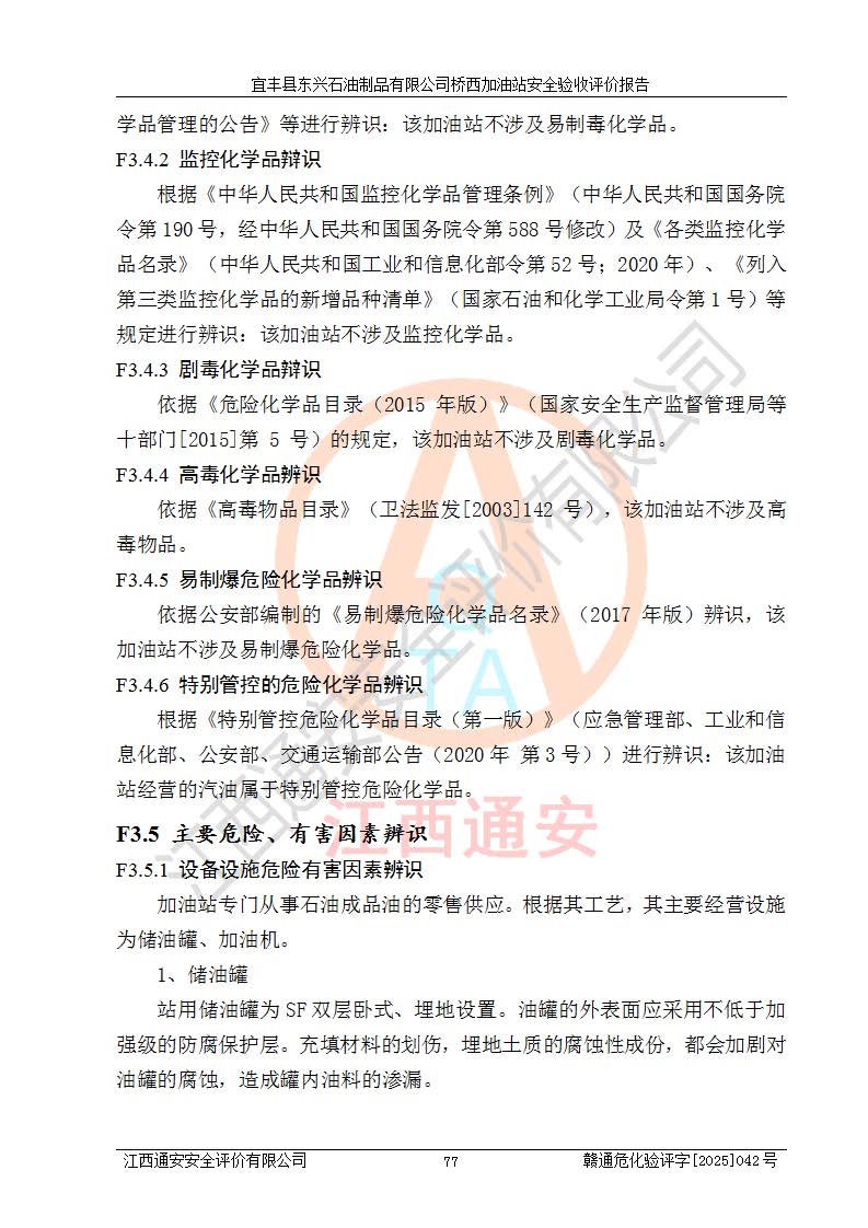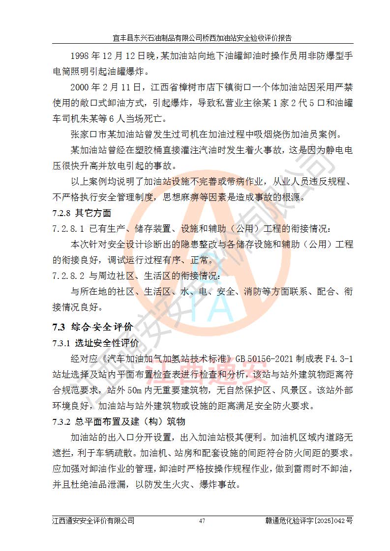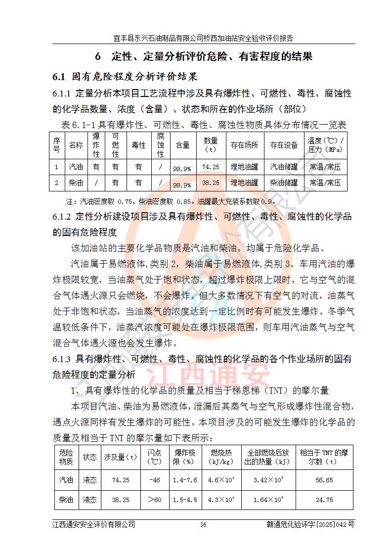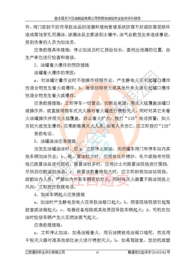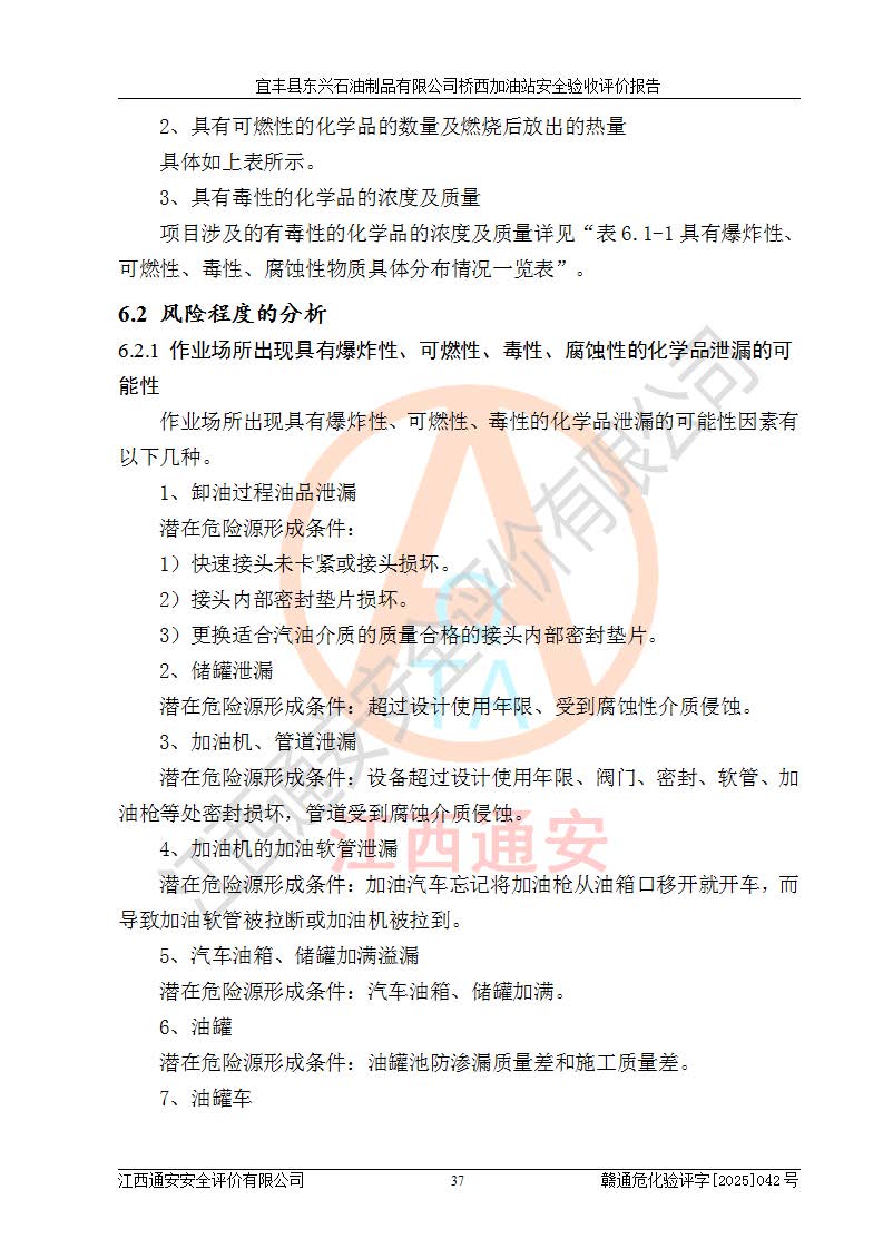 其它 | 一、安全状况综合评述 宜丰县东兴石油制品有限公司桥西加油站位于宜春市宜丰县桥西乡,从事成品油(汽油、柴油)零售业务,属二级加油站。 通过对该加油站建设项目安全验收评价,得出以下评价结论: 化学品、设备及工艺辨识结果 经辨识,该加油站经营、储存危险化学品为汽油和柴油,其中汽油属于重点监管危险化学品、特别管控危险化学品;该加油站不涉及剧毒化学品、高毒物品、易制毒化学品、监控化学品、易制爆化学品。经营、储存过程中采用的设备及工艺不属于淘汰落后设备及工艺、不涉及危险化工工艺,生产和储存单元均不构成危险化学品重大危险源。 建设项目所在地的安全条件和周边的安全间距 该站东南侧临354国道,北侧、西侧、东侧为居民建筑,加油站为二级加油站,设有油气回收系统,站外50米范围内无重要公共建筑物、明火设备和甲、乙类生产及储存设施,站区内加油设施与周边建构筑物之间的距离能够满足《汽车加油加气加氢站技术标准》GB50156-2021 和《建筑设计防火规范》GB50016-2014(2018 年版)以及相关**规范要求。本报告认为该加油站建设项目周边对加油站的影响以及建设项目所在地的自然条件对建设项目投入使用后的影响均较小,该加油站具备标准规范所要求的安全条件。 该项目安全设计诊断报告的采纳情况 该加油站安全设计诊断报告核查的问题(共15项)及整改建议均已采纳,经评价组现场复核,均已整改完成。 该项目调试中表现出的技术、工艺和装置、设备(设施)的安全、 可靠性和安全水平。 该加油站整改过程工作进展顺利,处于正常状态。经查阅资料和分析评价,认为本项目技术、工艺和装置、设备(设施)的安全、可靠性和安全水平符合**相应安全标准的要求。 该加油站储存经营的汽油属于重点监管的危险化学品和特别管控危险化学品,该加油站在后续的经营中应按照相关规范和要求加强安全管理,要求油品运输单位强化运输管理、自身加强储存定制化管理。 该加油站经营过程中存在的危险有害因素为:①火灾、爆炸;② 中毒和窒息;③**伤害;④触电;⑤高处坠落;⑥物体打击、⑦其他伤害。 其中火灾、爆炸是主要的危险、有害因素,加油站埋地储罐区、加油区、卸 油区是主要的危险源。 (7)经采用作业条件危险性评价法(LEC)进行分析,该加油站的作业条件相对比较安全。在选定的加油作业、卸油作业、维修作业、配电作业等4个单元中均为“一般危险、需要注意”作业环境,且一般危险作业环境的出现均由物料的危险程度所决定,作业条件相对安全。 (8)采用危险度评价法分析,油罐区主要危险物质为汽油和柴油,常温、常压下储存。储罐区汽油罐为Ⅰ级,属**危险;柴油罐得分为为Ⅲ级,属低度危险。油罐采用双层罐埋地设置,按要求设置了通气管,并装设了阻火器;设置了液位监测报警系统和紧急切断系统,埋地加油管道设置双层管道,其安全风险可控。 (9)采用检查表评价法对该加油站站址选择、总平面布置、加油工艺及设施、消防设施和给排水、电气与报警和紧急切断系统等进行检查分析,经整改后,该加油站涉及的强制条款和其他项均符合要求。该加油站设置了消防安全设施、防雷防静电设施、液位监测措施、油罐泄漏检测措施、电气防爆措施等安全防护设施,取得了消防验收意见书和防雷检测合格报告,符合**法律法规、标准规范的要求。该加油站公用工程能够满足安全经营的基本需要,符合安全经营的条件。 (10)该加油站相关证照齐全,成立了安全生产**小组,配备了安全管理人员,制定了安全管理制度、操作规程和事故应急预案,加油站的安全管理机构工作有力,加油站安全经营管理处于正常有序开展范围。 (11)对宜丰县东兴石油制品有限公司桥西加油站存在重大生产安全事故隐患进行判定,检查结果为该加油站不存在重大生产安全事故隐患。 总体评价结论:宜丰县东兴石油制品有限公司桥西加油站认真落实并合理采纳安全设计诊断报告中的安全对策、措施及建议,现场与安全设施设计单位重新绘制的现状总平面布置图一致,安全设计诊断报告提出的安全对策措施已落实到位。对潜在的危险、 有害因素采取了安全对策措施,工程潜在的危险、有害因素可得到**控制, 风险在**控制和可接受范围内。
