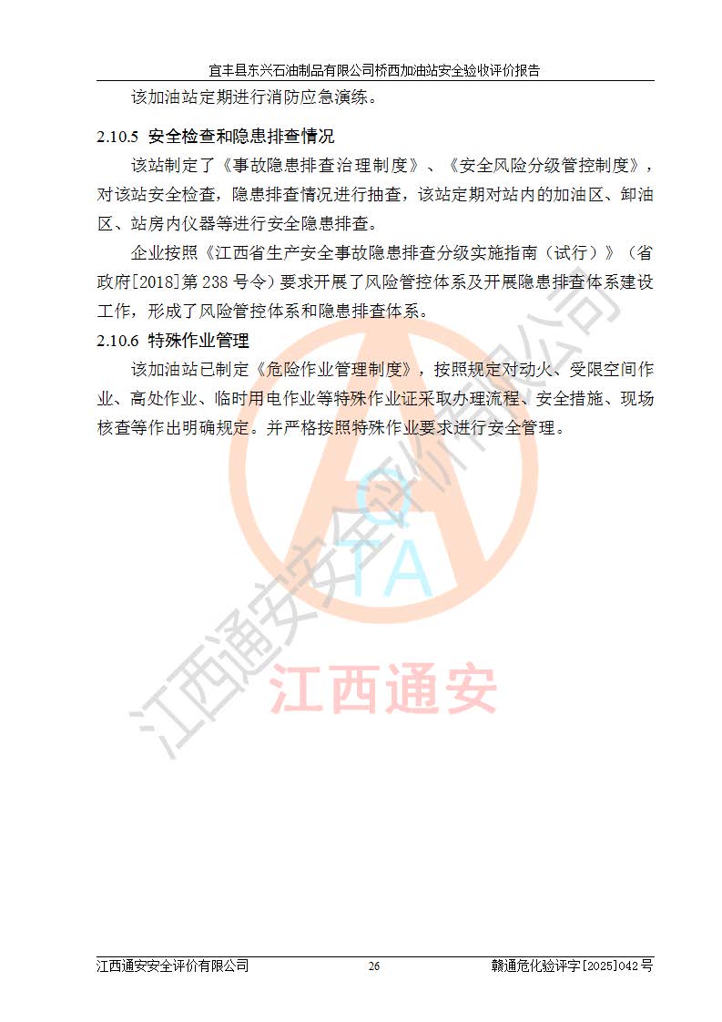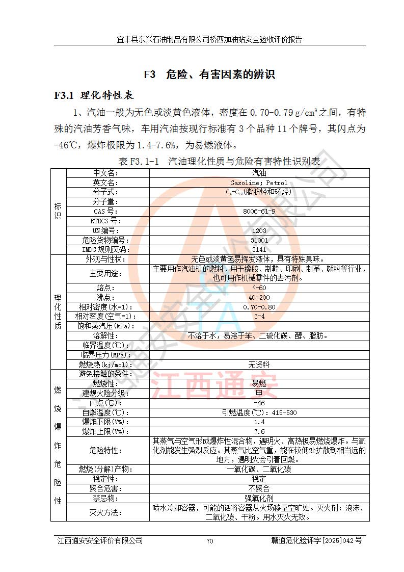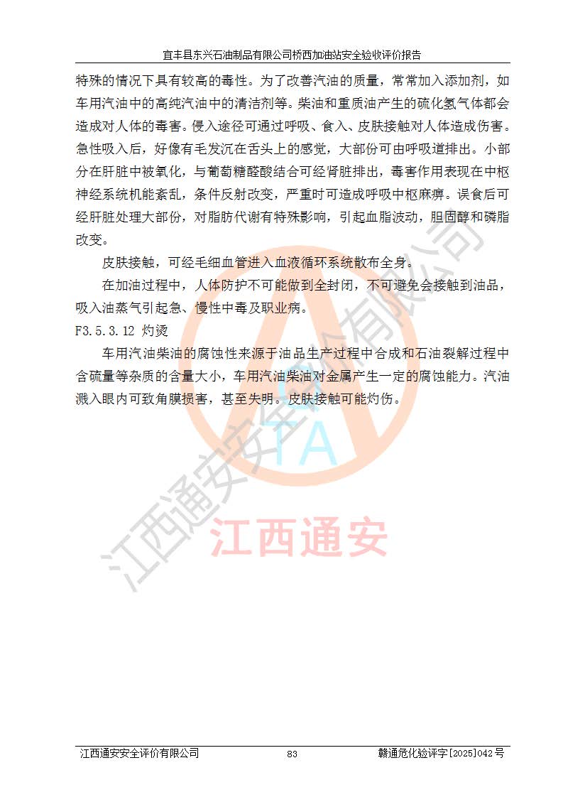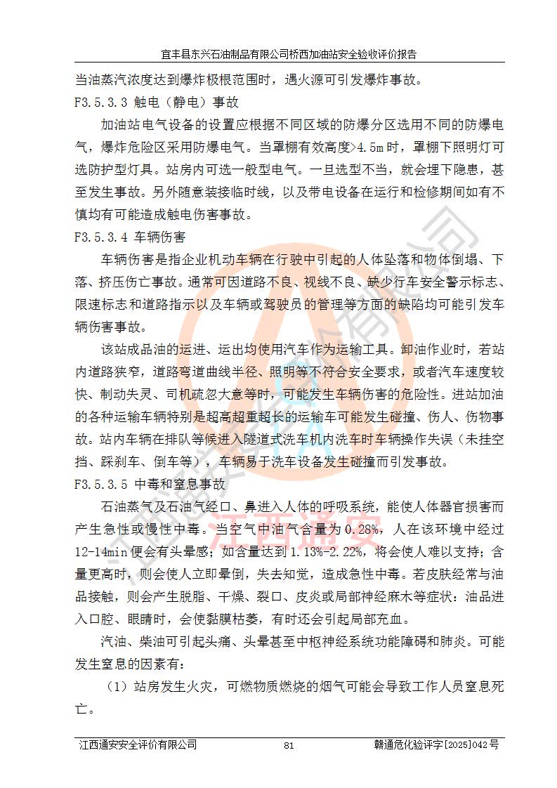 其它 | 一、安全状况综合评述 宜丰县东兴石油制品有限公司桥西加油站位于宜春市宜丰县桥西乡,从事成品油(汽油、柴油)零售业务,属二级加油站。 通过对该加油站建设项目安全验收评价,得出以下评价结论: 化学品、设备及工艺辨识结果 经辨识,该加油站经营、储存危险化学品为汽油和柴油,其中汽油属于重点监管危险化学品、特别管控危险化学品;该加油站不涉及剧毒化学品、高毒物品、易制毒化学品、监控化学品、易制爆化学品。经营、储存过程中采用的设备及工艺不属于淘汰落后设备及工艺、不涉及危险化工工艺,生产和储存单元均不构成危险化学品重大危险源。 建设项目所在地的安全条件和周边的安全间距 该站东南侧临354国道,北侧、西侧、东侧为居民建筑,加油站为二级加油站,设有油气回收系统,站外50米范围内无重要公共建筑物、明火设备和甲、乙类生产及储存设施,站区内加油设施与周边建构筑物之间的距离能够满足《汽车加油加气加氢站技术标准》GB50156-2021 和《建筑设计防火规范》GB50016-2014(2018 年版)以及相关**规范要求。本报告认为该加油站建设项目周边对加油站的影响以及建设项目所在地的自然条件对建设项目投入使用后的影响均较小,该加油站具备标准规范所要求的安全条件。 该项目安全设计诊断报告的采纳情况 该加油站安全设计诊断报告核查的问题(共15项)及整改建议均已采纳,经评价组现场复核,均已整改完成。 该项目调试中表现出的技术、工艺和装置、设备(设施)的安全、 可靠性和安全水平。 该加油站整改过程工作进展顺利,处于正常状态。经查阅资料和分析评价,认为本项目技术、工艺和装置、设备(设施)的安全、可靠性和安全水平符合**相应安全标准的要求。 该加油站储存经营的汽油属于重点监管的危险化学品和特别管控危险化学品,该加油站在后续的经营中应按照相关规范和要求加强安全管理,要求油品运输单位强化运输管理、自身加强储存定制化管理。 该加油站经营过程中存在的危险有害因素为:①火灾、爆炸;② 中毒和窒息;③**伤害;④触电;⑤高处坠落;⑥物体打击、⑦其他伤害。 其中火灾、爆炸是主要的危险、有害因素,加油站埋地储罐区、加油区、卸 油区是主要的危险源。 (7)经采用作业条件危险性评价法(LEC)进行分析,该加油站的作业条件相对比较安全。在选定的加油作业、卸油作业、维修作业、配电作业等4个单元中均为“一般危险、需要注意”作业环境,且一般危险作业环境的出现均由物料的危险程度所决定,作业条件相对安全。 (8)采用危险度评价法分析,油罐区主要危险物质为汽油和柴油,常温、常压下储存。储罐区汽油罐为Ⅰ级,属**危险;柴油罐得分为为Ⅲ级,属低度危险。油罐采用双层罐埋地设置,按要求设置了通气管,并装设了阻火器;设置了液位监测报警系统和紧急切断系统,埋地加油管道设置双层管道,其安全风险可控。 (9)采用检查表评价法对该加油站站址选择、总平面布置、加油工艺及设施、消防设施和给排水、电气与报警和紧急切断系统等进行检查分析,经整改后,该加油站涉及的强制条款和其他项均符合要求。该加油站设置了消防安全设施、防雷防静电设施、液位监测措施、油罐泄漏检测措施、电气防爆措施等安全防护设施,取得了消防验收意见书和防雷检测合格报告,符合**法律法规、标准规范的要求。该加油站公用工程能够满足安全经营的基本需要,符合安全经营的条件。 (10)该加油站相关证照齐全,成立了安全生产**小组,配备了安全管理人员,制定了安全管理制度、操作规程和事故应急预案,加油站的安全管理机构工作有力,加油站安全经营管理处于正常有序开展范围。 (11)对宜丰县东兴石油制品有限公司桥西加油站存在重大生产安全事故隐患进行判定,检查结果为该加油站不存在重大生产安全事故隐患。 总体评价结论:宜丰县东兴石油制品有限公司桥西加油站认真落实并合理采纳安全设计诊断报告中的安全对策、措施及建议,现场与安全设施设计单位重新绘制的现状总平面布置图一致,安全设计诊断报告提出的安全对策措施已落实到位。对潜在的危险、 有害因素采取了安全对策措施,工程潜在的危险、有害因素可得到**控制, 风险在**控制和可接受范围内。