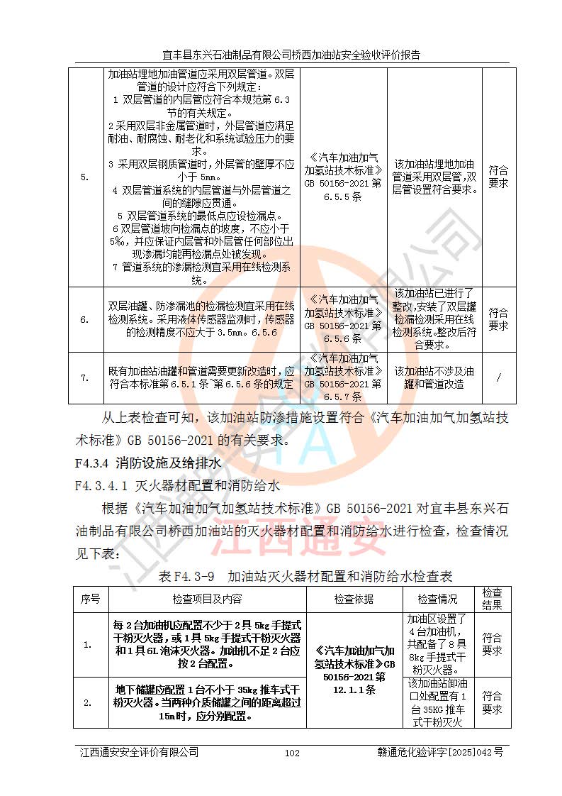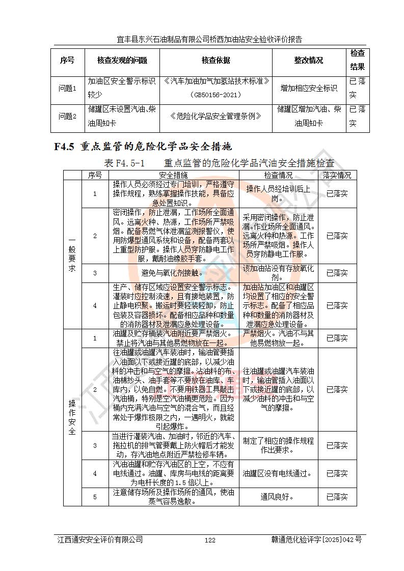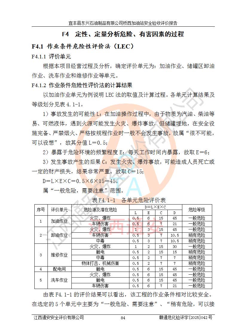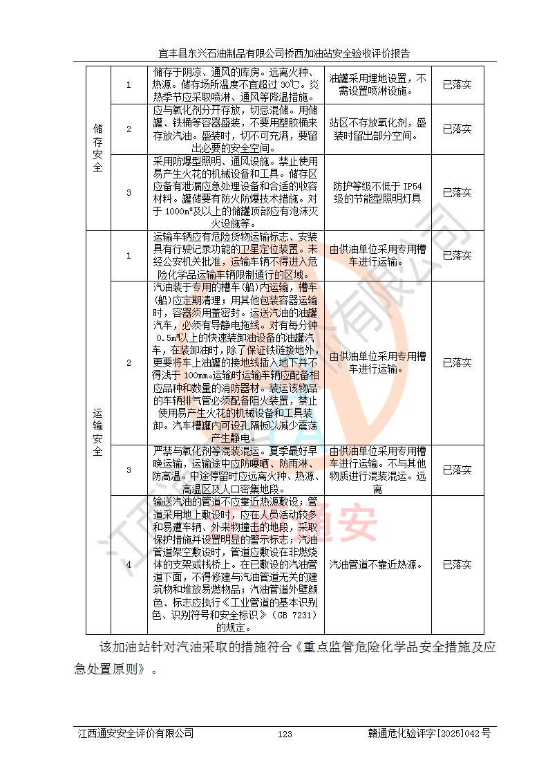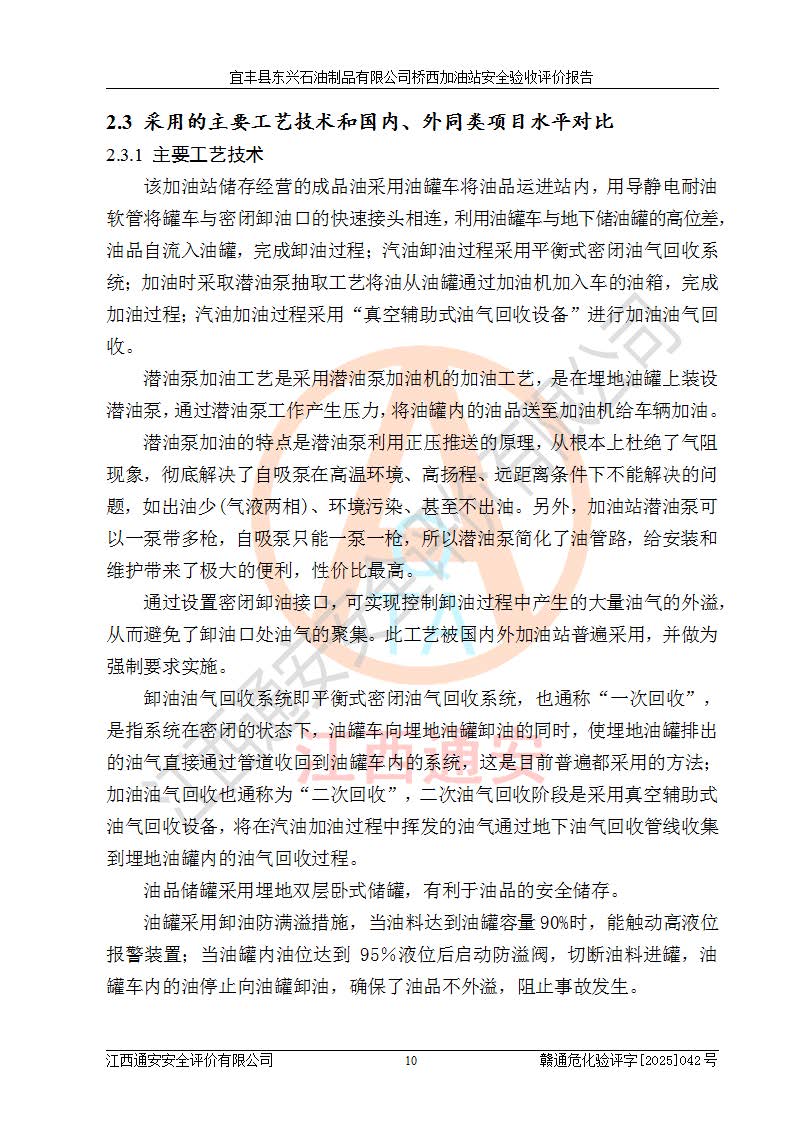 其它 | 一、安全状况综合评述 宜丰县东兴石油制品有限公司桥西加油站位于宜春市宜丰县桥西乡,从事成品油(汽油、柴油)零售业务,属二级加油站。 通过对该加油站建设项目安全验收评价,得出以下评价结论: 化学品、设备及工艺辨识结果 经辨识,该加油站经营、储存危险化学品为汽油和柴油,其中汽油属于重点监管危险化学品、特别管控危险化学品;该加油站不涉及剧毒化学品、高毒物品、易制毒化学品、监控化学品、易制爆化学品。经营、储存过程中采用的设备及工艺不属于淘汰落后设备及工艺、不涉及危险化工工艺,生产和储存单元均不构成危险化学品重大危险源。 建设项目所在地的安全条件和周边的安全间距 该站东南侧临354国道,北侧、西侧、东侧为居民建筑,加油站为二级加油站,设有油气回收系统,站外50米范围内无重要公共建筑物、明火设备和甲、乙类生产及储存设施,站区内加油设施与周边建构筑物之间的距离能够满足《汽车加油加气加氢站技术标准》GB50156-2021 和《建筑设计防火规范》GB50016-2014(2018 年版)以及相关**规范要求。本报告认为该加油站建设项目周边对加油站的影响以及建设项目所在地的自然条件对建设项目投入使用后的影响均较小,该加油站具备标准规范所要求的安全条件。 该项目安全设计诊断报告的采纳情况 该加油站安全设计诊断报告核查的问题(共15项)及整改建议均已采纳,经评价组现场复核,均已整改完成。 该项目调试中表现出的技术、工艺和装置、设备(设施)的安全、 可靠性和安全水平。 该加油站整改过程工作进展顺利,处于正常状态。经查阅资料和分析评价,认为本项目技术、工艺和装置、设备(设施)的安全、可靠性和安全水平符合**相应安全标准的要求。 该加油站储存经营的汽油属于重点监管的危险化学品和特别管控危险化学品,该加油站在后续的经营中应按照相关规范和要求加强安全管理,要求油品运输单位强化运输管理、自身加强储存定制化管理。 该加油站经营过程中存在的危险有害因素为:①火灾、爆炸;② 中毒和窒息;③**伤害;④触电;⑤高处坠落;⑥物体打击、⑦其他伤害。 其中火灾、爆炸是主要的危险、有害因素,加油站埋地储罐区、加油区、卸 油区是主要的危险源。 (7)经采用作业条件危险性评价法(LEC)进行分析,该加油站的作业条件相对比较安全。在选定的加油作业、卸油作业、维修作业、配电作业等4个单元中均为“一般危险、需要注意”作业环境,且一般危险作业环境的出现均由物料的危险程度所决定,作业条件相对安全。 (8)采用危险度评价法分析,油罐区主要危险物质为汽油和柴油,常温、常压下储存。储罐区汽油罐为Ⅰ级,属**危险;柴油罐得分为为Ⅲ级,属低度危险。油罐采用双层罐埋地设置,按要求设置了通气管,并装设了阻火器;设置了液位监测报警系统和紧急切断系统,埋地加油管道设置双层管道,其安全风险可控。 (9)采用检查表评价法对该加油站站址选择、总平面布置、加油工艺及设施、消防设施和给排水、电气与报警和紧急切断系统等进行检查分析,经整改后,该加油站涉及的强制条款和其他项均符合要求。该加油站设置了消防安全设施、防雷防静电设施、液位监测措施、油罐泄漏检测措施、电气防爆措施等安全防护设施,取得了消防验收意见书和防雷检测合格报告,符合**法律法规、标准规范的要求。该加油站公用工程能够满足安全经营的基本需要,符合安全经营的条件。 (10)该加油站相关证照齐全,成立了安全生产**小组,配备了安全管理人员,制定了安全管理制度、操作规程和事故应急预案,加油站的安全管理机构工作有力,加油站安全经营管理处于正常有序开展范围。 (11)对宜丰县东兴石油制品有限公司桥西加油站存在重大生产安全事故隐患进行判定,检查结果为该加油站不存在重大生产安全事故隐患。 总体评价结论:宜丰县东兴石油制品有限公司桥西加油站认真落实并合理采纳安全设计诊断报告中的安全对策、措施及建议,现场与安全设施设计单位重新绘制的现状总平面布置图一致,安全设计诊断报告提出的安全对策措施已落实到位。对潜在的危险、 有害因素采取了安全对策措施,工程潜在的危险、有害因素可得到**控制, 风险在**控制和可接受范围内。