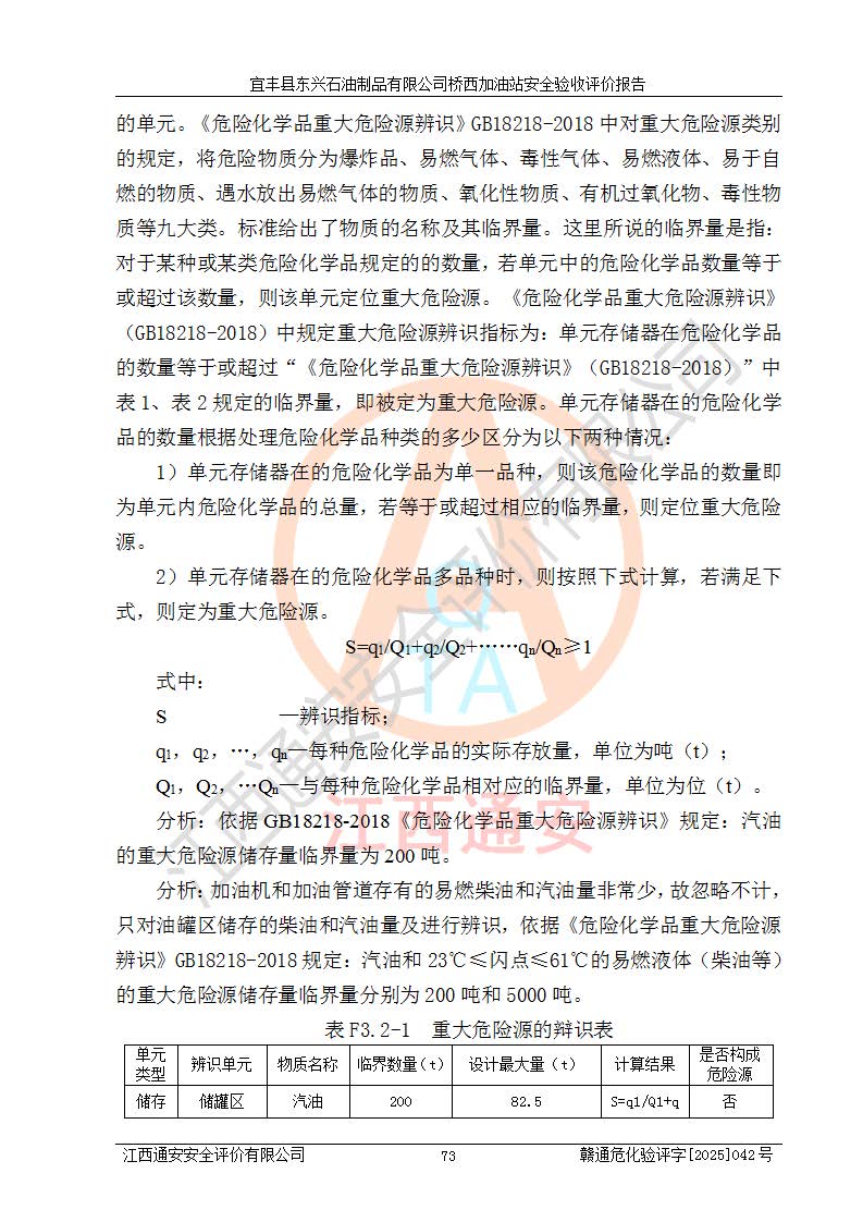 主要任务 | 本评价报告主要针对评价范围内汽油、柴油储存经营过程所涉及的危险、有害因素及重大危险源等进行辨识与分析,根据相应法律、法规、标准的要求检查安全设施的配置及相关检测检验情况及其符合性,检查公用工程及辅助设施的配套性,审核安全生产管理机构、制度、人员培训、设备管理、操作规程、应急预案及劳动防护用品的配备等,对该项目安全设施及安全措施进行符合性评价,并在此基础上提出相应的安全对策措施及建议。 | ||||