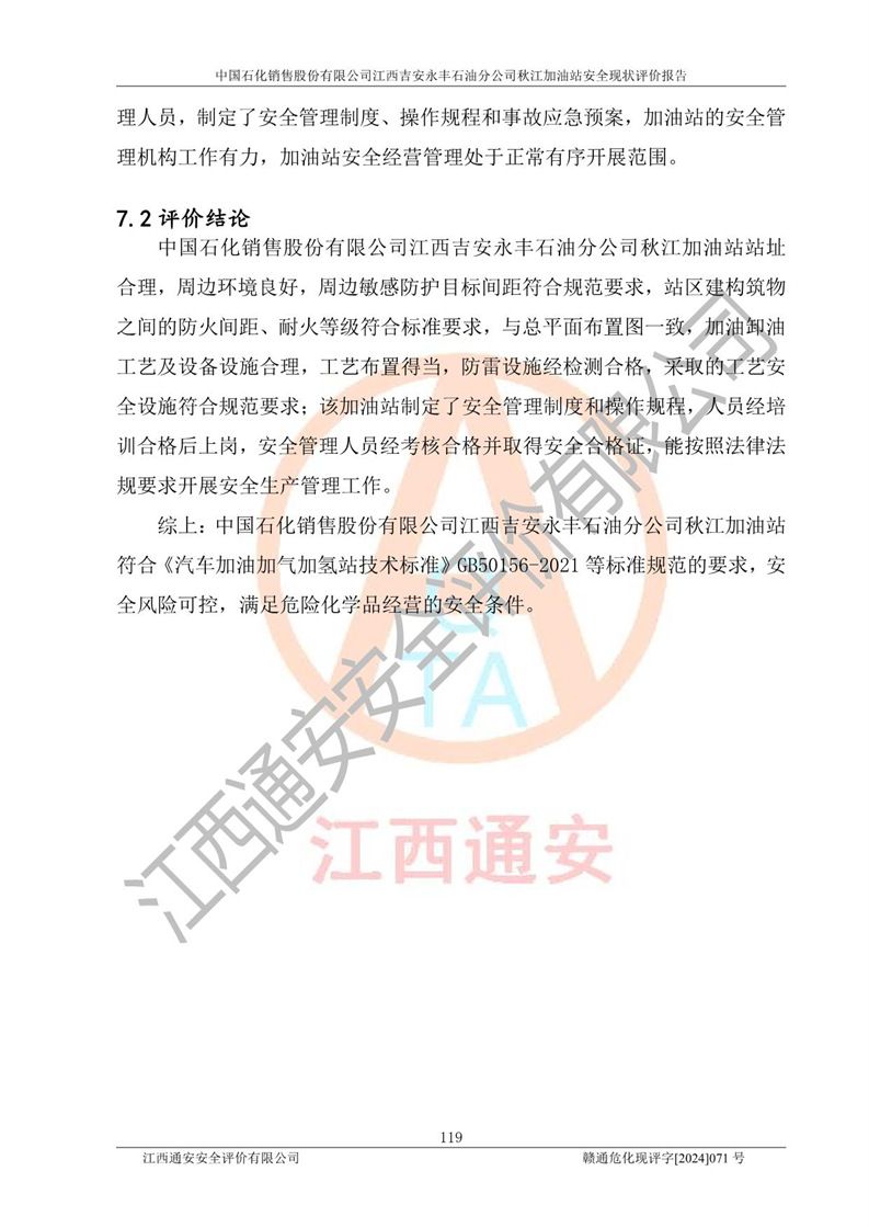 评价结论 | 中国石化销售股份有限公司江西吉安永丰石油分公司秋江加油站符合《汽车加油加气加氢站技术标准》GB50156-2021等标准规范的要求,安全风险可控,满足危险化学品经营的安全条件。 | |||