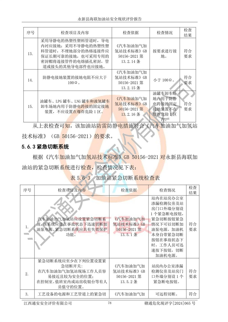 评价结论 | 永新县海联加油站站址合理,周边环境良好,与敏感防护目标间距符合规范要求,站区建构筑物之间的防火间距、耐火等级符合标准要求,与总平面布置图一致,加油卸油工艺及设备设施合理,工艺布置得当,防雷设施经检测合格,采取的工艺安全设施符合规范要求;该加油站制定了安全管理制度和操作规程,人员经培训合格后上岗,安全管理人员经考核合格并取得安全合格证,能按照法律法规要求开展安全生产管理工作。 综上:永新县海联加油站符合《汽车加油加气加氢站技术标准》GB50156-2021等标准规范的要求,安全风险可控,满足危险化学品经营的安全条件。 | |||