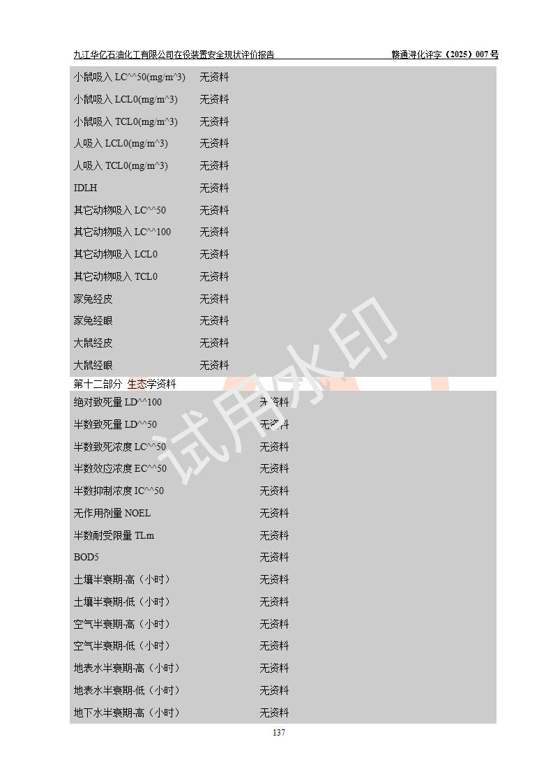 评价结论 | 经评价组评价,九江华亿石油化工有限公司现场总体布局、设备布置、DCS/SIS系统情况与安全设计图纸一致;企业在役装置涉及重点监管危险化学品、重大危险源,相关自控系统配置与安全设计相符并正常投用;企业主要负责人董事长、总经理、生产、技术、设备负责人及安全管理人员均已具有化工类大专以上相关专业学历,已取得危险化学品生产企业主要负责人及安全管理人员考核合格证。 九江华亿石油化工有限公司在役生产装置配套安全装置、防护设施以及采取的安全技术措施及安全管理措施符合**有关法规、标准、规范要求,符合《危险化学品生产企业安全生产许可证实施办法》规定的安全生产条件,项目风险可控,满足安全生产条件。