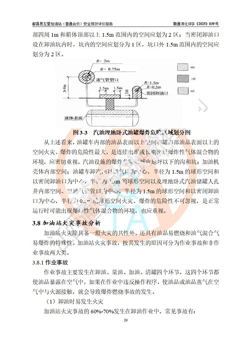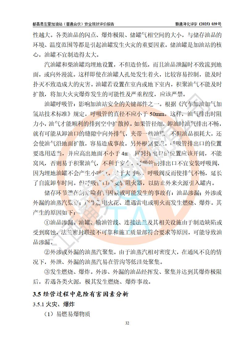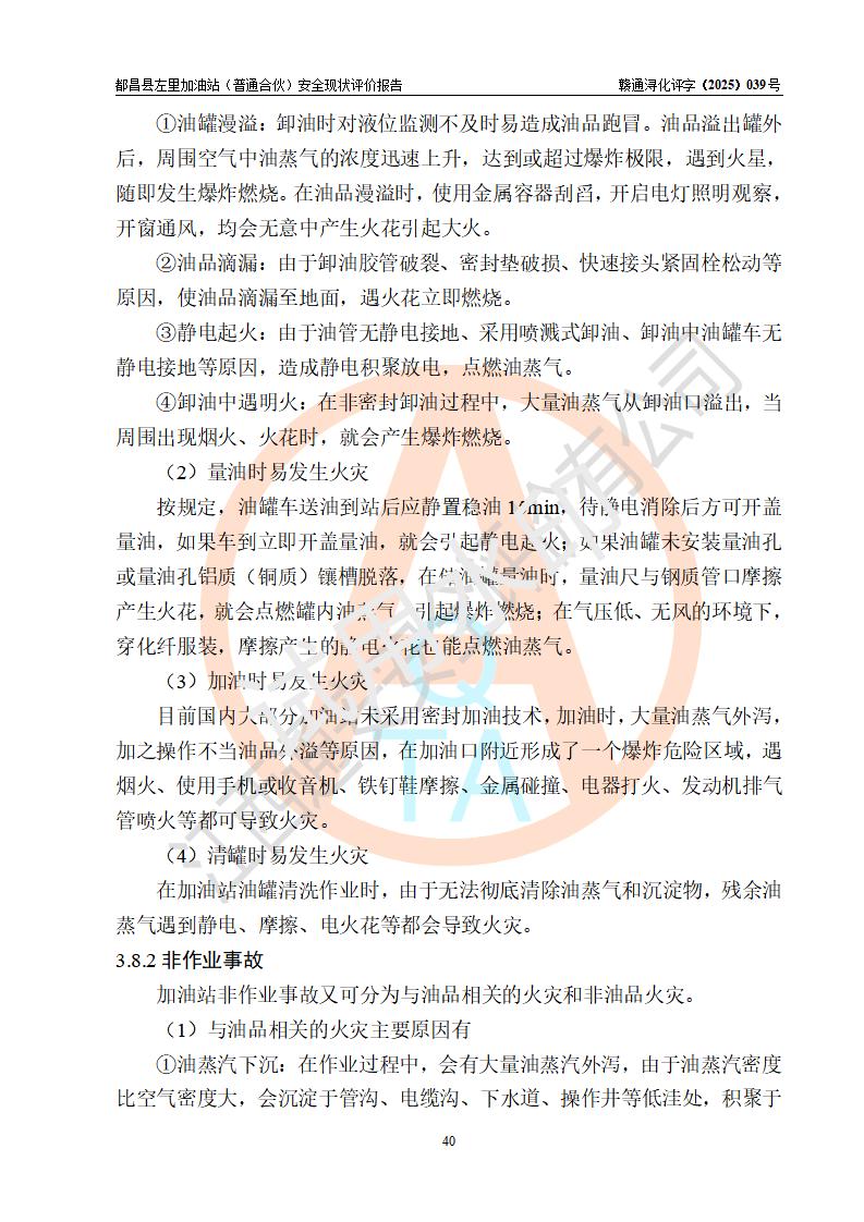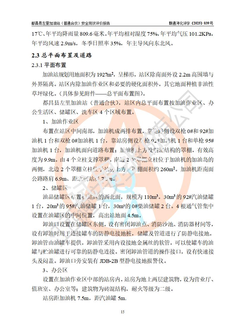 项目简介 | 都昌县左里加油站(普通合伙)是一家专门从事成品油零售经营的普通合伙企业,执行事务合伙人:付玉华,周满福,经营场所位于江西省九江市都昌县左里镇左里街。该加油站现有从业人员4人,其中安全管理人员1人,主要负责人蔡建荣。 该加油站站区占地面积1927m2,站区内设置有3台双枪程控燃油加油机、1台单枪程控燃油加油机及配套的工艺管线、30m3双层0#柴油储罐2台、30m3双层92#汽油储罐1台、20m3双层95#汽油储罐1台,油品储罐总容积为110m3(折算成汽油为80m3)。按现行《汽车加油加气加氢站技术标准》对加油站的等级划分原则,该站属于三级加油站。 该站由九江市行政审批局换发《危险化学品经营许可证》(证号:赣九行审经(甲)字[2022]000088号),**期限2022年07月03日至2025年07月02日 | |||