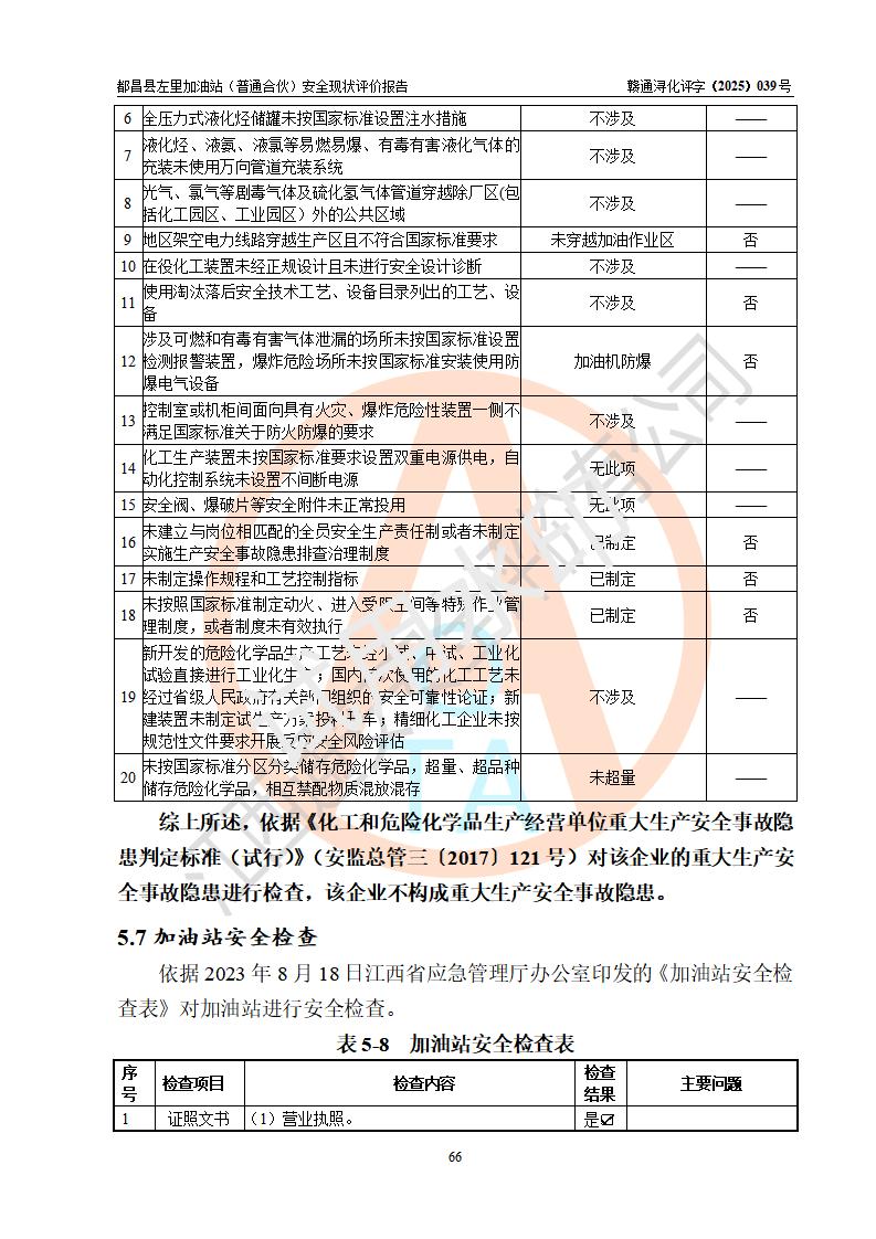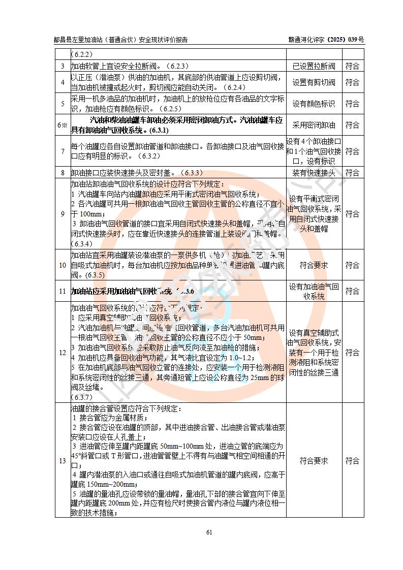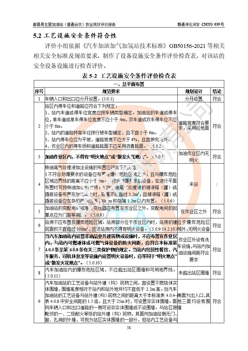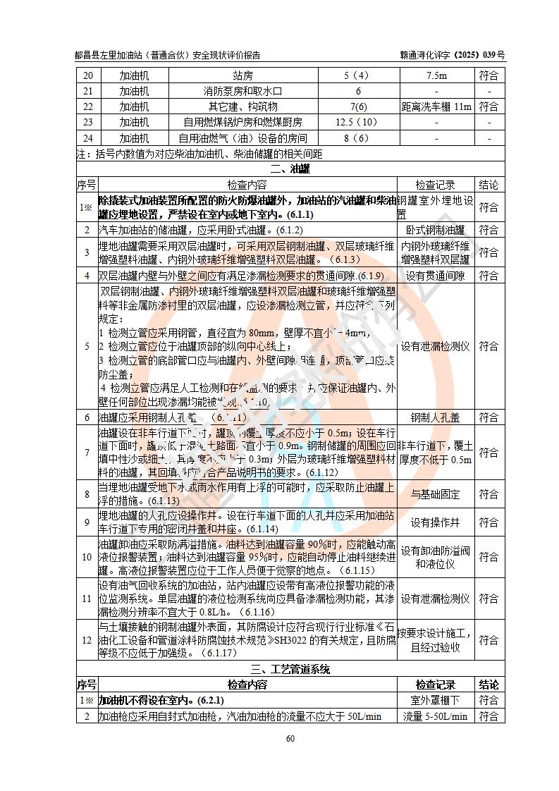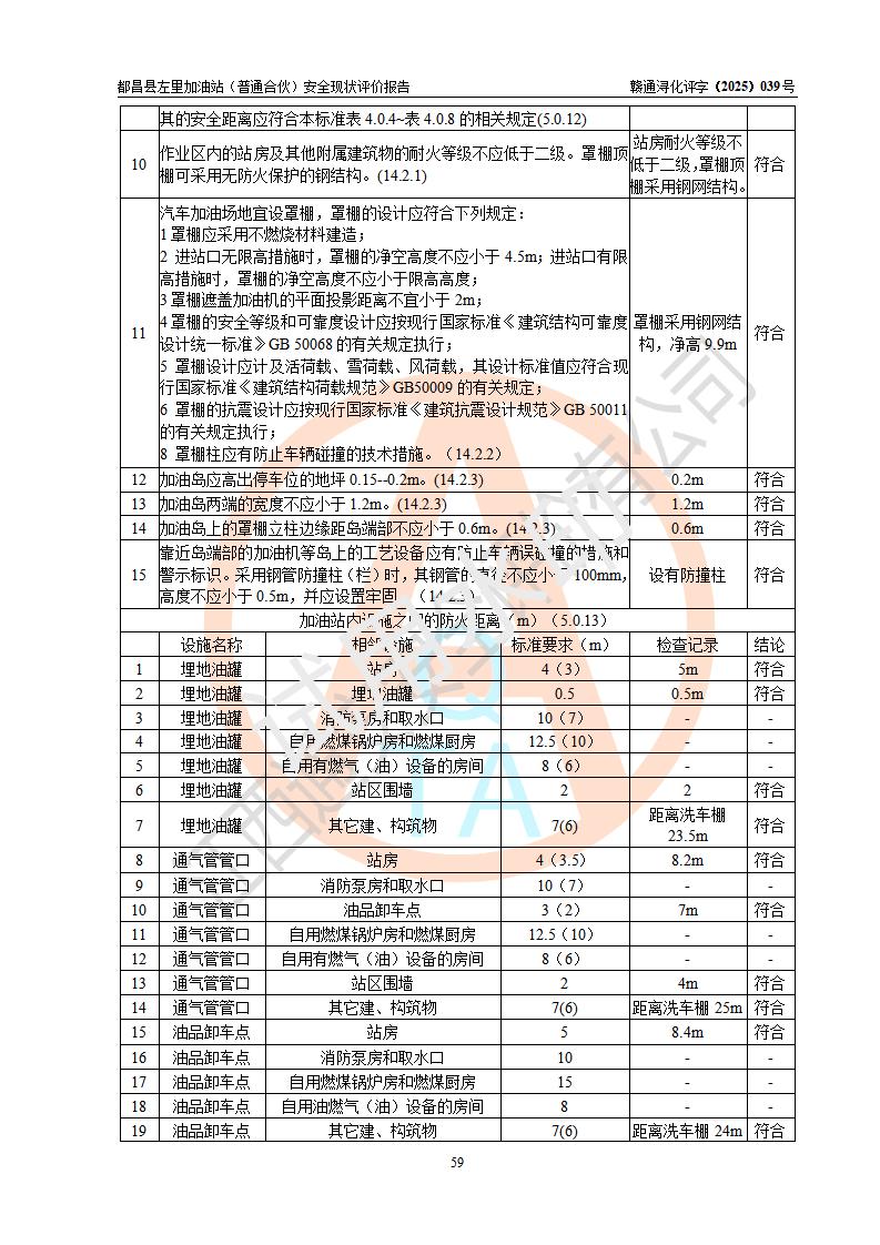 评价结论 | 都昌县左里加油站(普通合伙)涉及的安全条件、安全经营条件、安全生产管理符合《危险化学品经营许可证管理办法》、《汽车加油加气加氢站技术标准》等**有关法规、标准、规范要求,能满足危险化学品经营安全条件。 | |||