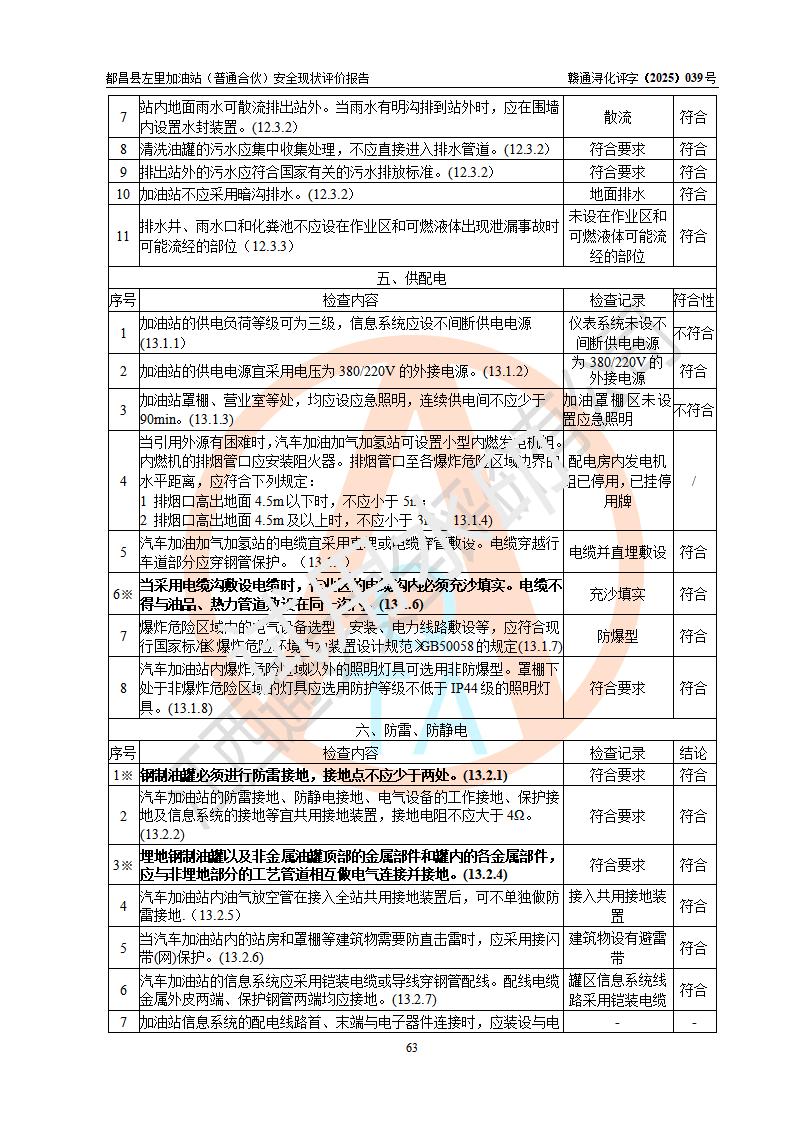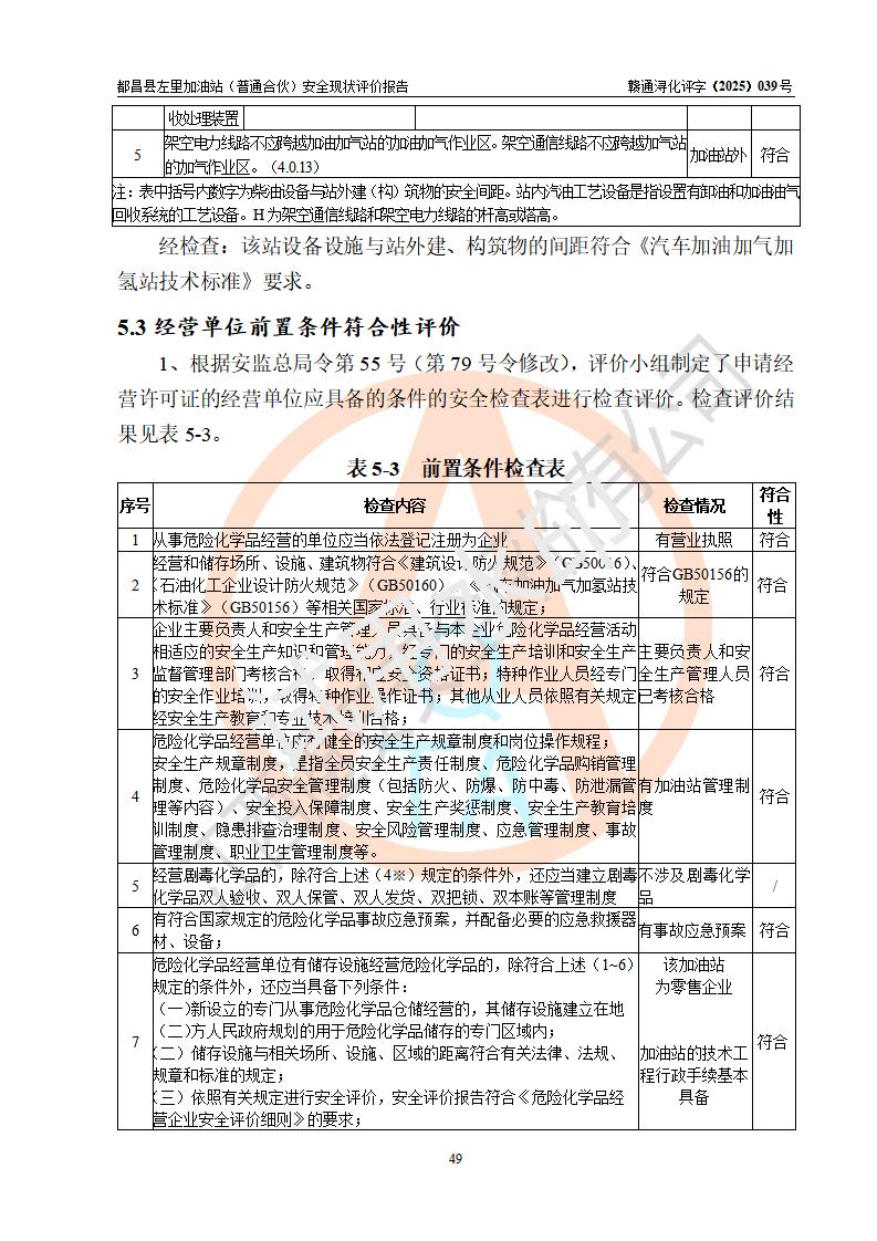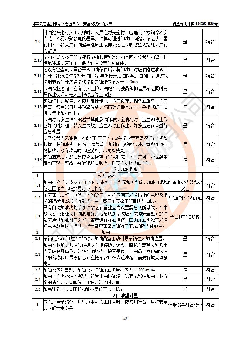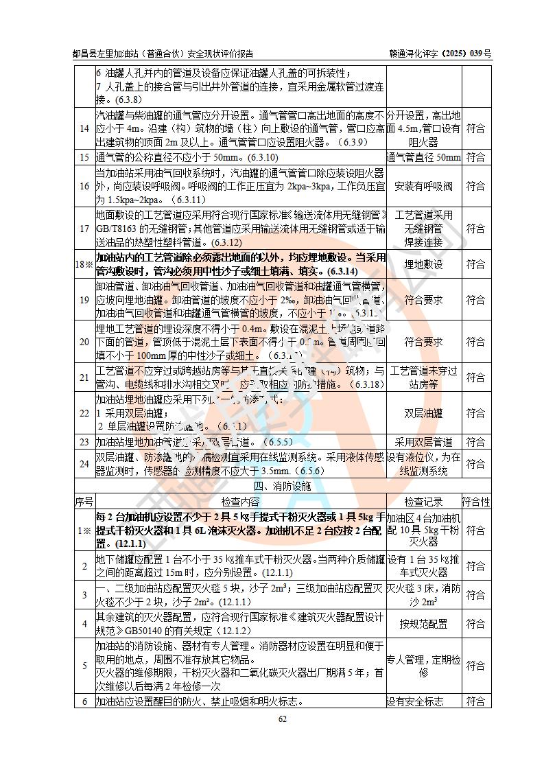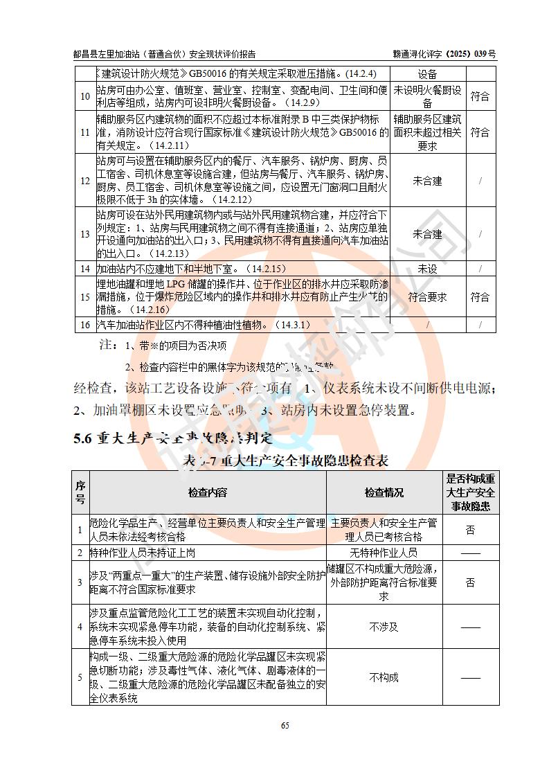 评价结论 | 都昌县左里加油站(普通合伙)涉及的安全条件、安全经营条件、安全生产管理符合《危险化学品经营许可证管理办法》、《汽车加油加气加氢站技术标准》等**有关法规、标准、规范要求,能满足危险化学品经营安全条件。 | |||