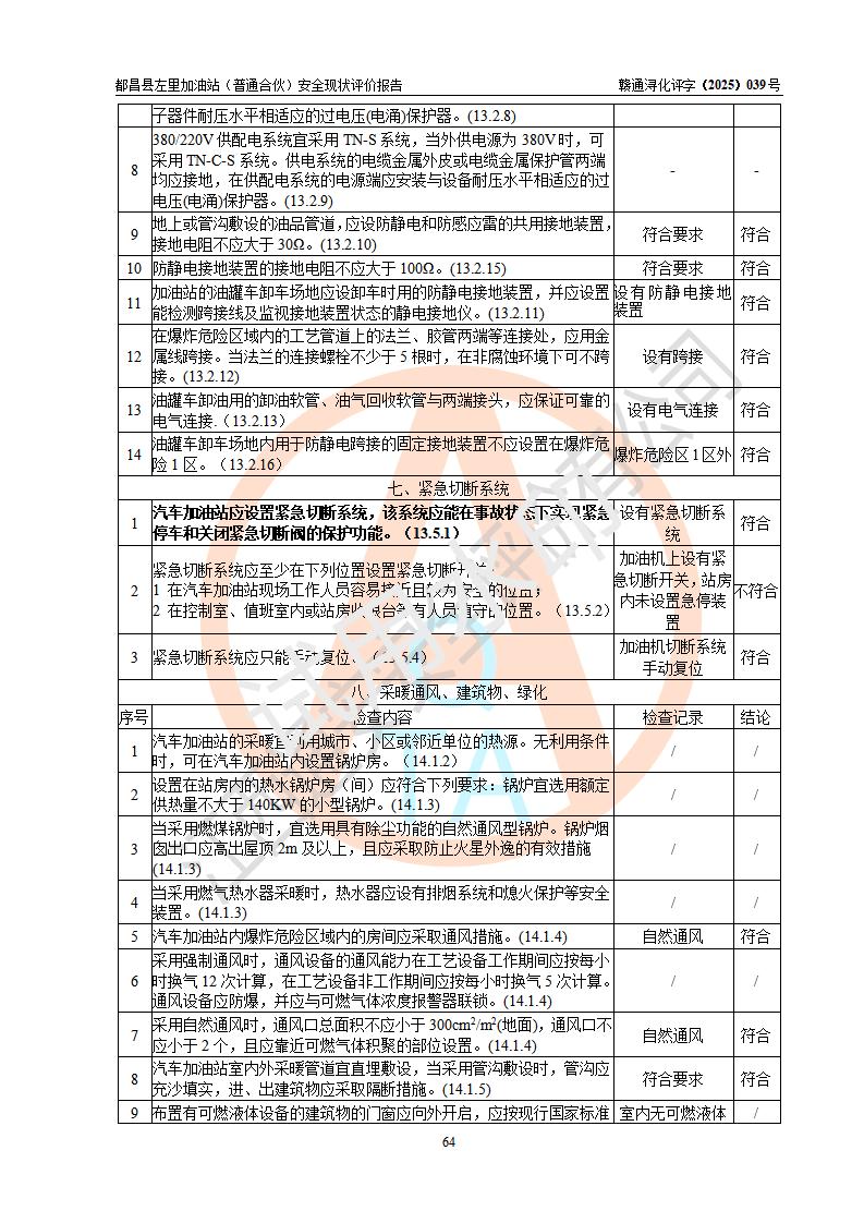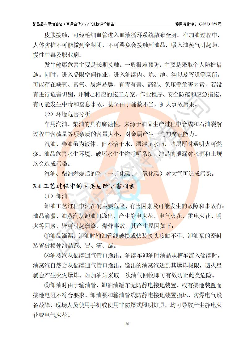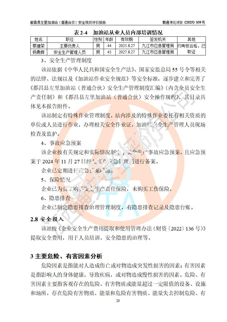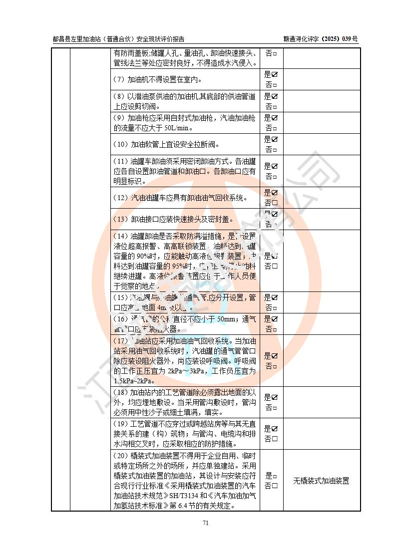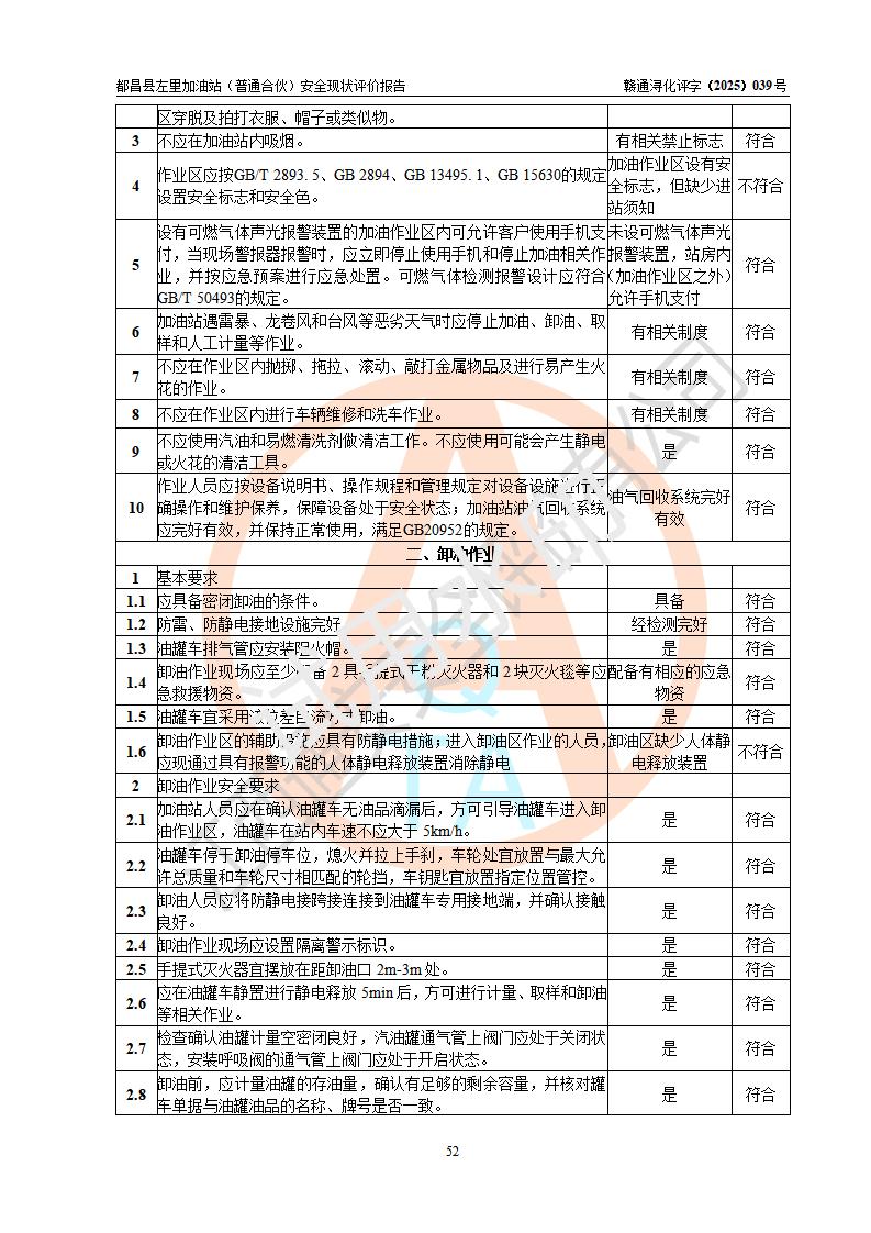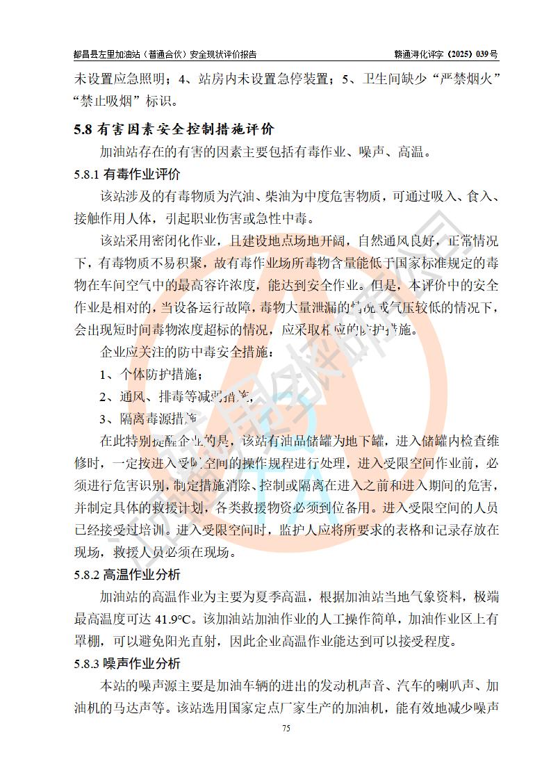 评价结论 | 都昌县左里加油站(普通合伙)涉及的安全条件、安全经营条件、安全生产管理符合《危险化学品经营许可证管理办法》、《汽车加油加气加氢站技术标准》等**有关法规、标准、规范要求,能满足危险化学品经营安全条件。 | |||