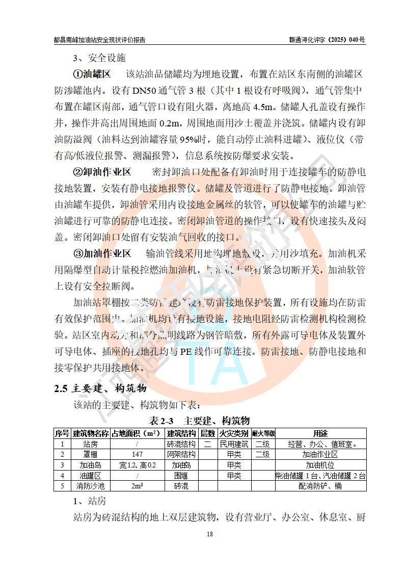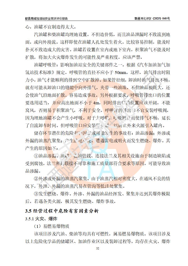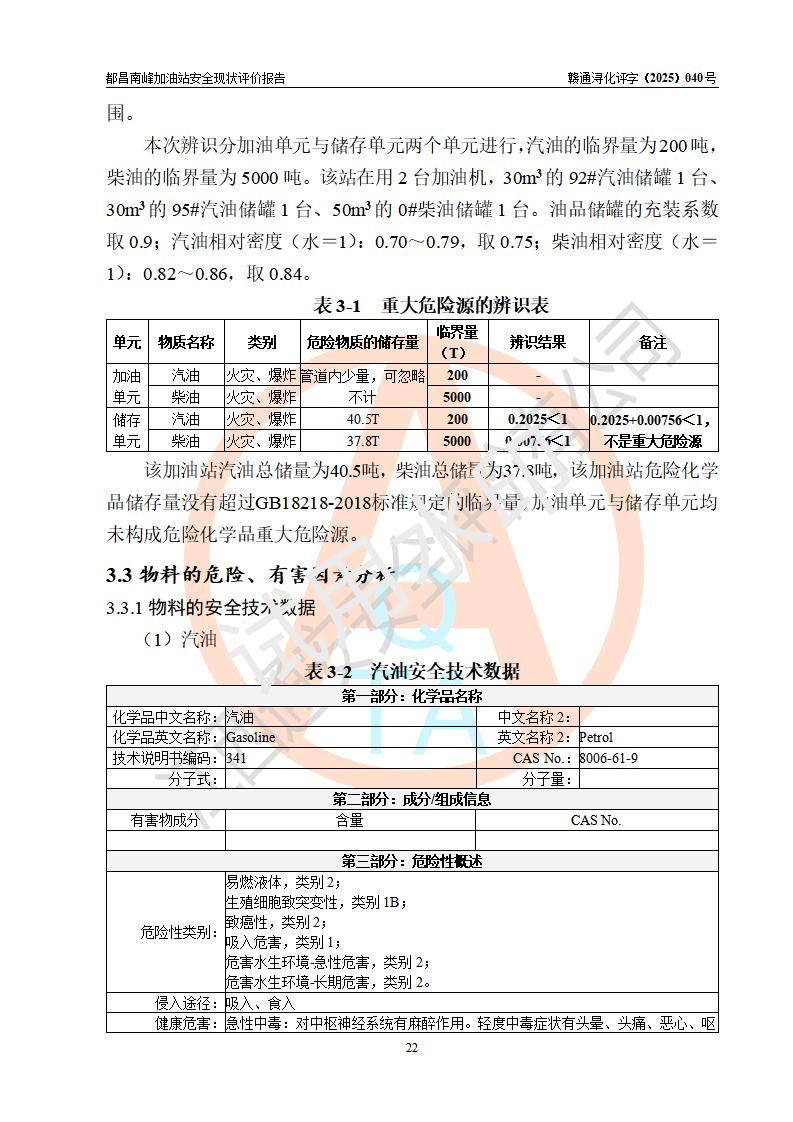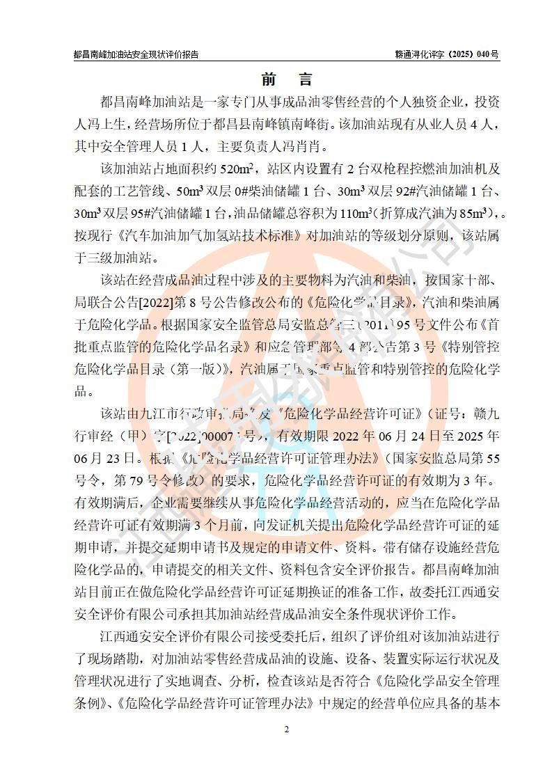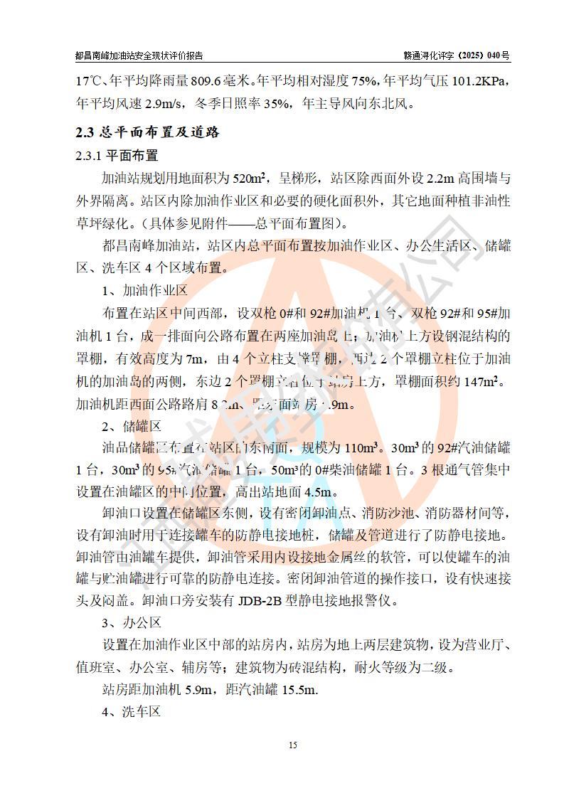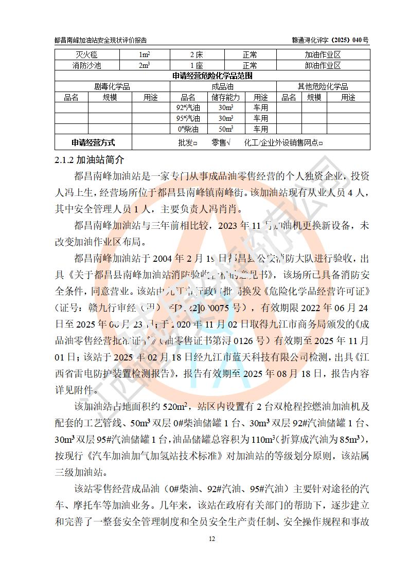都昌南峰加油站是一家专门从事成品油零售经营的个人独资企业,投资人冯上生,经营场所位于都昌县南峰镇南峰街。该加油站现有从业人员4人,其中安全管理人员1人,主要负责人冯肖肖。 该加油站占地面积约520m2,站区内设置有2台双枪程控燃油加油机及配套的工艺管线、50m3双层0#柴油储罐1台、30m3双层92#汽油储罐1台、30m3双层95#汽油储罐1台,油品储罐总容积为110m3(折算成汽油为85m3),。按现行《汽车加油加气加氢站技术标准》对加油站的等级划分原则,该站属于三级加油站。 该站由九江市行政审批局换发《危险化学品经营许可证》(证号:赣九行审经(甲)字[2022]000075号),**期限2022年06月24日至2025年06月23日。 |