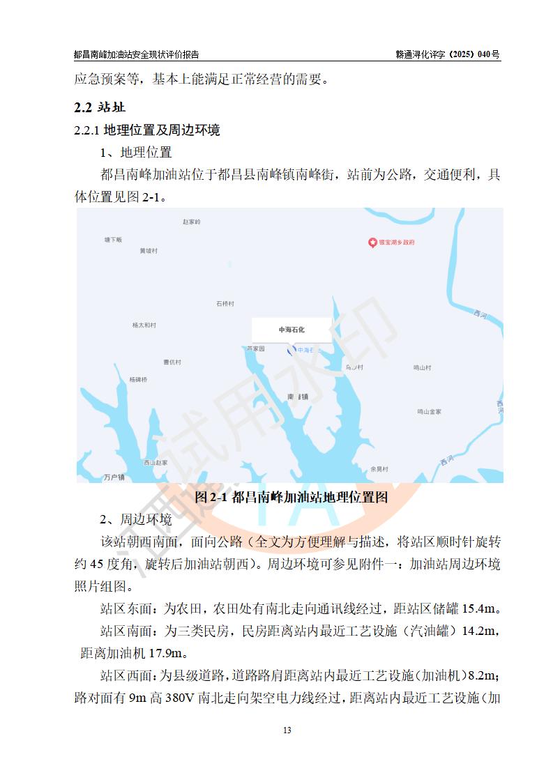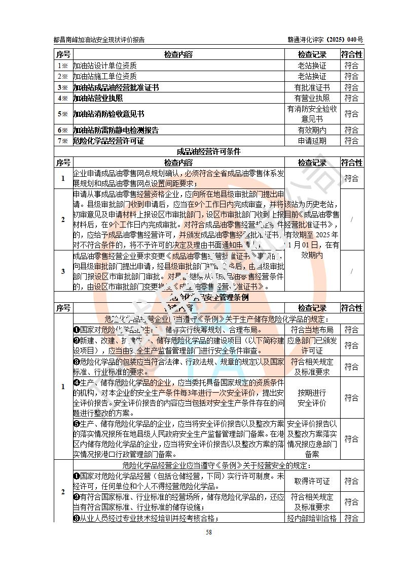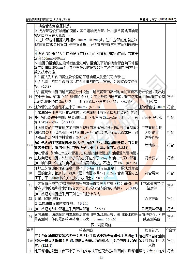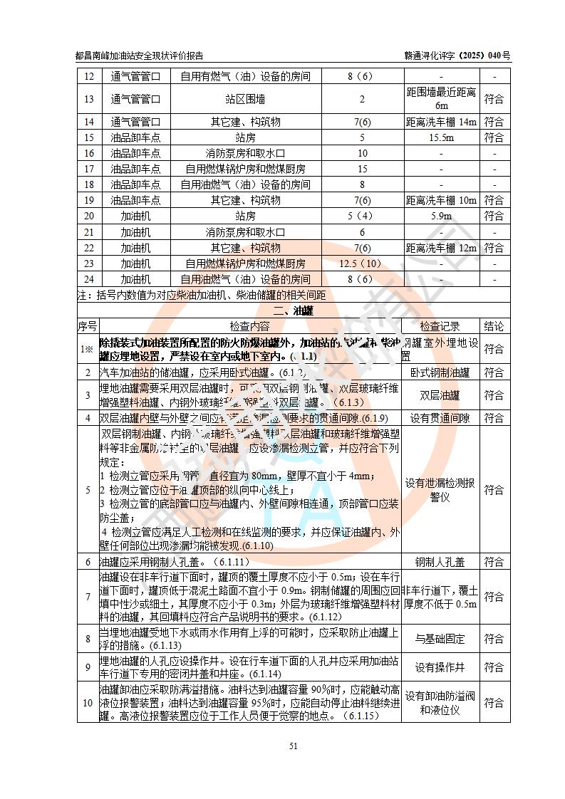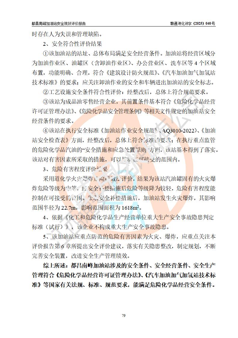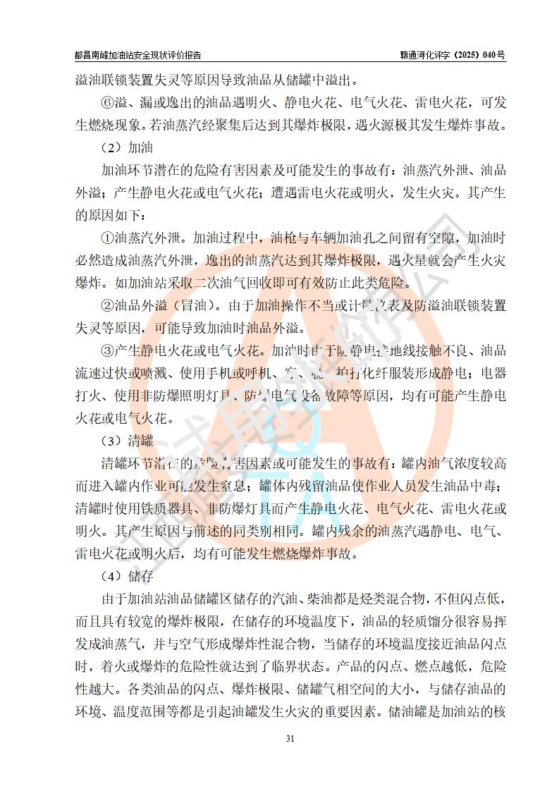 都昌南峰加油站是一家专门从事成品油零售经营的个人独资企业,投资人冯上生,经营场所位于都昌县南峰镇南峰街。该加油站现有从业人员4人,其中安全管理人员1人,主要负责人冯肖肖。 该加油站占地面积约520m2,站区内设置有2台双枪程控燃油加油机及配套的工艺管线、50m3双层0#柴油储罐1台、30m3双层92#汽油储罐1台、30m3双层95#汽油储罐1台,油品储罐总容积为110m3(折算成汽油为85m3),。按现行《汽车加油加气加氢站技术标准》对加油站的等级划分原则,该站属于三级加油站。 该站由九江市行政审批局换发《危险化学品经营许可证》(证号:赣九行审经(甲)字[2022]000075号),**期限2022年06月24日至2025年06月23日。 |