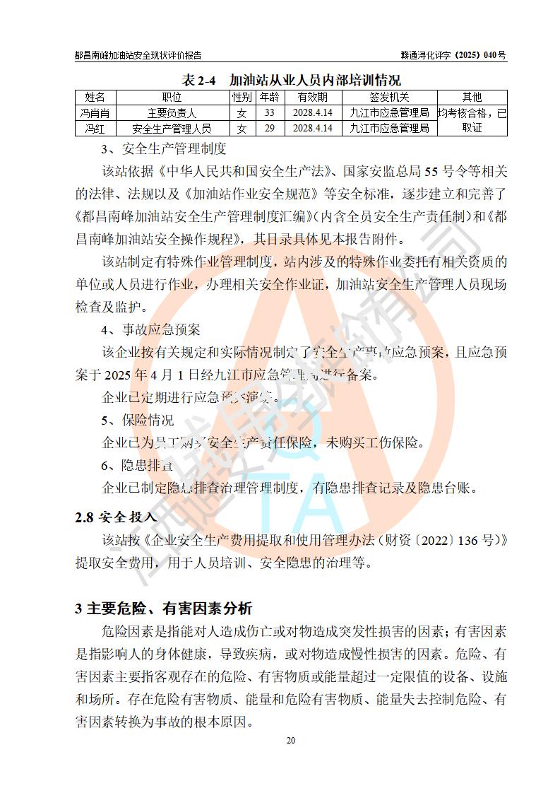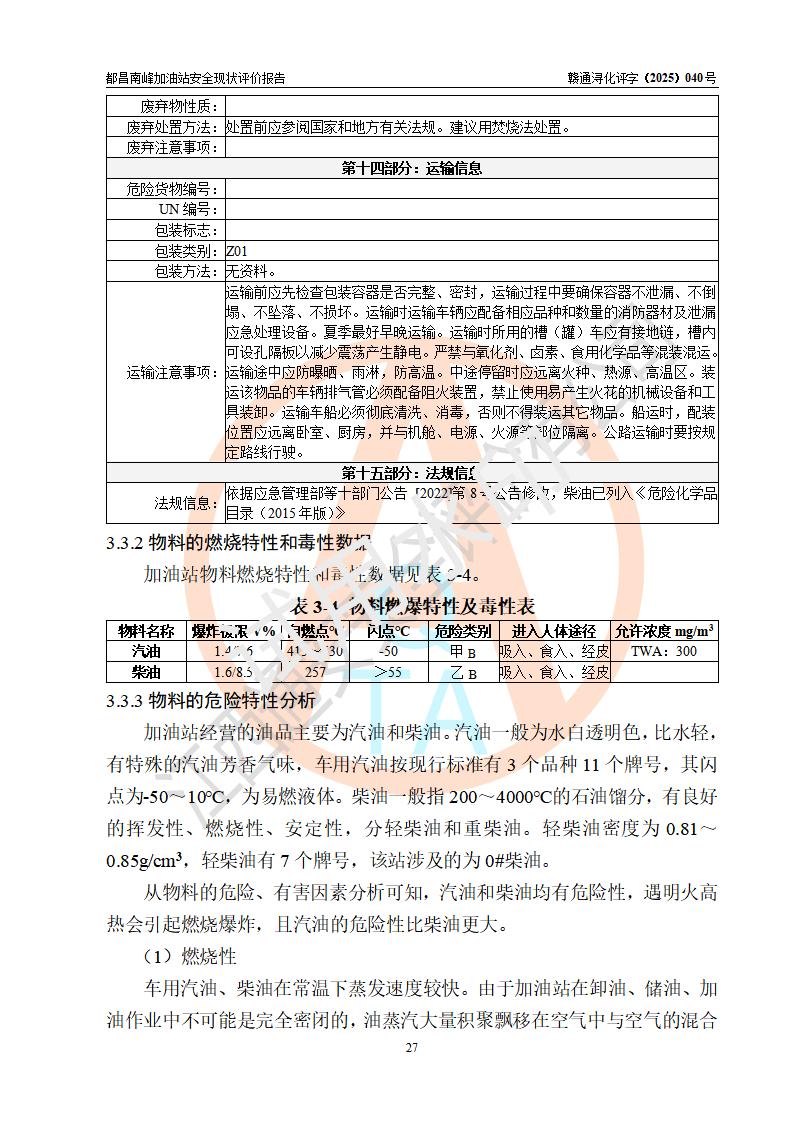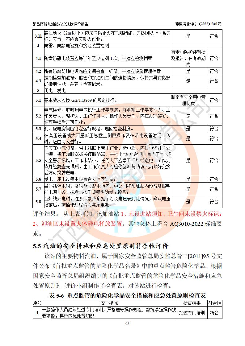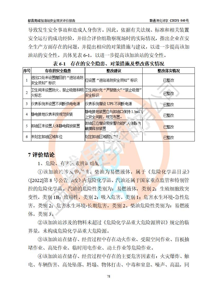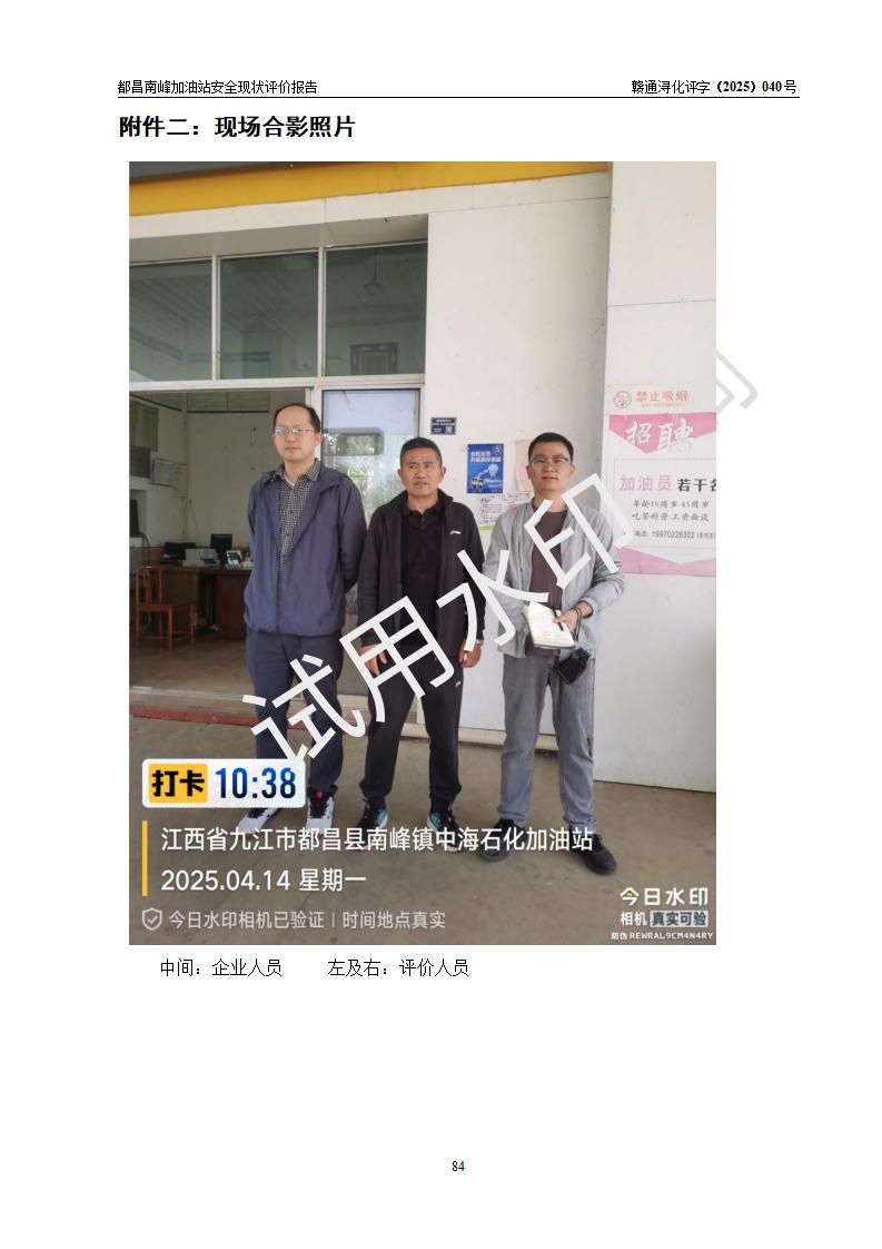 都昌南峰加油站是一家专门从事成品油零售经营的个人独资企业,投资人冯上生,经营场所位于都昌县南峰镇南峰街。该加油站现有从业人员4人,其中安全管理人员1人,主要负责人冯肖肖。 该加油站占地面积约520m2,站区内设置有2台双枪程控燃油加油机及配套的工艺管线、50m3双层0#柴油储罐1台、30m3双层92#汽油储罐1台、30m3双层95#汽油储罐1台,油品储罐总容积为110m3(折算成汽油为85m3),。按现行《汽车加油加气加氢站技术标准》对加油站的等级划分原则,该站属于三级加油站。 该站由九江市行政审批局换发《危险化学品经营许可证》(证号:赣九行审经(甲)字[2022]000075号),**期限2022年06月24日至2025年06月23日。 |