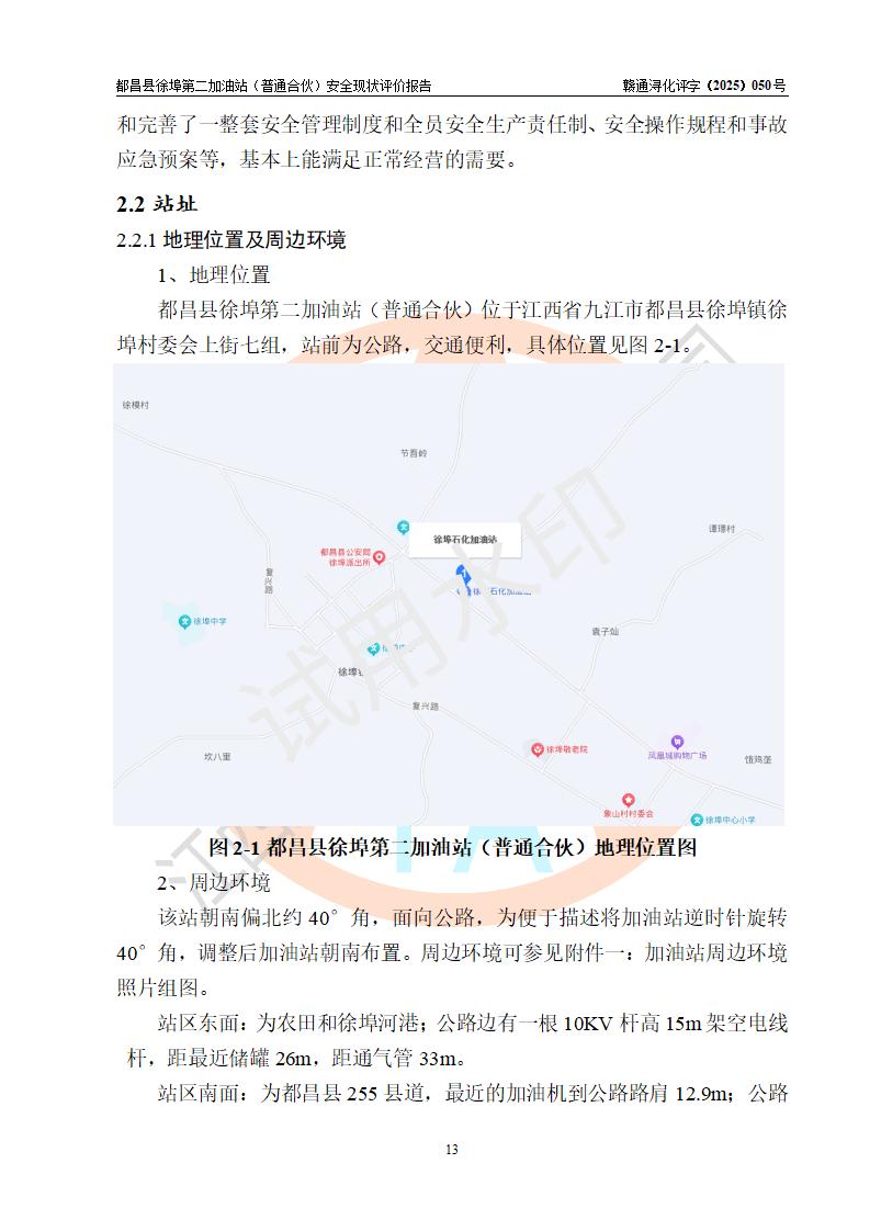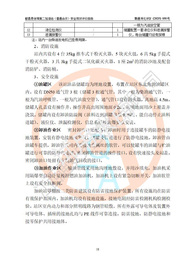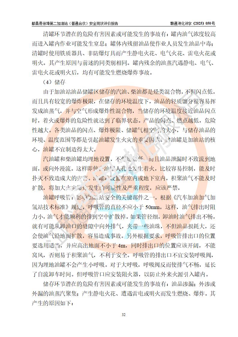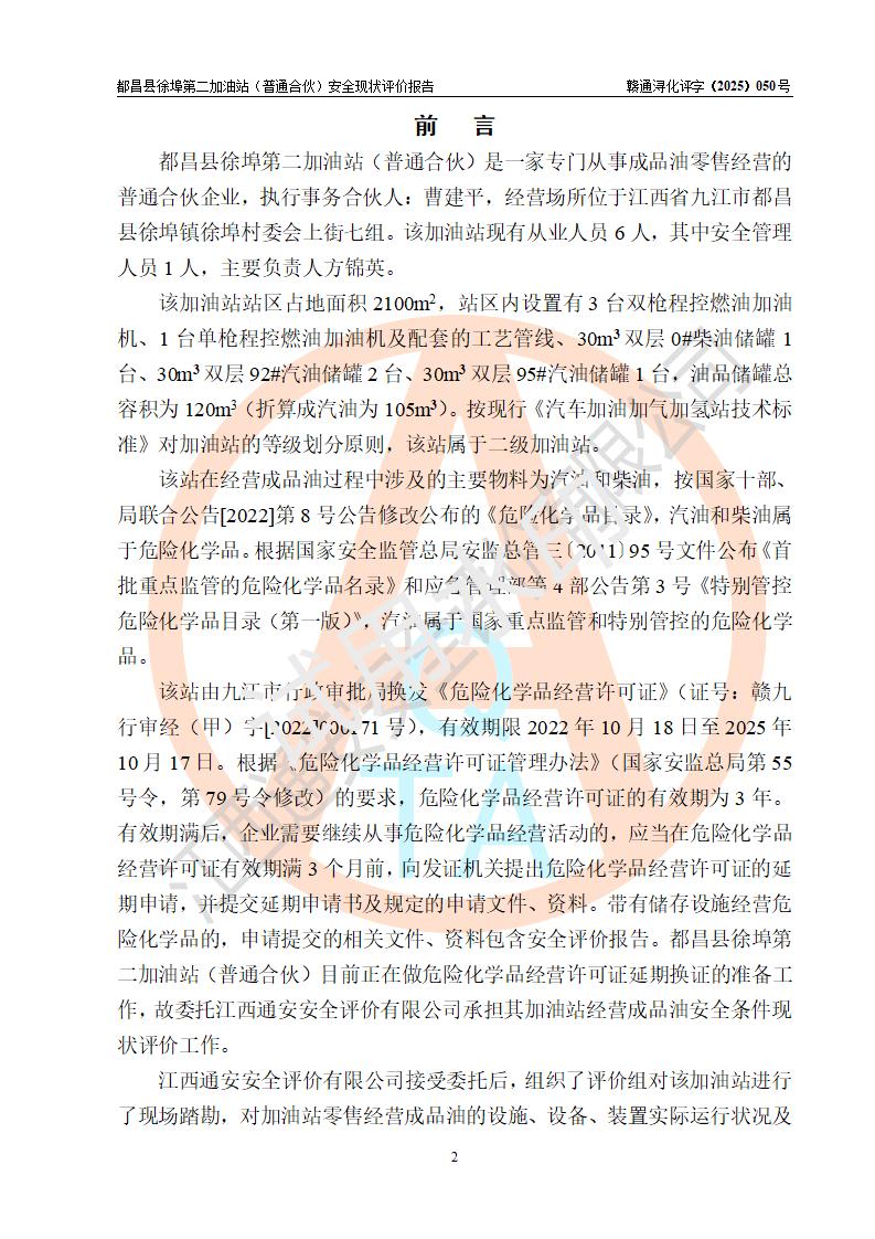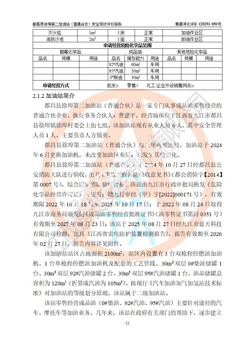 都昌县徐埠第二加油站(普通合伙)是一家专门从事成品油零售经营的普通合伙企业,执行事务合伙人:曹建平,经营场所位于江西省九江市都昌县徐埠镇徐埠村委会上街七组。该加油站现有从业人员6人,其中安全管理人员1人,主要负责人方锦英。 该加油站站区占地面积2100m2,站区内设置有3台双枪程控燃油加油机、1台单枪程控燃油加油机及配套的工艺管线、30m3双层0#柴油储罐1台、30m3双层92#汽油储罐2台、30m3双层95#汽油储罐1台,油品储罐总容积为120m3(折算成汽油为105m3)。按现行《汽车加油加气加氢站技术标准》对加油站的等级划分原则,该站属于二级加油站。 该站由九江市行政审批局换发《危险化学品经营许可证》(证号:赣九行审经(甲)字[2022]000171号),**期限2022年10月18日至2025年10月17日。 |