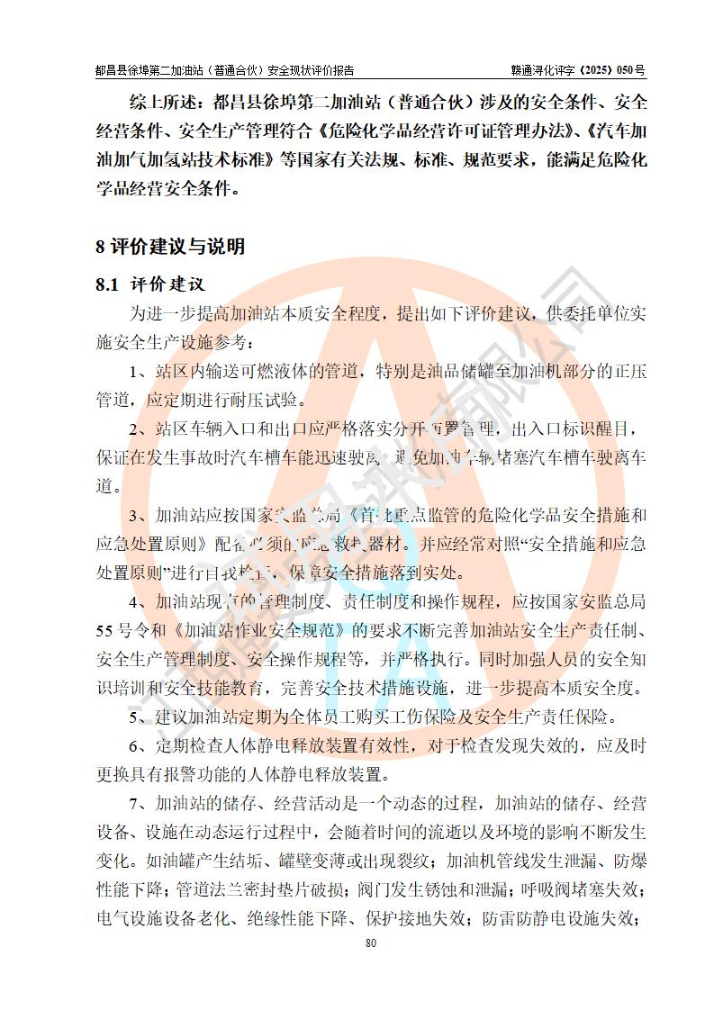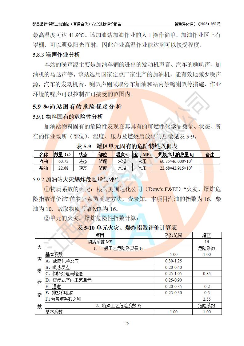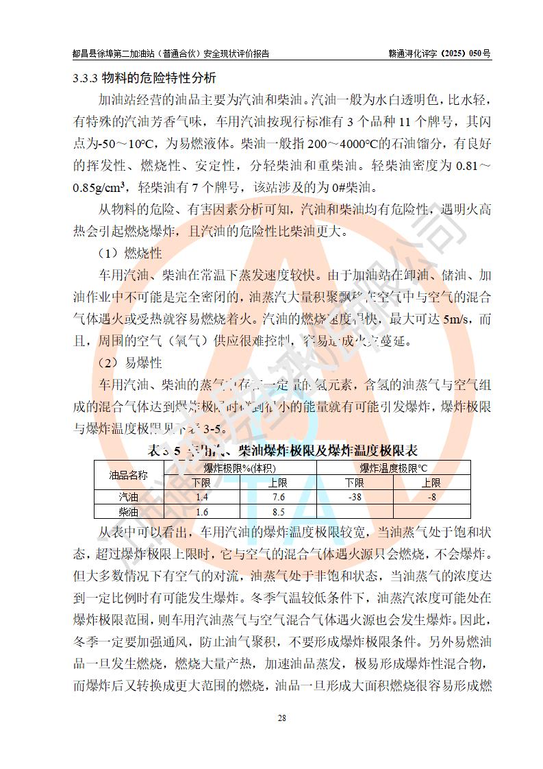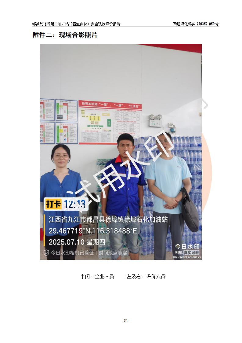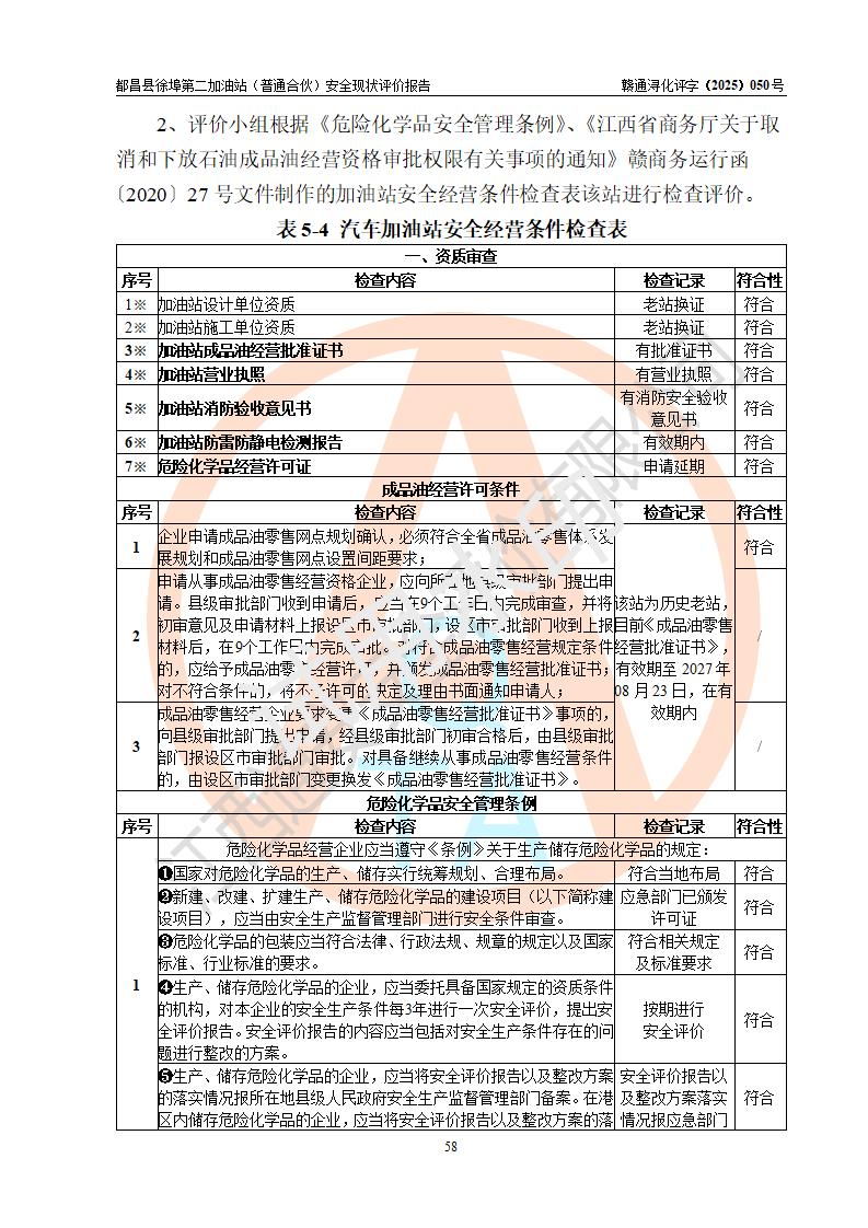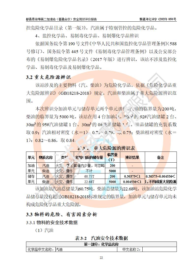 都昌县徐埠第二加油站(普通合伙)是一家专门从事成品油零售经营的普通合伙企业,执行事务合伙人:曹建平,经营场所位于江西省九江市都昌县徐埠镇徐埠村委会上街七组。该加油站现有从业人员6人,其中安全管理人员1人,主要负责人方锦英。 该加油站站区占地面积2100m2,站区内设置有3台双枪程控燃油加油机、1台单枪程控燃油加油机及配套的工艺管线、30m3双层0#柴油储罐1台、30m3双层92#汽油储罐2台、30m3双层95#汽油储罐1台,油品储罐总容积为120m3(折算成汽油为105m3)。按现行《汽车加油加气加氢站技术标准》对加油站的等级划分原则,该站属于二级加油站。 该站由九江市行政审批局换发《危险化学品经营许可证》(证号:赣九行审经(甲)字[2022]000171号),**期限2022年10月18日至2025年10月17日。 |