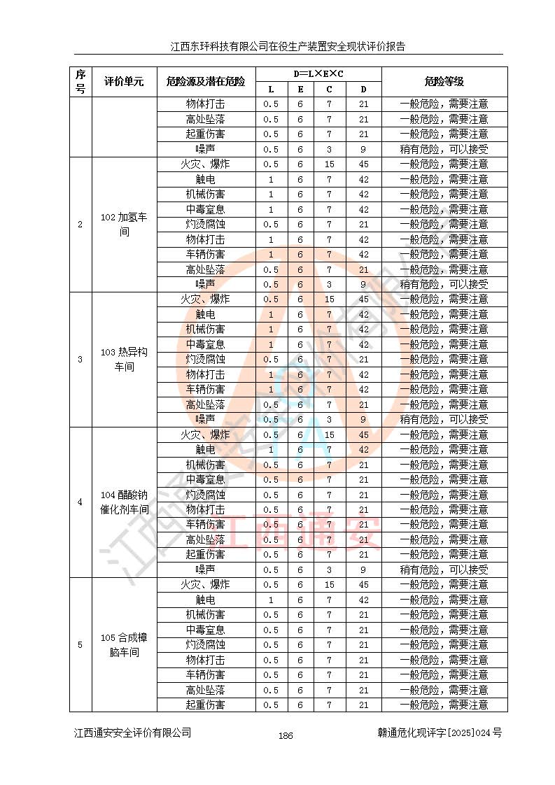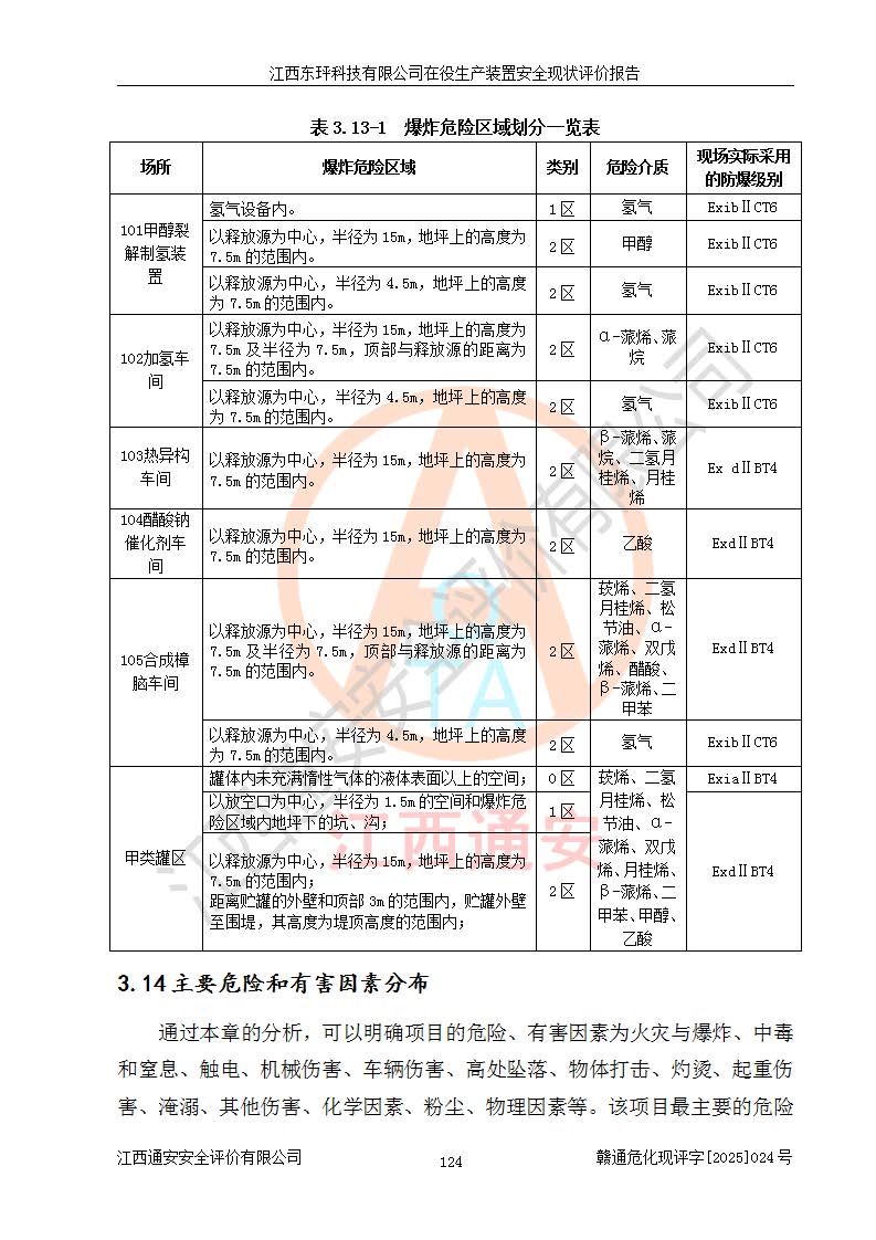 江西东玶科技有限公司位于江西省吉安市吉水县城西工业园区,法定**人为徐东,成立于2018年04月08日,注册资本叁仟贰佰叁拾万元整,经营范围为合成樟脑、α-蒎烯、β-蒎烯、二氢月桂烯(含月桂烯)、莰烯、双戊烯、氢气(中间产品)的制造加工(凭**批准证书经营);白乙酯、双萜烯等合成香料的制造加工等。 江西东玶科技有限公司2022年08月01日取得了《安全生产许可证》,许可证编号:(赣)WH安许证字[2022]1160号,许可范围为合成樟脑(2000t/a)、二氢月桂烯(1000t/a)、月桂烯(3200t/a)、莰烯(1000t/a)、双戊烯(810t/a)、双萜烯(1070t/a)、α-蒎烯(7500t/a)、β-蒎烯(3200t/a)、白乙酯(500t/a),**期为2022年08月01日至2025年07月31日。该公司2023年5月29日取得了三级安全生产标准化证书,证书编号:赣AQBWHⅢ202300036,**期至2026年5月。该公司现有员工53人,其中专职安全生产管理人员2人。 因生产经营需要,江西东玶科技有限公司实施了年产12000吨松节油深加工系列产品项目(二期),并将二氢月桂烯的设计生产规模2000t/a变更为1500t/a,减少中间产品蒎烷的消耗量,剩余的蒎烷(720t/a)作为产品销售。江西东玶科技有限公司委托深圳天阳工程设计有限公司进行了设计变更,按程序要求进行了试生产,委托评价公司编制了安全验收评价报告,并于2025年1月16日组织专家组和相关单位进行了验收。验收完成后,江西东玶科技有限公司2025年06月04日对《安全生产许可证》进行了变更,许可范围变更为合成樟脑(2000t/a)、二氢月桂烯(1500t/a)、月桂烯(3200t/a)、莰烯(1000t/a)、双戊烯(902.5t/a)、双萜烯(1200.7t/a)、α-蒎烯(7500t/a)、β-蒎烯(3200t/a)、白乙酯(500t/a)、蒎烷(中间产品,720t/a)。 江西东玶科技有限公司在役生产装置生产过程中涉及的主要原辅材料为松节油、乙酸、液碱、甲醇、碳酸钠、二甲苯、偏钛酸、甲酸、硫酸铜、雷尼镍、离子膜、天然气、氮气,中间产品为氢气、α-蒎烯、β-蒎烯、蒎烷,产品为合成樟脑、二氢月桂烯、月桂烯、莰烯、双戊烯、白乙酯、双萜烯,副产品为醋酸钠。根据《危险化学品目录》,该在役生产装置涉及的松节油、乙酸、液碱、甲醇、二甲苯、甲酸、雷尼镍、天然气(燃料)、氮气(压缩的)、柴油,中间产品α-蒎烯、β-蒎烯、氢气、蒎烷和产品中合成樟脑、二氢月桂烯、月桂烯、莰烯、双戊烯属于危险化学品。经辨识,甲醇、氢气和天然气(燃料)属于重点监管的危险化学品,甲醇属于特别管控的危险化学品,不涉及监控化学品、易制毒化学品、易制爆危险化学品、剧毒化学品和高毒物品,生产、储存单元不构成危险化学品重大危险源,涉及的加氢工艺属于重点监管的危险化工工艺。根据生产工艺特点及物料的理化特性可知,该在役生产装置生产过程中存在火灾与爆炸、中毒与窒息、触电、机械伤害、灼烫等危险有害因素。 该公司自2022年08月01日取得安全生产许可证以来,生产运行正常,未发生一般及以上生产安全事故。 |