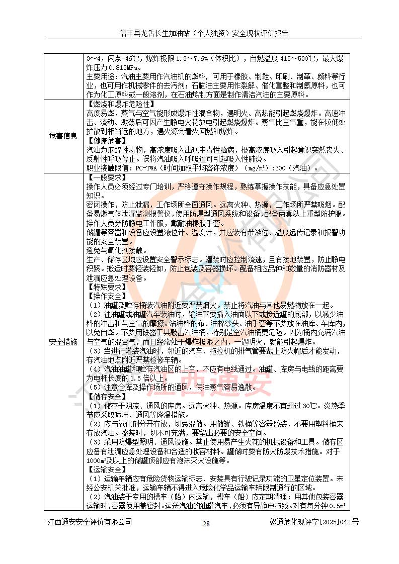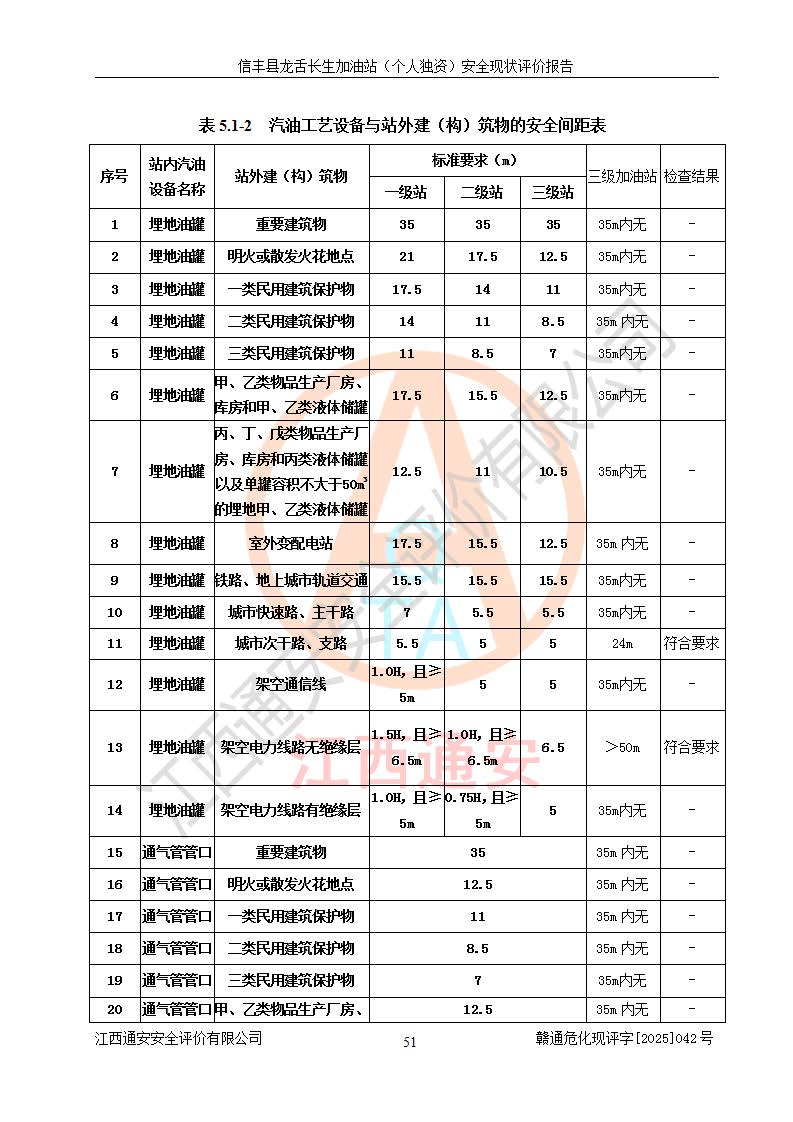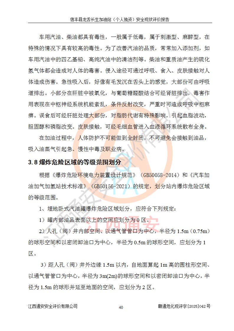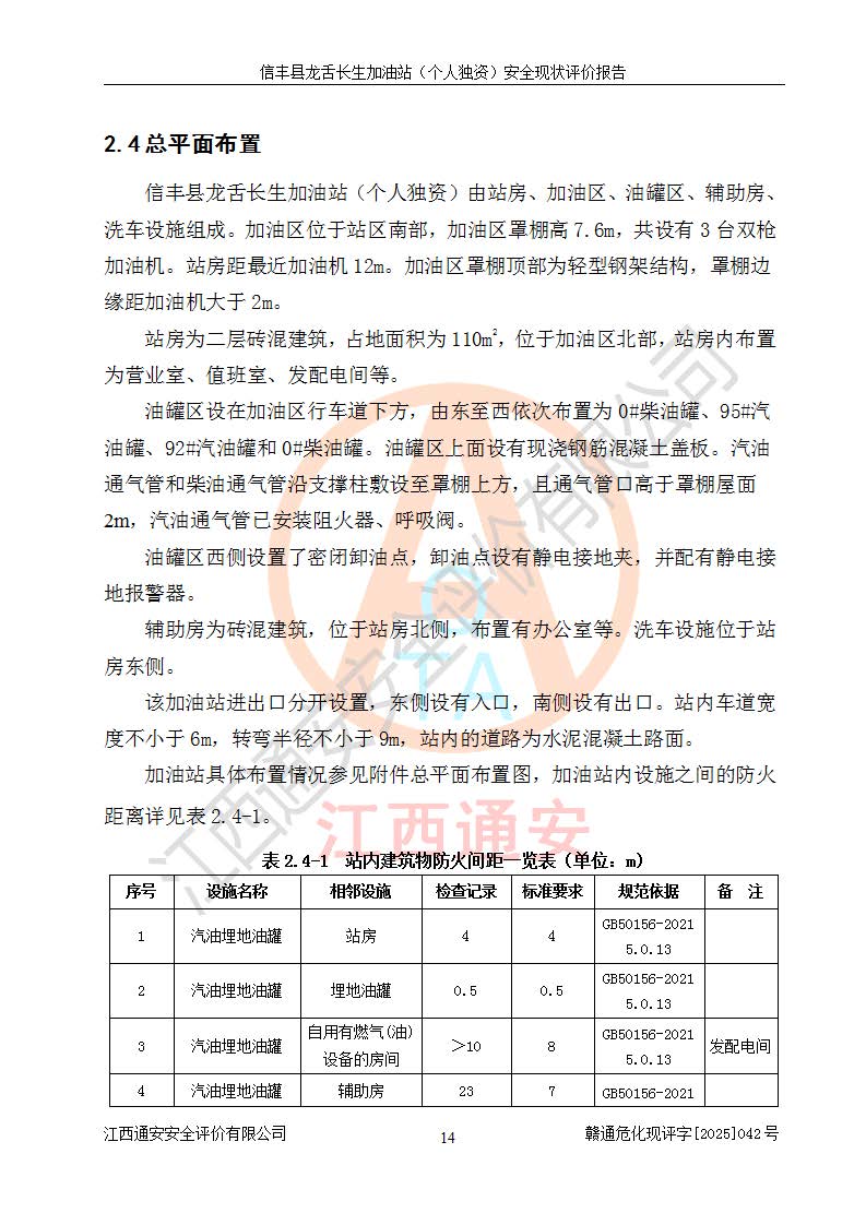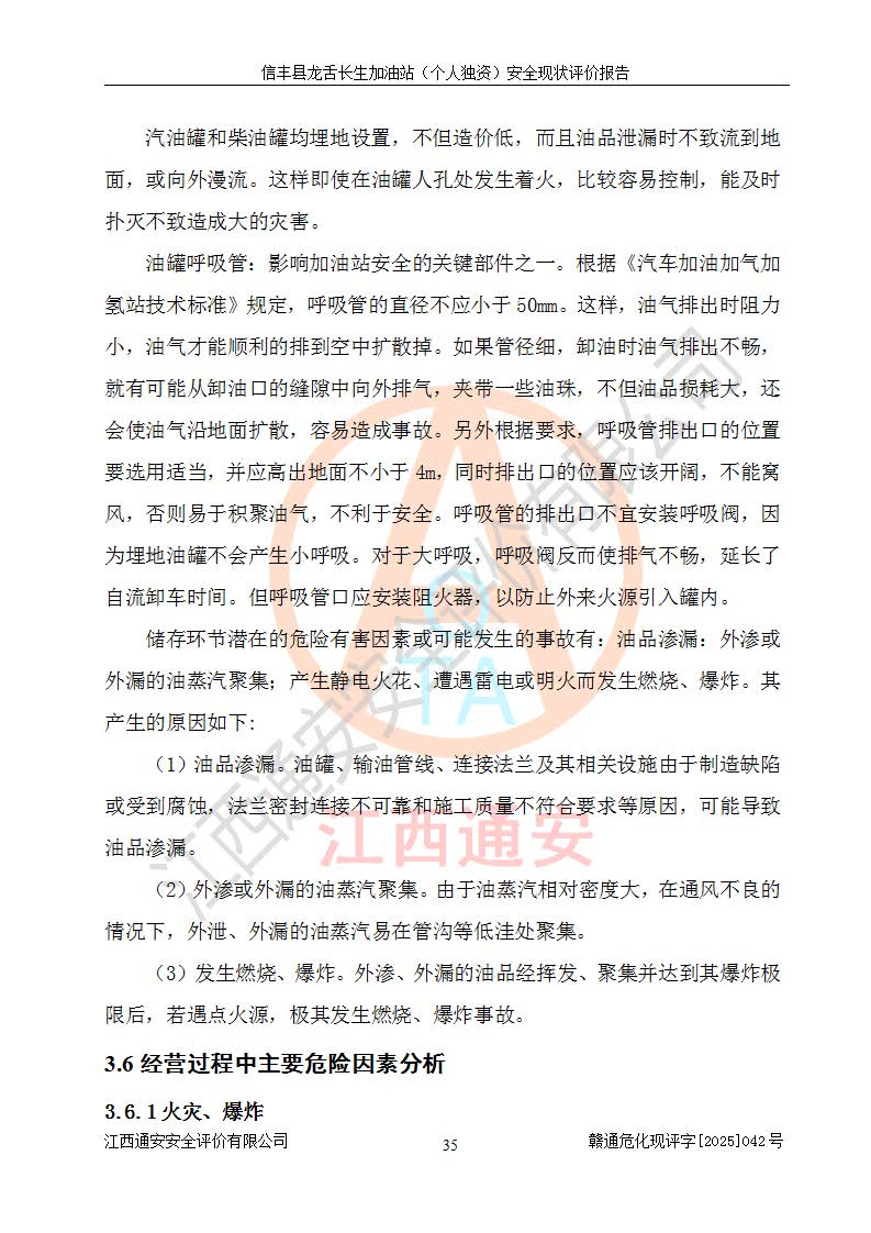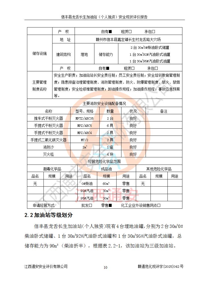 项目简介 | 信丰县龙舌长生加油站(个人独资)成立于2025年05月20日,由信丰县龙舌加油站核准登记为个人独资企业,地址位于赣州市信丰县嘉定镇长生村龙舌路大穴场,投资人为肖华,现有员工4人,其中安全管理人员1人,注册资本叁拾万元整,经营范围为一般项目:润滑油销售等。 信丰县龙舌长生加油站(个人独资),即信丰县龙舌加油站2022年10月24日取得了危险化学品经营许可证,证书编号为(赣)信行审危许字[2022]038号,经营方式为零售,许可范围为汽油、柴油,**期限为2022年10月25日至2025年10月24日。该加油站2020年08月17日取得了成品油零售经营批准证书,编号为油零售证书第虔0039号,**期限为2020年06月23日至2025年06月22日。加油站设有4台埋地油罐,分别为2台30m30#柴油卧式储罐、1台30m392#汽油卧式油罐和1台30m395#汽油卧式油罐,总储存能力为90m³(柴油折半),为三级加油站。加油区设有3台双枪加油机。该加油站目前运行正常。 | |||