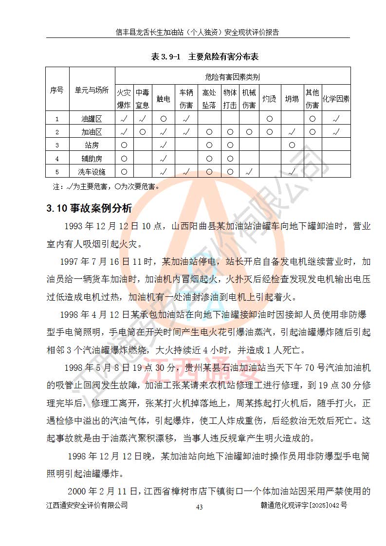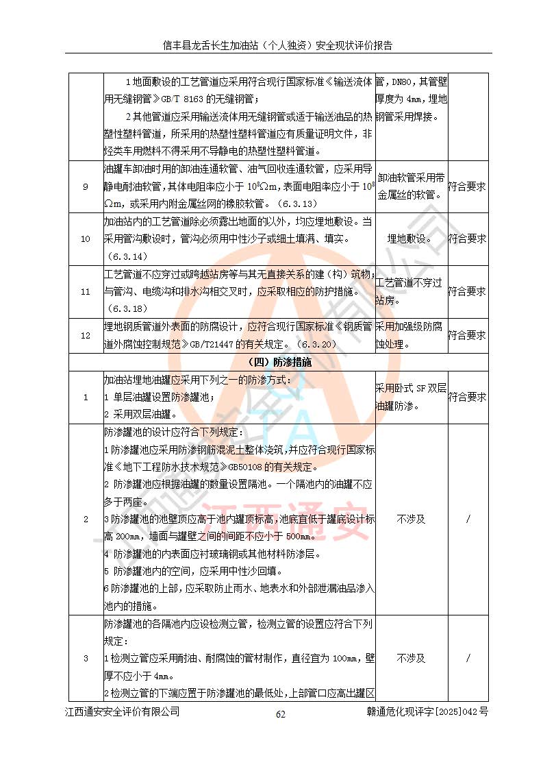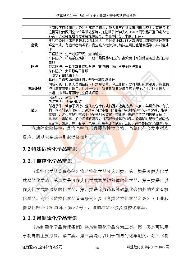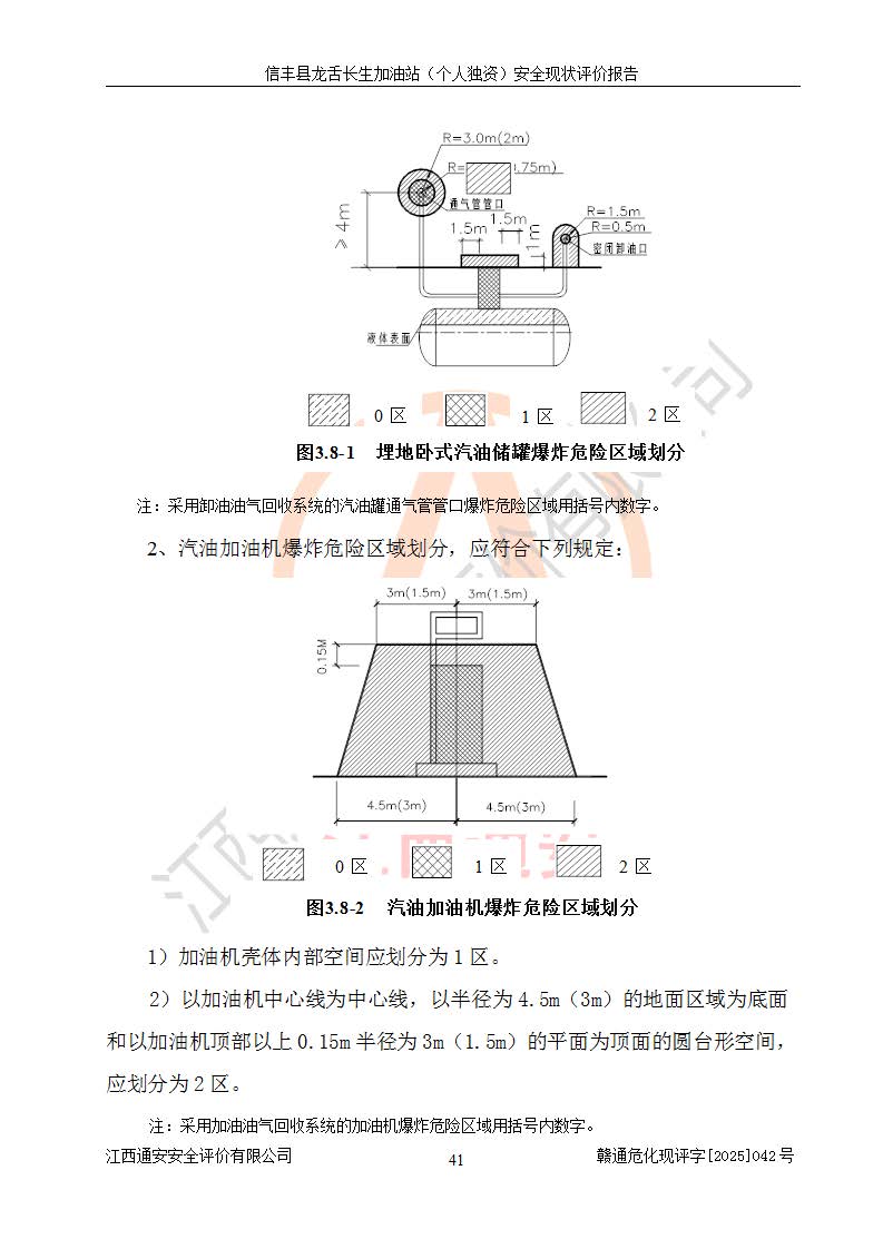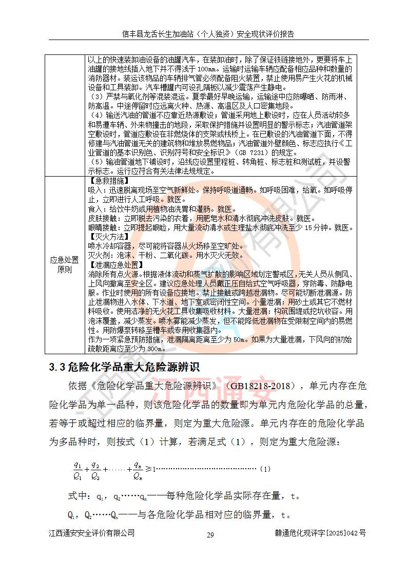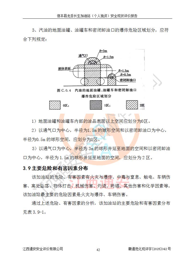 项目简介 | 信丰县龙舌长生加油站(个人独资)成立于2025年05月20日,由信丰县龙舌加油站核准登记为个人独资企业,地址位于赣州市信丰县嘉定镇长生村龙舌路大穴场,投资人为肖华,现有员工4人,其中安全管理人员1人,注册资本叁拾万元整,经营范围为一般项目:润滑油销售等。 信丰县龙舌长生加油站(个人独资),即信丰县龙舌加油站2022年10月24日取得了危险化学品经营许可证,证书编号为(赣)信行审危许字[2022]038号,经营方式为零售,许可范围为汽油、柴油,**期限为2022年10月25日至2025年10月24日。该加油站2020年08月17日取得了成品油零售经营批准证书,编号为油零售证书第虔0039号,**期限为2020年06月23日至2025年06月22日。加油站设有4台埋地油罐,分别为2台30m30#柴油卧式储罐、1台30m392#汽油卧式油罐和1台30m395#汽油卧式油罐,总储存能力为90m³(柴油折半),为三级加油站。加油区设有3台双枪加油机。该加油站目前运行正常。 | |||