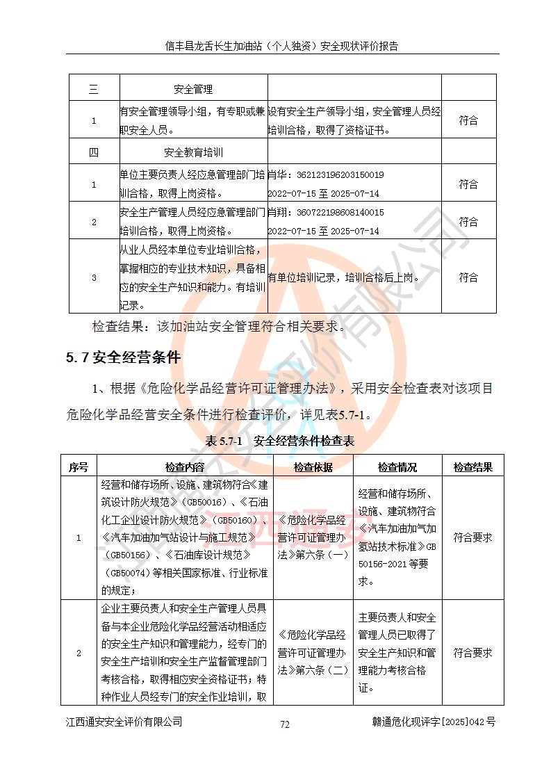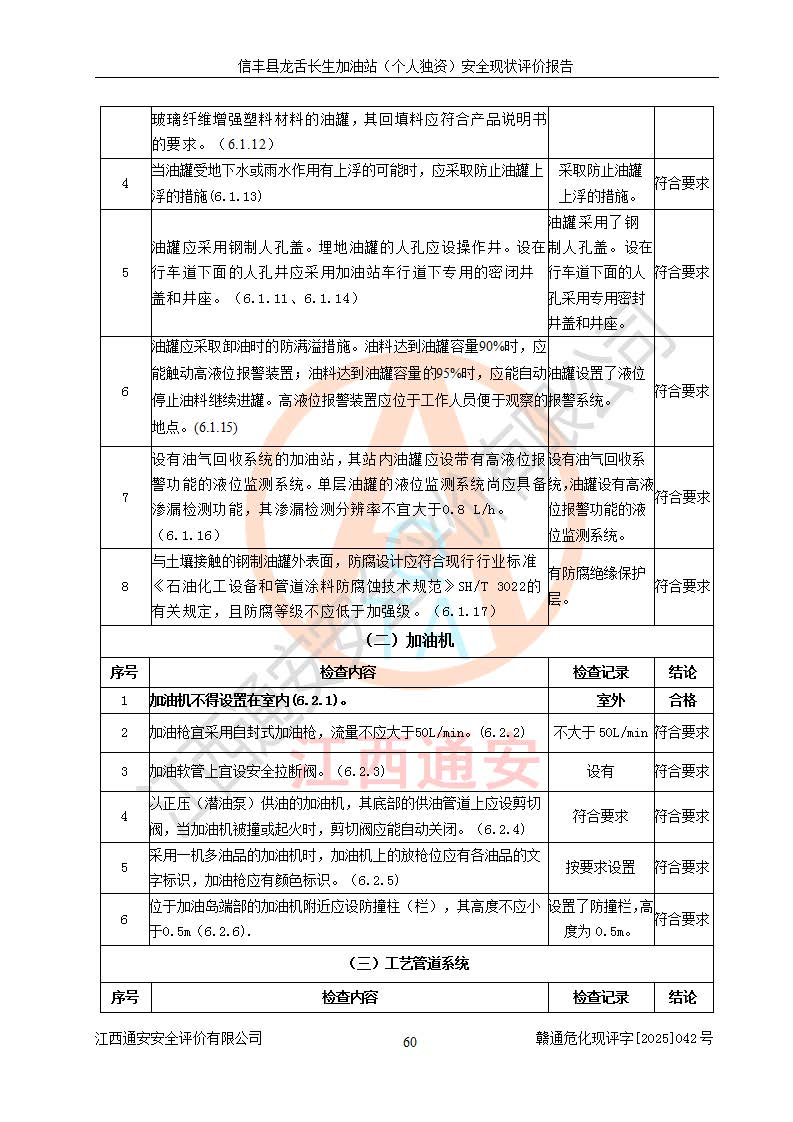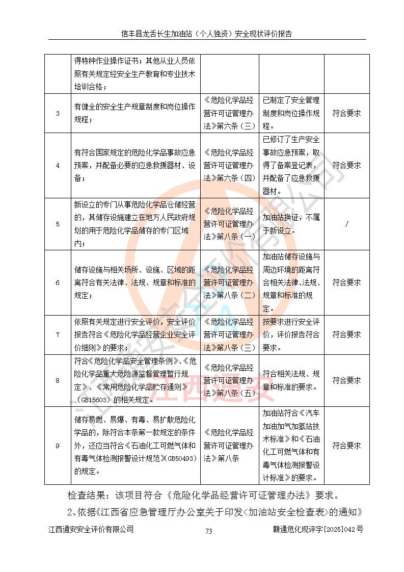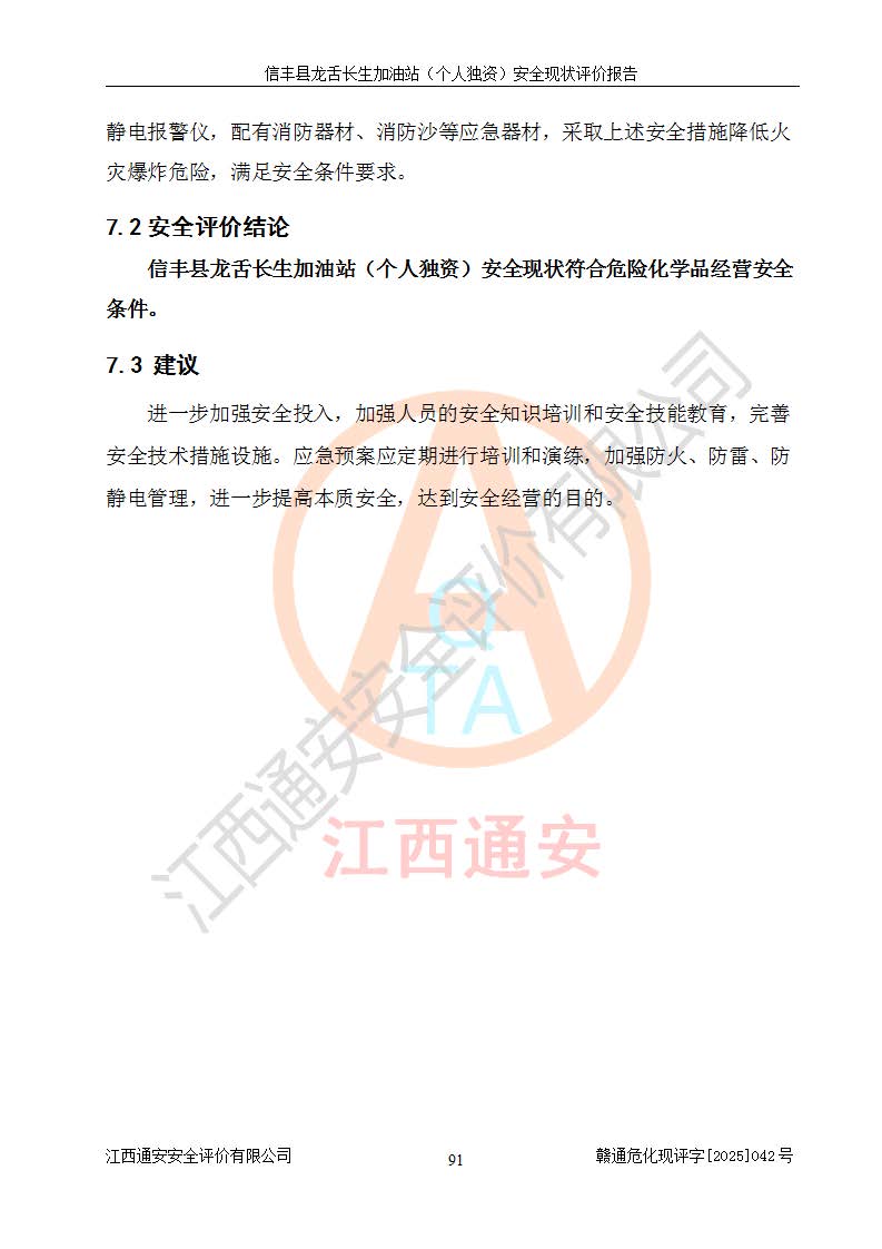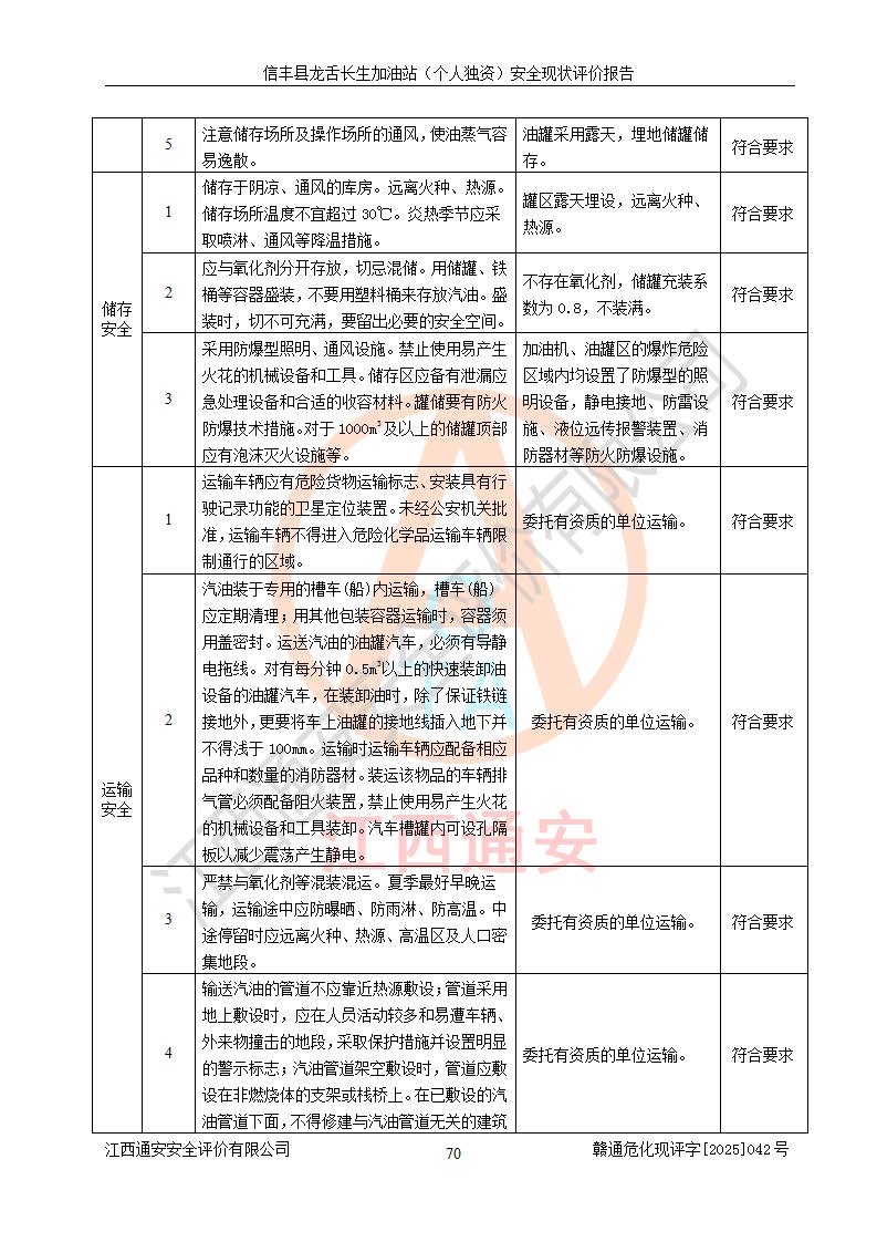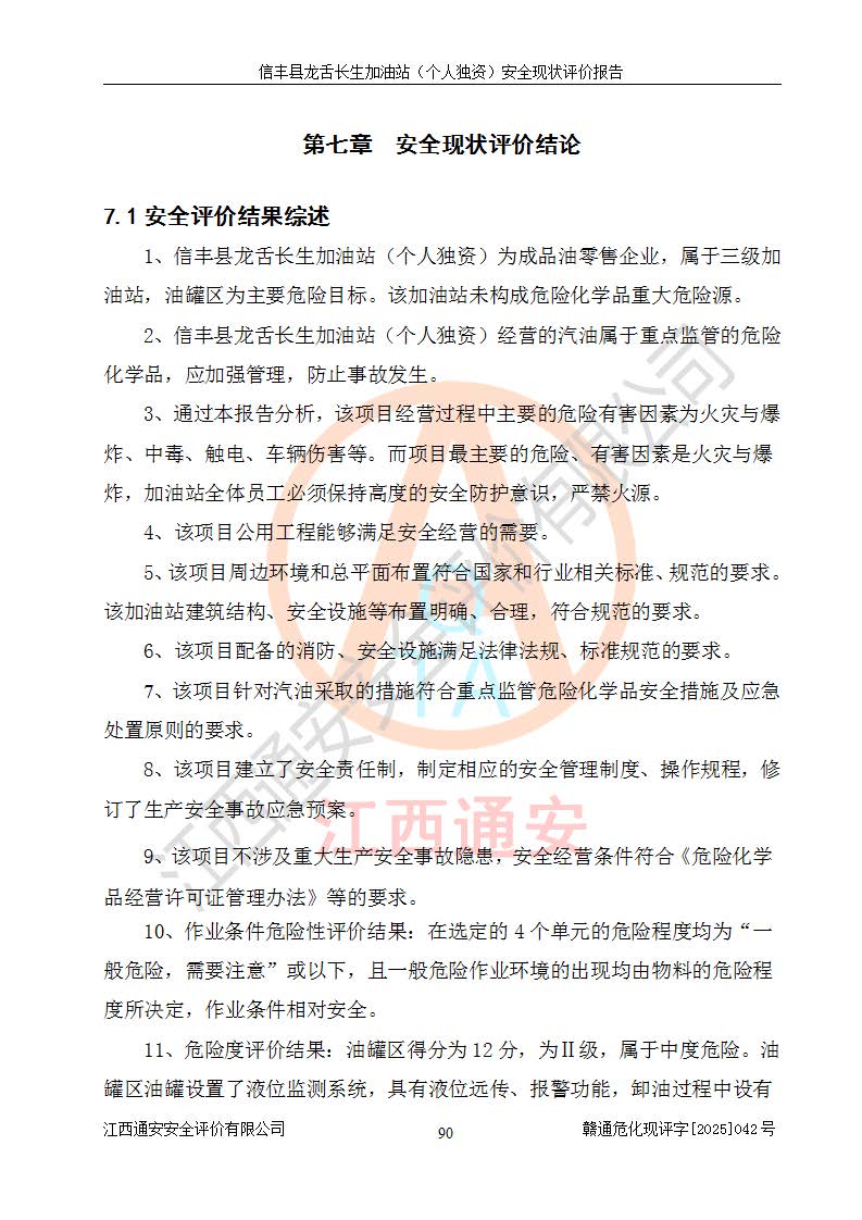 评价结论 | 信丰县龙舌长生加油站(个人独资)安全现状符合危险化学品经营安全条件。 | |||