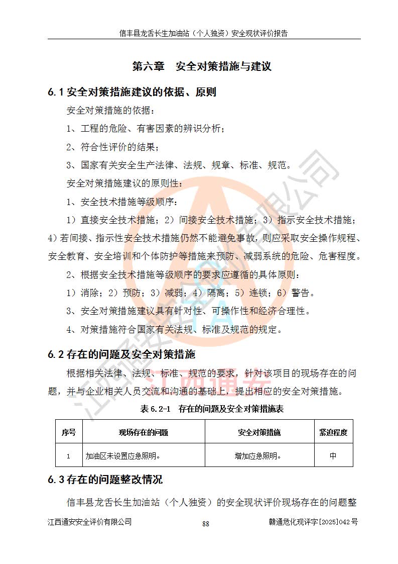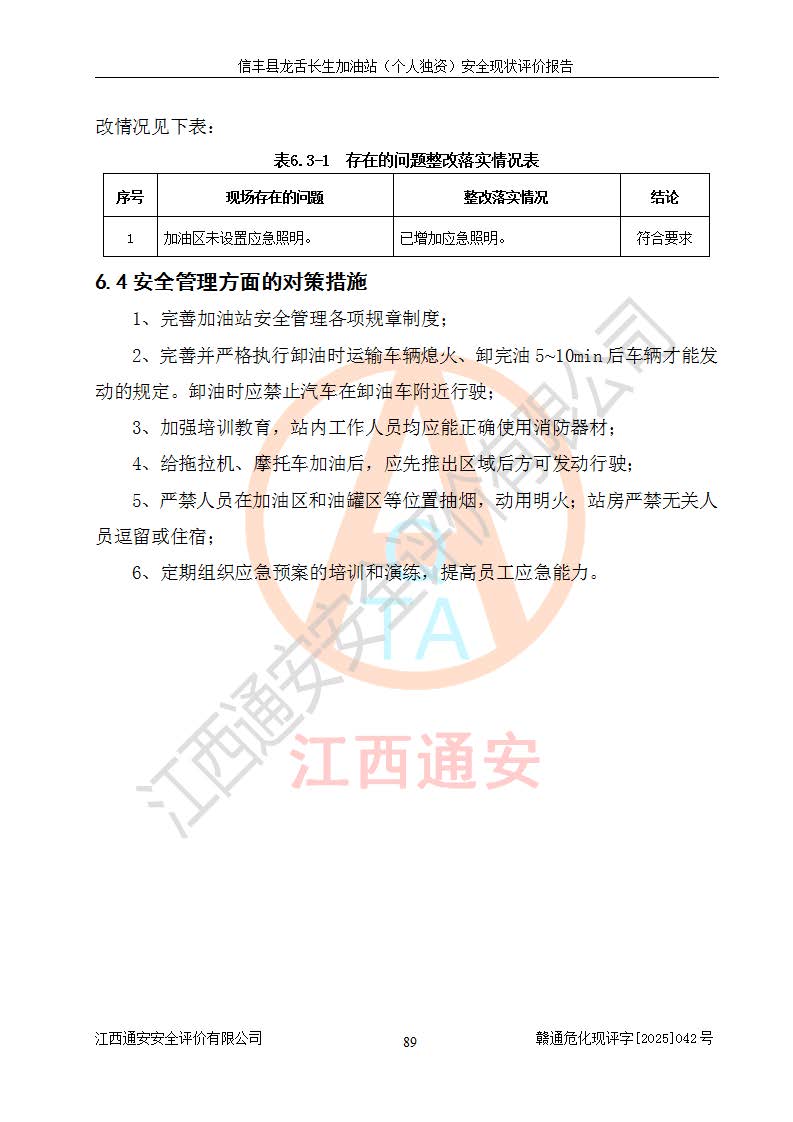 勘察现场发现的问题及安全对策措施 | 序号现场存在的问题安全对策措施1加油区未设置应急照明。增加应急照明。