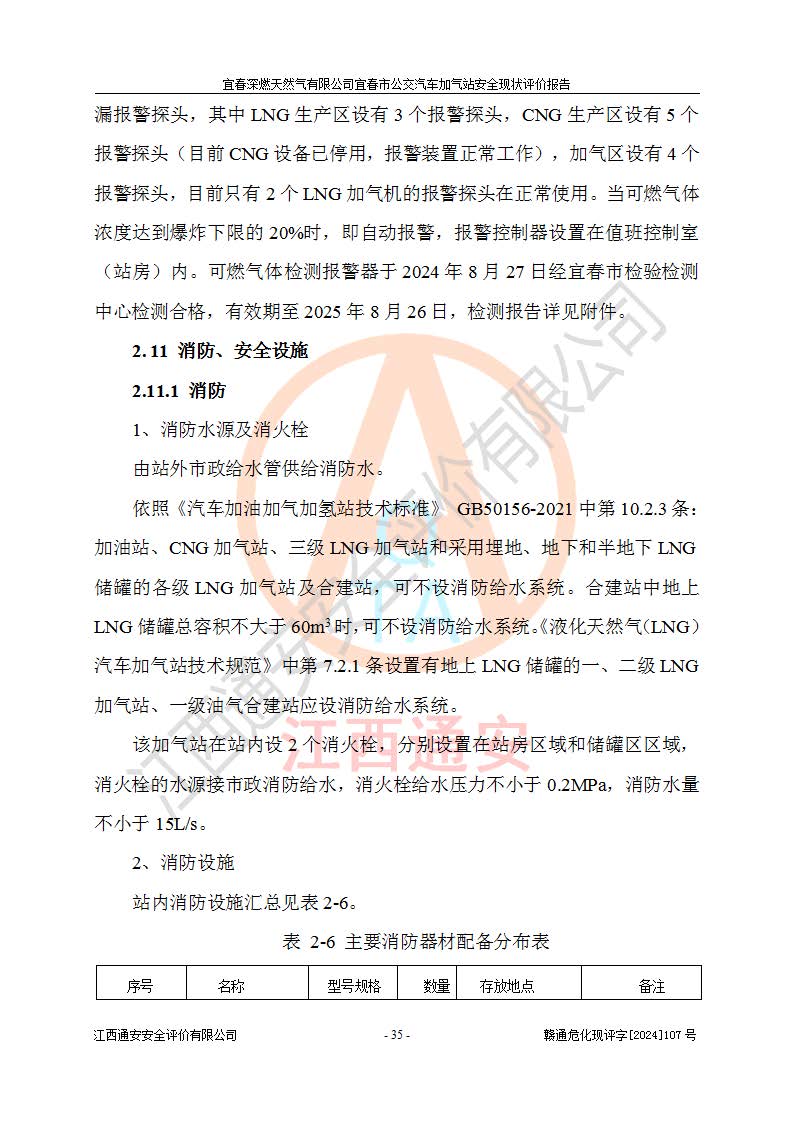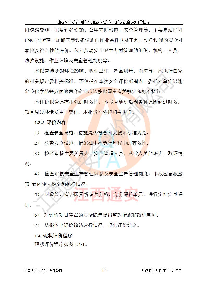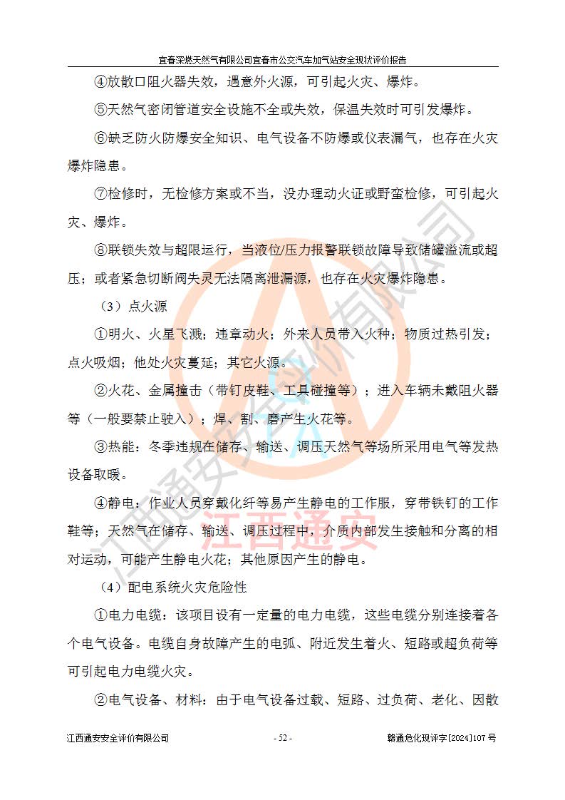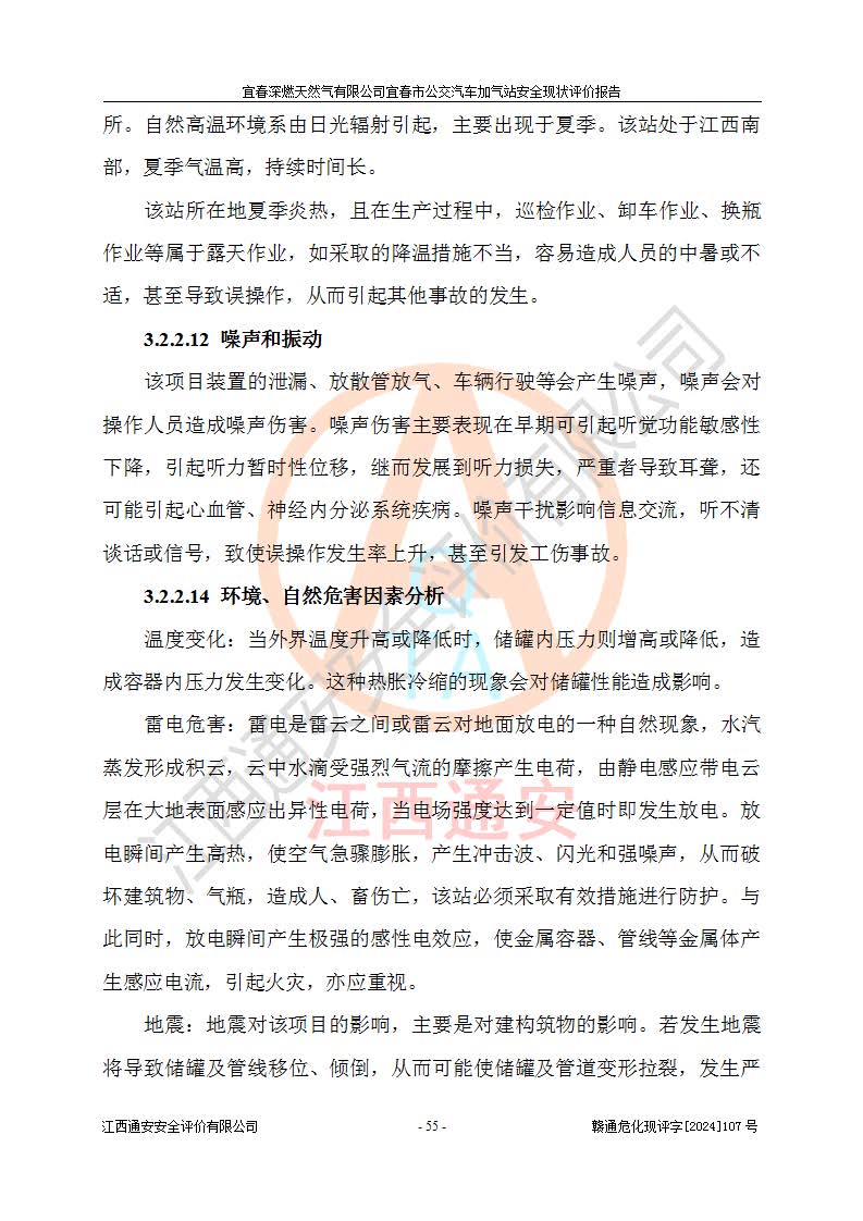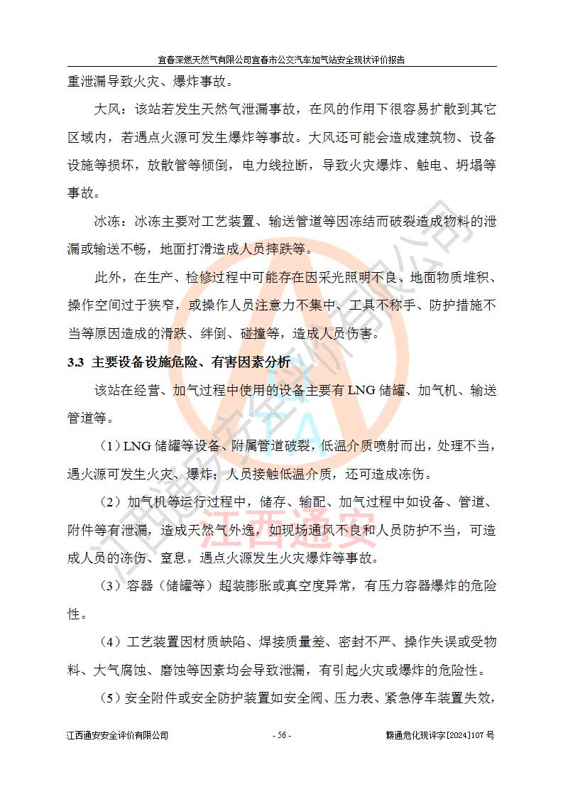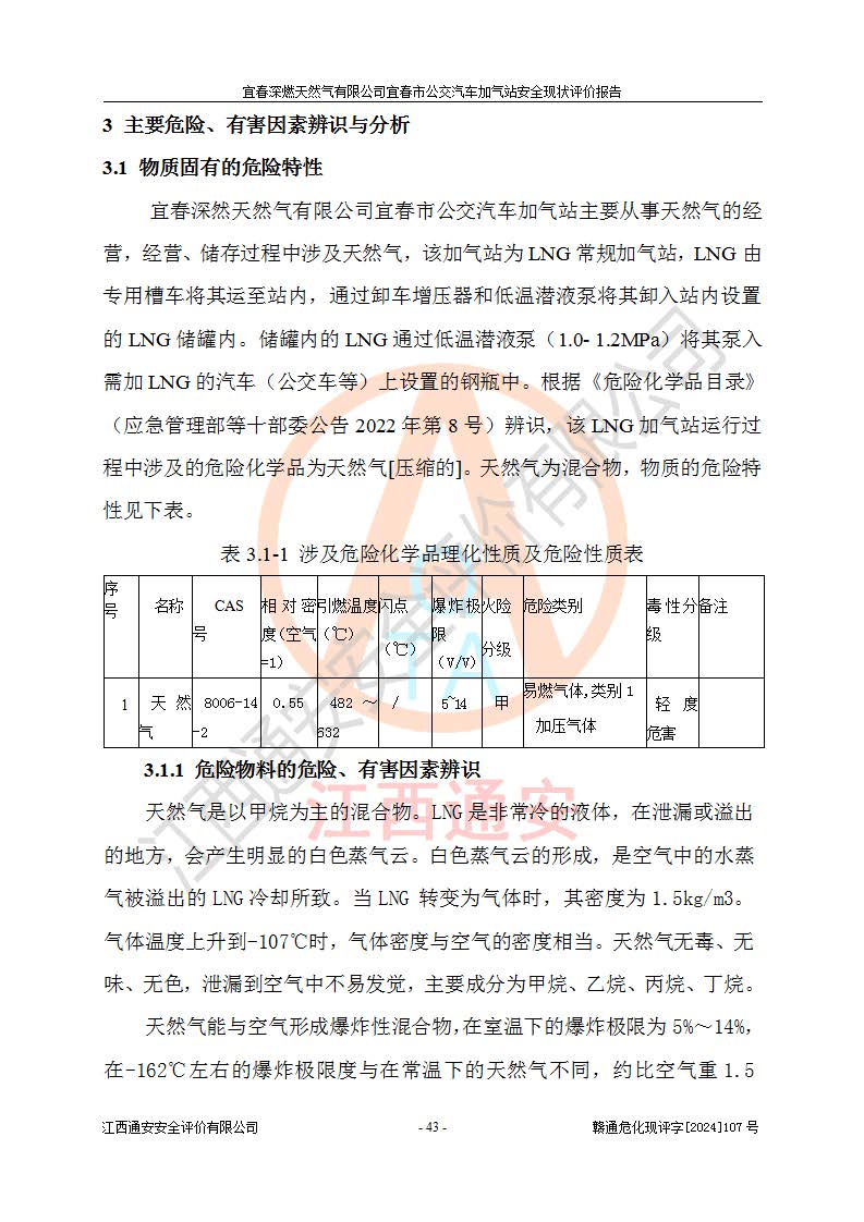 项目简介 | 宜春深燃天然气有限公司宜春市公交汽车加气站成立于2014年01月27日,注册地位于江西省宜春经济技术开发区,负责人为陈建刚。经营范围包括管道燃气业务经营,燃气输配管网的投资、建设和经营;宜春市城市天然气利用工程的开发、建设、经营;燃气器具、五金销售;承担燃气管道安装工程。(依法须经批准的项目,经相关部门批准后方可开展经营活动)。 宜春深燃天然气有限公司在江西省宜春市经济开发区经发大道西侧建有宜春市公交汽车加气站项目,该站于2013年8月20日建成,10月投产该加气站占地面积4774.32m2,为综合性天然气加气站,由于市场原因,CNG加气设备**停用,系统管道已**切断,目前只保留了LNG加气功能。本站设一个容积60m3的LNG储罐,两台LNG加气机,加气站储存总容积60m3 ,目前只作为LNG加气站使用的情况下,依据《汽车加油加气加氢技术标准》(GB50156-2021)该加气站为二级加气站。 宜春深燃天然气有限公司宜春市公交汽车加气站于2024年9月29日取得了燃气经营许可证,编号202308010011J,经营区域包括宜春市中心城区,许可证**期限为2024年9月29日至2026年1月22日,目前正在办理许可证延期手续。 根据《危险化学品目录》(2015年版)、应急管理部办公厅关于修改《危险化学品目录(2015年版)实施指南(试行)》涉及柴油部分内容的通知(应急厅函[2022]300号)和应急管理部 工业和信息化部 公安部 生态环境部 交通运输部 农业农村部 卫生健康委 市场监管总局 铁路局 民航局公告2022年第8号《决定调整《危险化学品目录(2015版)》,将“1674柴油[闭杯闪点≤60℃]”调整为“1674柴油”》的文件规定,该项目涉及危险化学品天然气(74-82-8),其中天然气属于重点监管的危险化学品。 根据《**安全监管总局关于公布首批重点监管的危险化工工艺目录的通知》(安监总管三【2009】116号)、《**安全监管总局关于公布第二批重点监管危险化工工艺目录和调整首批重点监管危险化工工艺中部分典型工艺的通知》(安监总管三【2013】3号)文件要求:该项目不涉及重点监管的危险化工工艺。 根据《危险化学品重大危险源辨识》(GB 18218-2018)进行辨识,该项目生产单元和储存设施单元不构成危险化学品重大危险源。