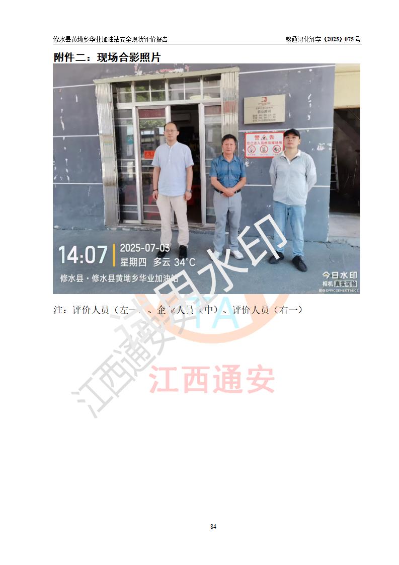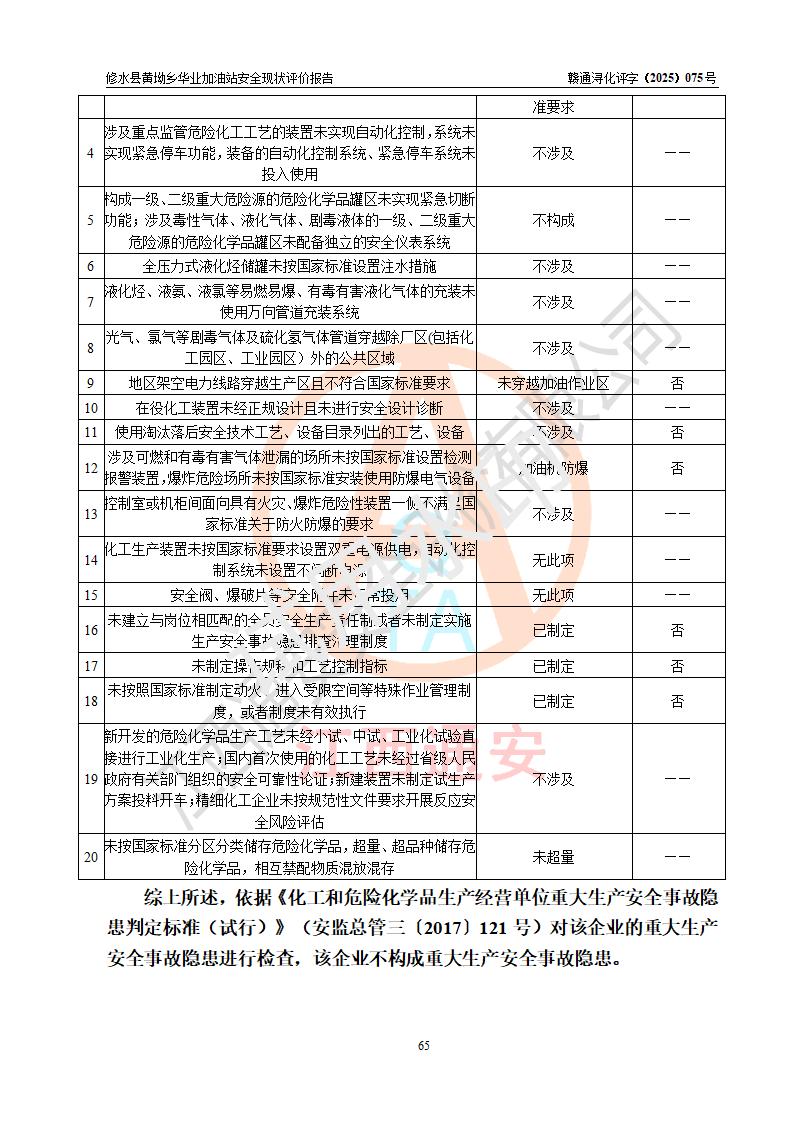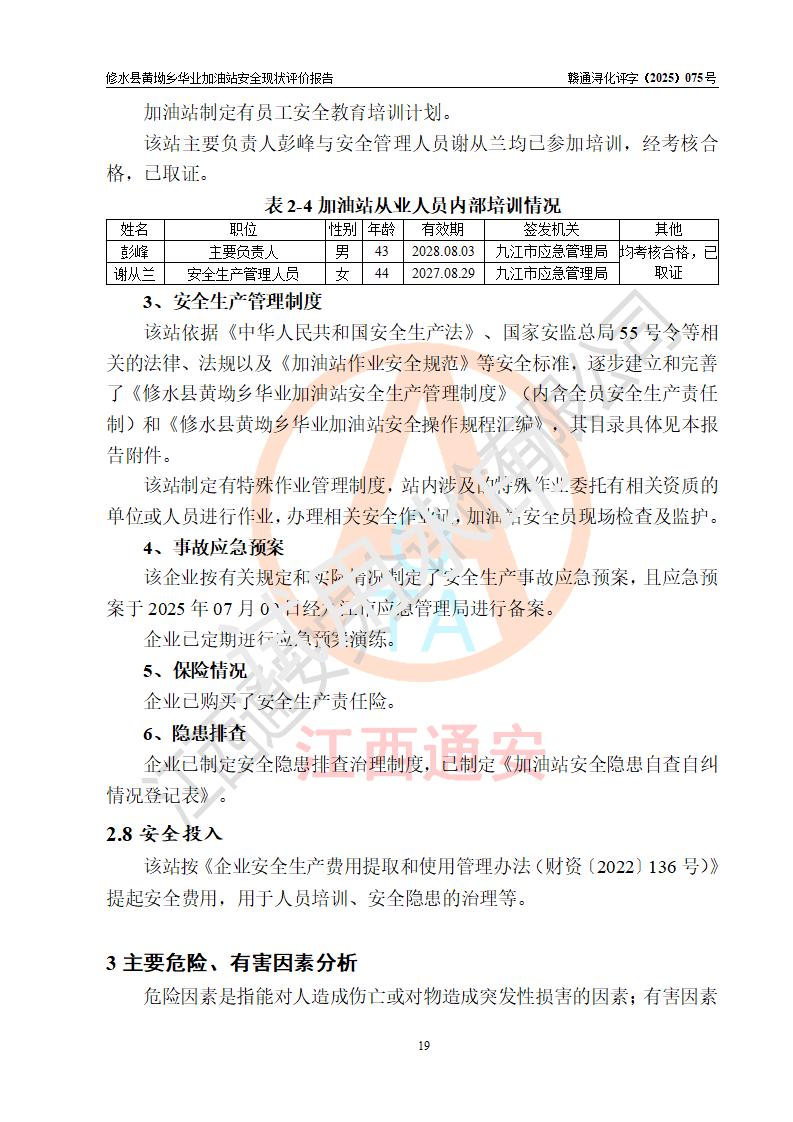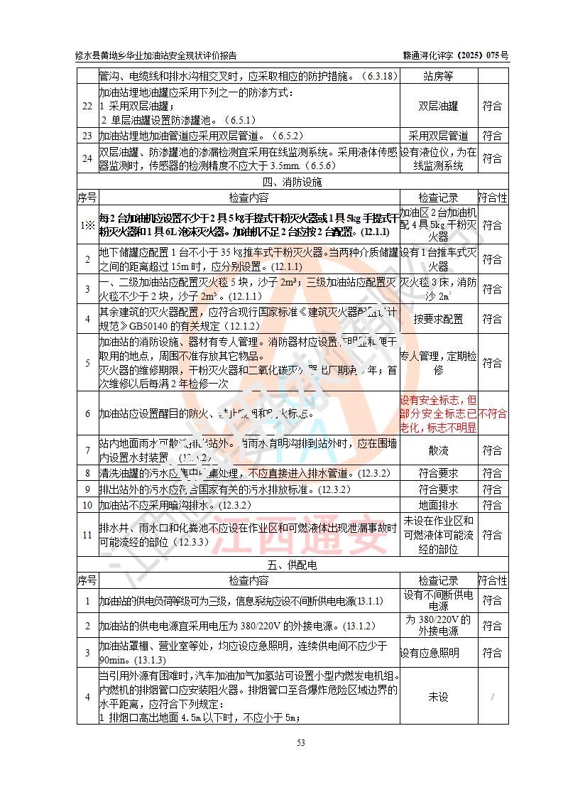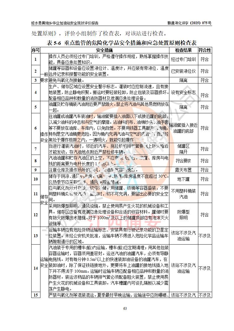 评价结论 | 修水县黄坳乡华业加油站涉及的安全条件、安全经营条件、安全生产管理符合《危险化学品经营许可证管理办法》、《汽车加油加气加氢站技术标准》等**有关法规、标准、规范要求,能满足危险化学品经营安全条件。 | |||