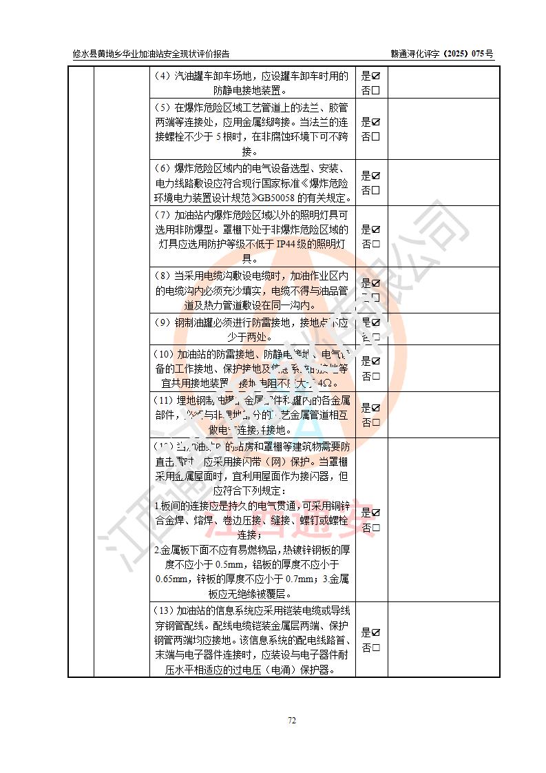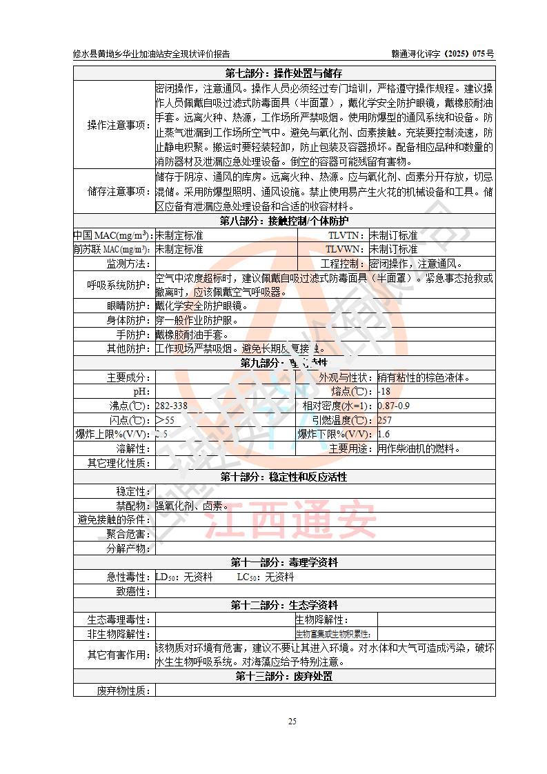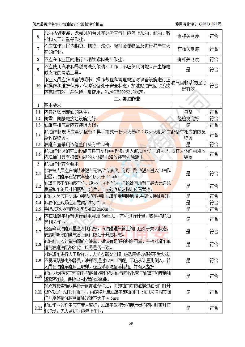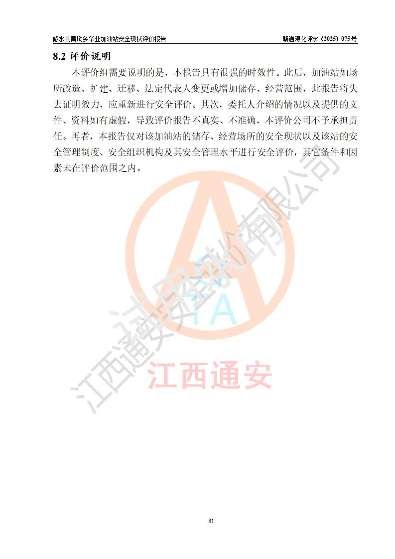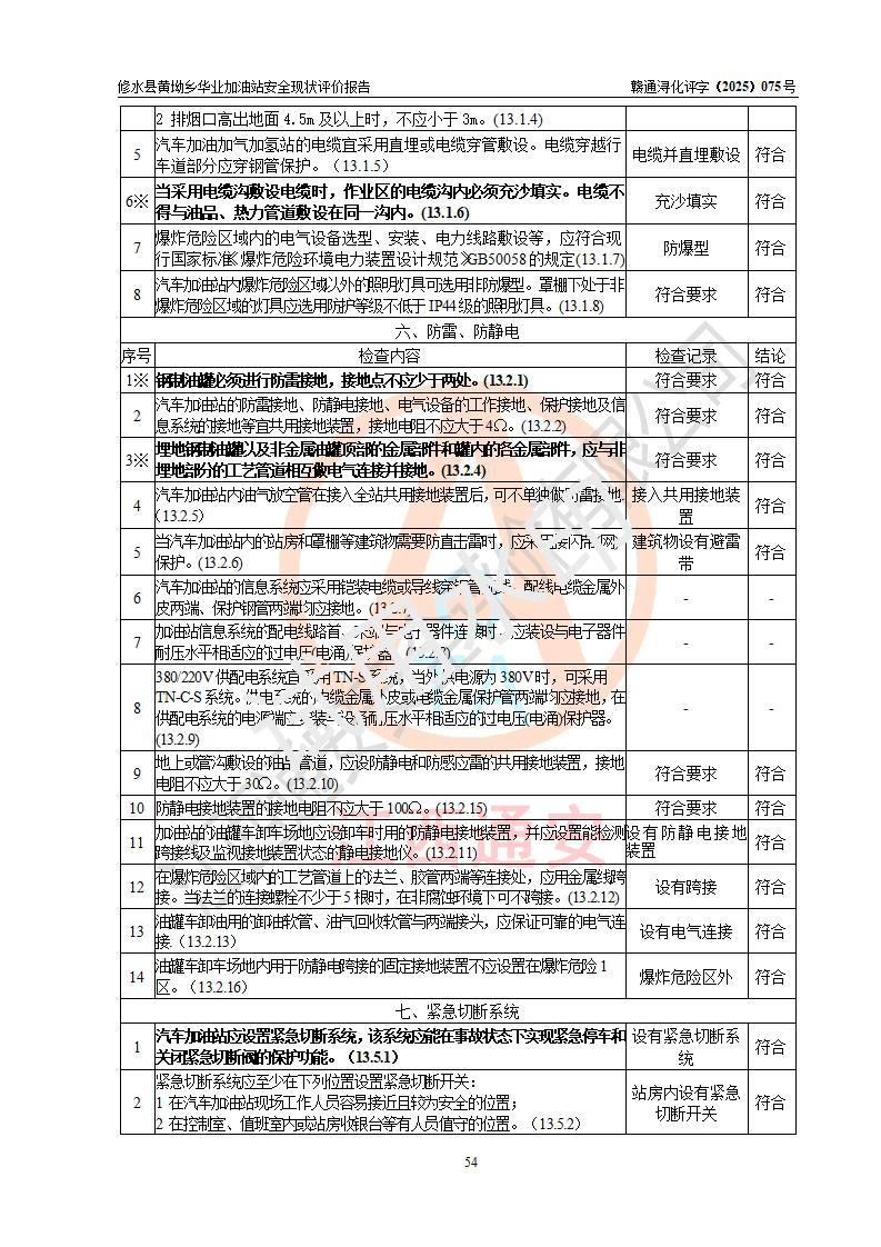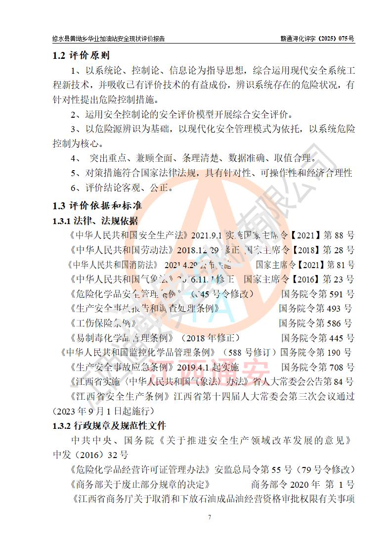 评价结论 | 修水县黄坳乡华业加油站涉及的安全条件、安全经营条件、安全生产管理符合《危险化学品经营许可证管理办法》、《汽车加油加气加氢站技术标准》等**有关法规、标准、规范要求,能满足危险化学品经营安全条件。 | |||