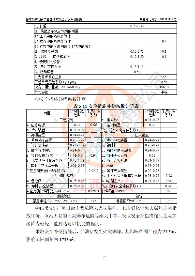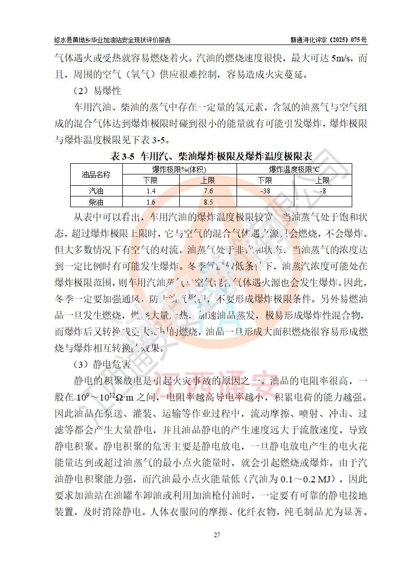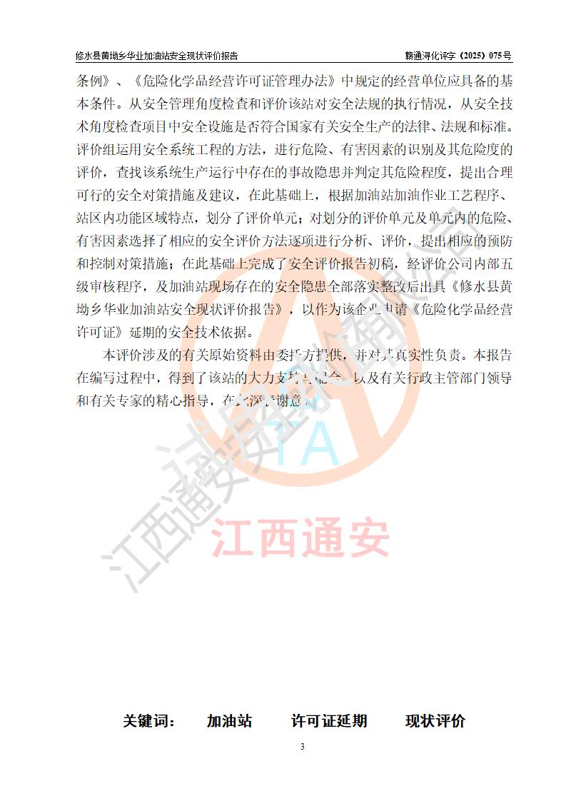 项目简介 | 修水县黄坳乡华业加油站是一家专门从事成品油零售经营的个体工商户,经营场所位于江西省九江市修水县黄坳乡塘排镇。现有从业人员4名,其中安全管理人员1人,加油站负责人彭峰。 该加油站占地面积约760m2,站区内设置有2台双枪程控燃油加油机及配套的工艺管线、设有SF双层储罐3台,其中30m3的0#柴油储罐1台、30m3的92#汽油储罐1台,30m3的95#汽油储罐1台,油品储罐总容积为90m3(折算成汽油为75m3),按现行《汽车加油加气加氢站技术标准》对加油站的等级划分原则,属三级加油站。 该站由九江市行政审批局换发《危险化学品经营许可证》(证号:赣九行审经(甲)字[2022]0000182号),**期限2022年12月26日至2025年12月25日。 | |||