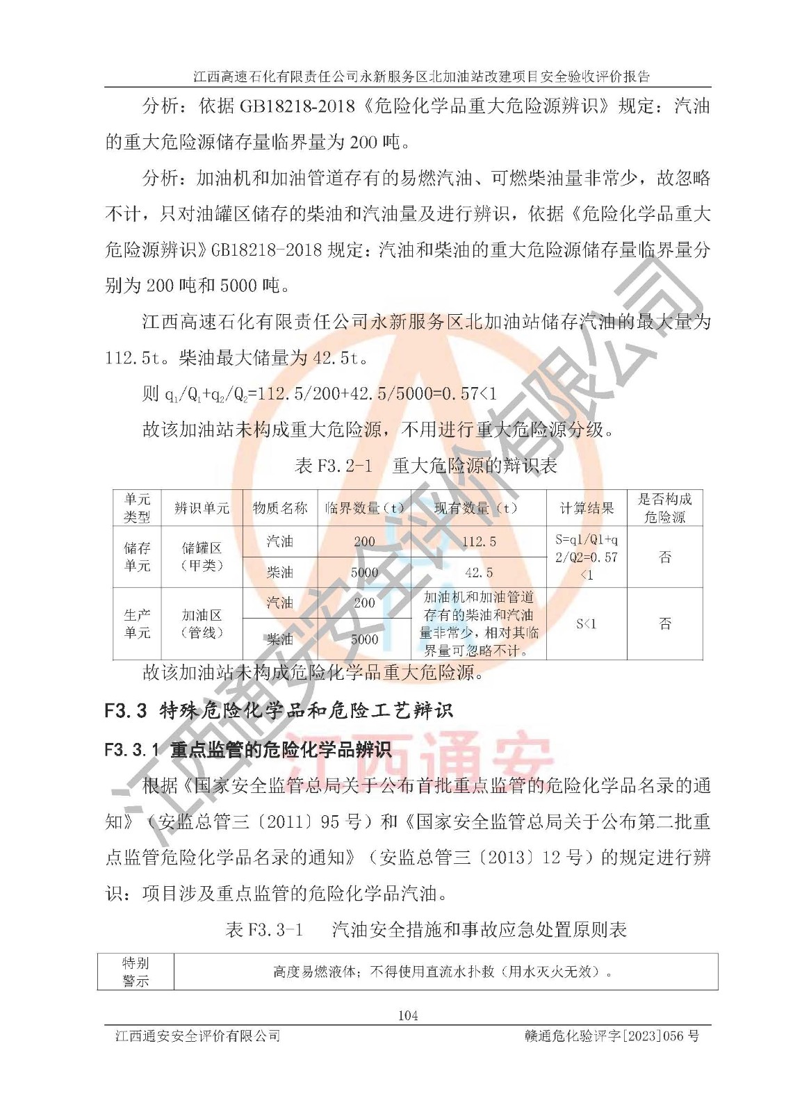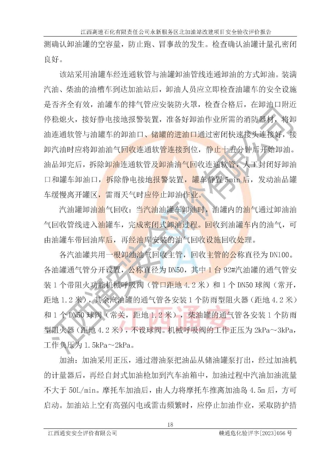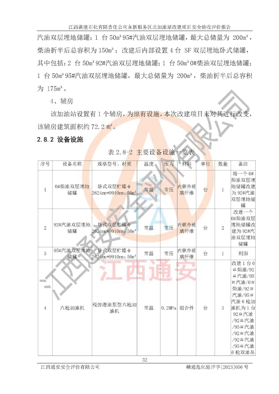 项目简介 | 江西高速石化有限责任公司永新服务区北加油站成立于2019年2月2日,类型:其他有限责任公司分公司;负责人:陈志斌;经营场所为江西省吉安市永新县吉莲高速永新服务区北。该公司营业执照经营范围:石油、石油化工、化纤及其他化工产品的销售;光伏、充电桩、日用百货便利店经营:汽车清洗服务:广告位出租:房屋租赁:食品、计生用品、零售卷烟、雪茄烟:委托代理收取水电费:销售润滑油、燃油料。(依法须经批准的项目,经相关部门批准后方可开展经营活动)。 该加油站于2023年12月4日经吉安市商务局核准变更换发成品油零售经营批准证书,证书编号:油零售证书第吉0300号。**期由2023年12月4日至2028年12月3日。于2023年11月16日由吉安市应急管理局变更发放危险化学品经营许可证,证书编号:赣吉危化经字【2022】360800000011。**期由2022年1月31日至2025年1月30日。 为提升优化加油站的整体布局,更好满足运营服务的需求,同时迎合吉莲高速日益增长的**,江西高速石化有限责任公司永新服务区北加油站决定在原址基础上进行改建,并于2023年3月17日获得永新县工业和信息化局盖章的《江西省工业企业技术改造项目备案通知书》,同意该站在原址上改建。 江西高速石化有限责任公司永新服务区北加油站改建项目位于江西省吉安市永新县吉莲高速永新服务区北,加油站用地面积约2000m2。 该加油站改建前设有4个SF双层埋地储罐,分别为:1台50m³92#汽油双层埋地储罐,1台50m³的95#汽油双层埋地储罐;2 台50m³的0#柴油双层埋地储罐;柴油折半后总容积为 150 m³,属二级加油站。设有3个六枪3油品潜油泵加油机,分别为:1台0#柴油/92#汽油/95#汽油/0#柴油/92#汽油/95#汽油6枪加油机,1台0#柴油/92#汽油/95#汽油/0#柴油/92#汽油/95#汽油6枪加油机,1台0#柴油/92#汽油/95#汽油/0#柴油/92#汽油/95#汽油6枪加油机。 改建后情况如下:在原有罐区位置上将1台50m³0#柴油双层埋地储罐改造为1台50m³的92#汽油双层埋地储罐,更换后设置4台SF双层埋地储罐,其中包括:2台50m³的92#汽油双层埋地储罐;1台50m³的95#汽油双层埋地储罐;1台50m³的0#柴油双层埋地储罐;改建后*大总储量为200m³,柴油折半后总容积为175m³,加油站等级由原来的二级变为一级,设有1台92#汽油/92#汽油/95#汽油/0#柴油/92#汽油/95#汽油6枪3油品加油机,1台0#柴油/92#汽油/95#汽油/0#柴油/92#汽油/95#汽油6枪3油品加油机,1台92#汽油/92#汽油/95#汽油/92#汽油/92#汽油/95#汽油6枪双油品加油机,设有1个尿素加注机(防爆,按柴油加油机确认)。加油站内其他设施利旧。 江西高速石化有限责任公司永新服务区北加油站2022年12月委托江西赣安安全生产科学技术咨询服务中心编制《江西高速石化有限责任公司永新服务区北加油站改建项目安全预评价报告》,并于2023年4月12日取得《危险化学品建设项目安全条件备案告知意见书》(吉市危化项目安条审字[2023]3号)。 江西高速石化有限责任公司永新服务区北加油站2023年4月委托哈尔滨天源石化工程设计有限责任公司编制《江西高速石化有限责任公司永新服务区北加油站改建项目安全设施设计》,并于2023年5月19日取得《危险化学品建设项目安全设施设计审查意见书》(吉市危化项目安设审字〔2023〕11号)。