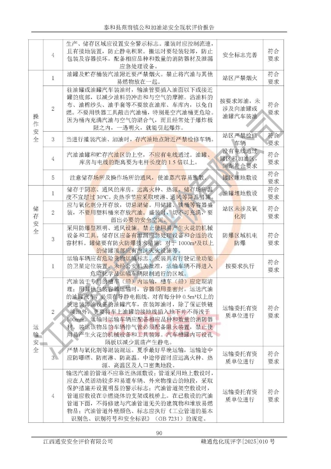 其它 | 在对该项目危险、有害因素辨识分析的基础上,运用安全检查表、预作业条件危险性分析法、危险度评价、重大事故后果分析结果等评价方法对该项目进行了分析评价,评价结果如下: 1、该项目位于江西省吉安市泰和县苑前镇,符合当地规划,与周边环境的距离符合有关标准、规范的要求。 2、总图布置分区明确,布局合理,各建构筑物的防火间距满足规范要求。 3、该项目无**明令淘汰的工艺,设备、设施与工艺条件、内部介质相适应,特种设备及设施较齐全,按规定设置防雷、防静电接地,爆炸危险环境加油机按要求采用防爆型,符合相关标准规范要求。 5、企业设置了安全生产管理机构,配备了专职安全生产管理人员,建立了安全生产责任制和安全生产管理制度,编制了岗位操作规程,编制了生产安全事故应急预案,人员经过相应的培训,企业的安全生产管理正常。 6、作业条件危险性评价结果:在选定的评价单元中,作业危险程度均为“一般危险,需要注意”,作业条件相对安全。 7、危险度评价结果:汽油储罐的危险程度为低度危险。油罐采用双层罐埋地设置,按要求设置了通气管,并装设了阻火器;设置了液位监测报警系统和紧急切断系统,其安全风险可控。 评价结论: 泰和县苑前镇公和加油站工艺设备和安全设施运行正常,安全管理机制运行正常,安全设施、措施达到设计要求和预期结果,可以满足建设项目安全生产的要求,安全生产管理**,项目具备危险化学品经营单位安全经营条件的要求。 | ||||