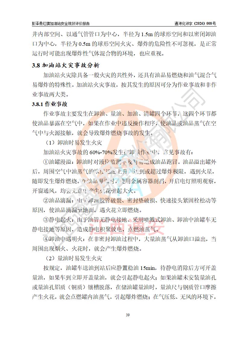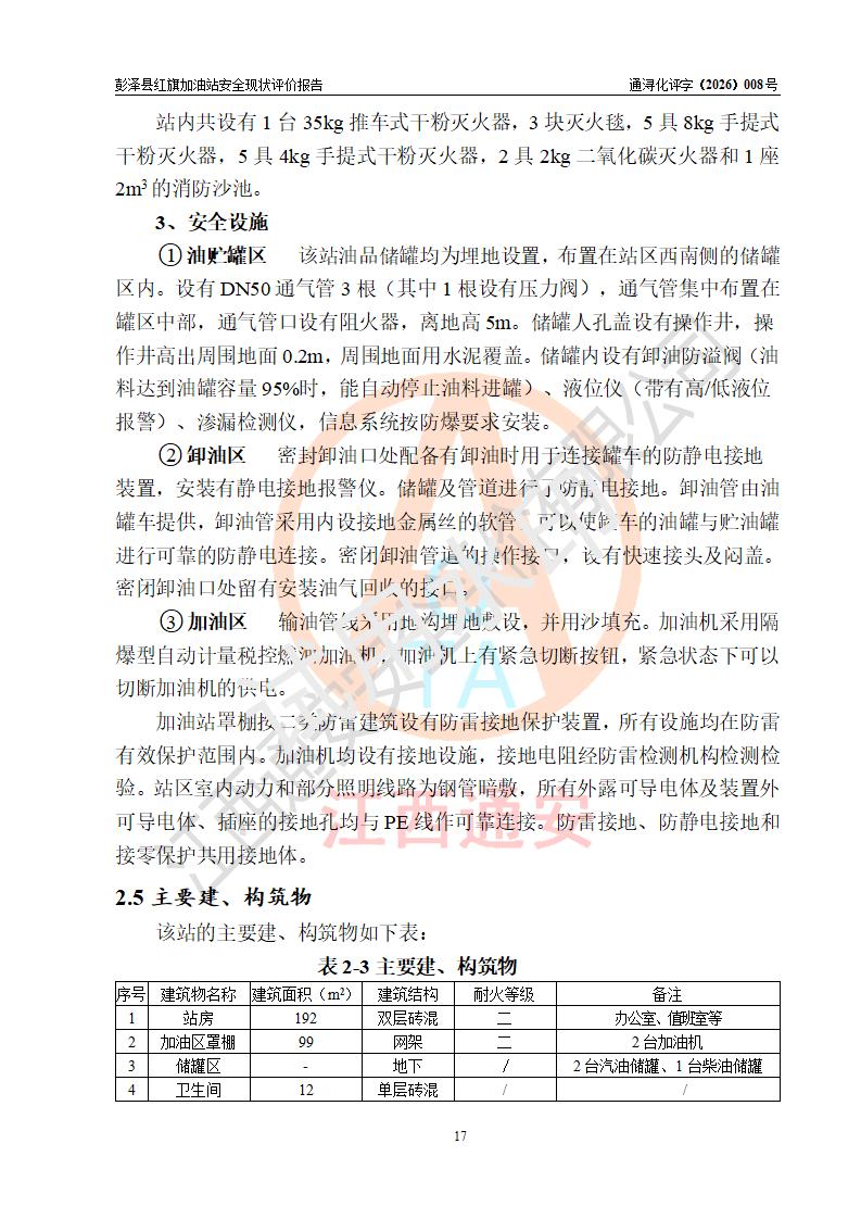 项目简介 | 彭泽县红旗加油站是一家专门从事成品油零售经营的个体工商户,经营场所位于江西省九江市彭泽县杨梓镇红旗村。现有从业人员3名,其中安全管理人员1人,加油站负责人陈贵松。 该加油站占地面积为1376.2m2,站区内设置有2台双枪程控燃油加油机及配套的工艺管线,设有SF双层储罐3台,其中30m3的0#柴油储罐1台、30m3的92#汽油储罐1台、30m3的95#汽油储罐1台,油品储罐总容积为90m3(折算成汽油为75m3),按现行《汽车加油加气加氢站技术标准》对加油站的等级划分原则,属三级加油站。 该站由九江市行政审批局换发《危险化学品经营许可证》(证号:赣九行审经(甲)字[2023]000016号),**期限2023年04月18日至2026年04月17日。 | |||
