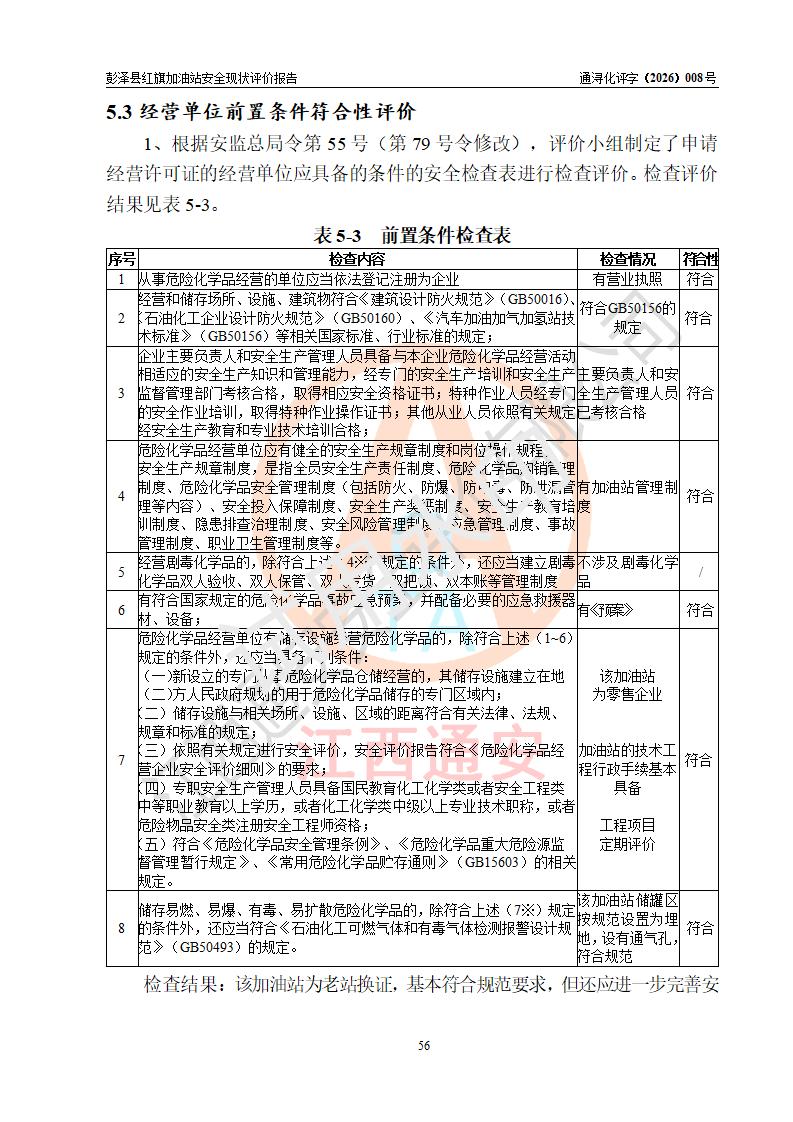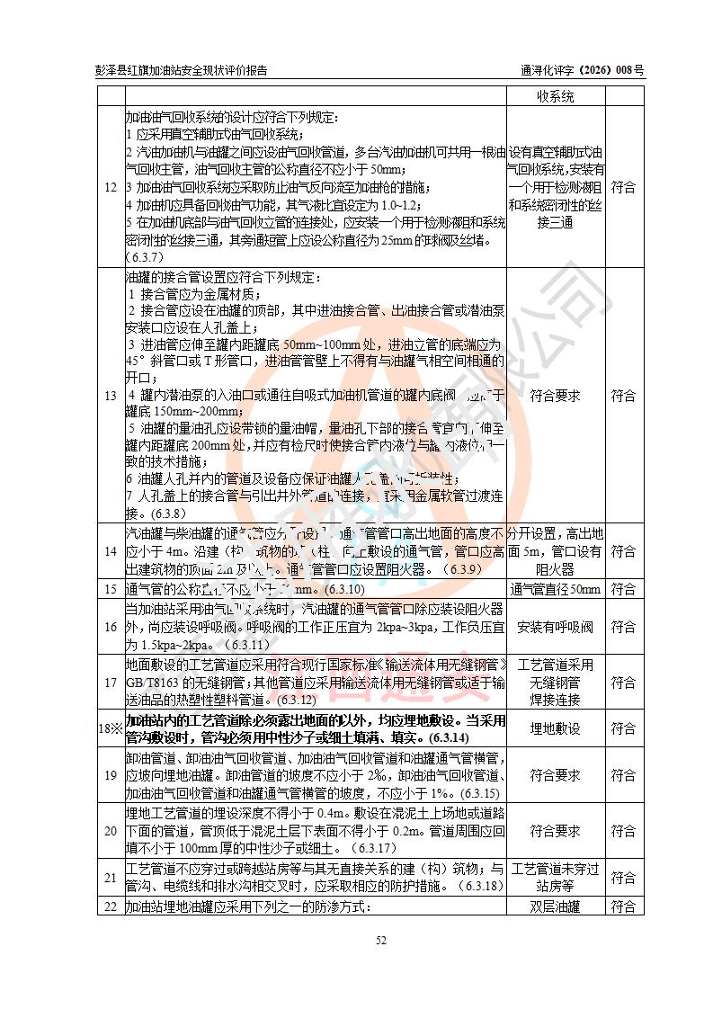 评价结论 | 彭泽县红旗加油站涉及的安全条件、安全经营条件、安全生产管理符合《危险化学品经营许可证管理办法》、《汽车加油加气加氢站技术标准》等**有关法规、标准、规范要求,能满足危险化学品经营安全条件。 | |||