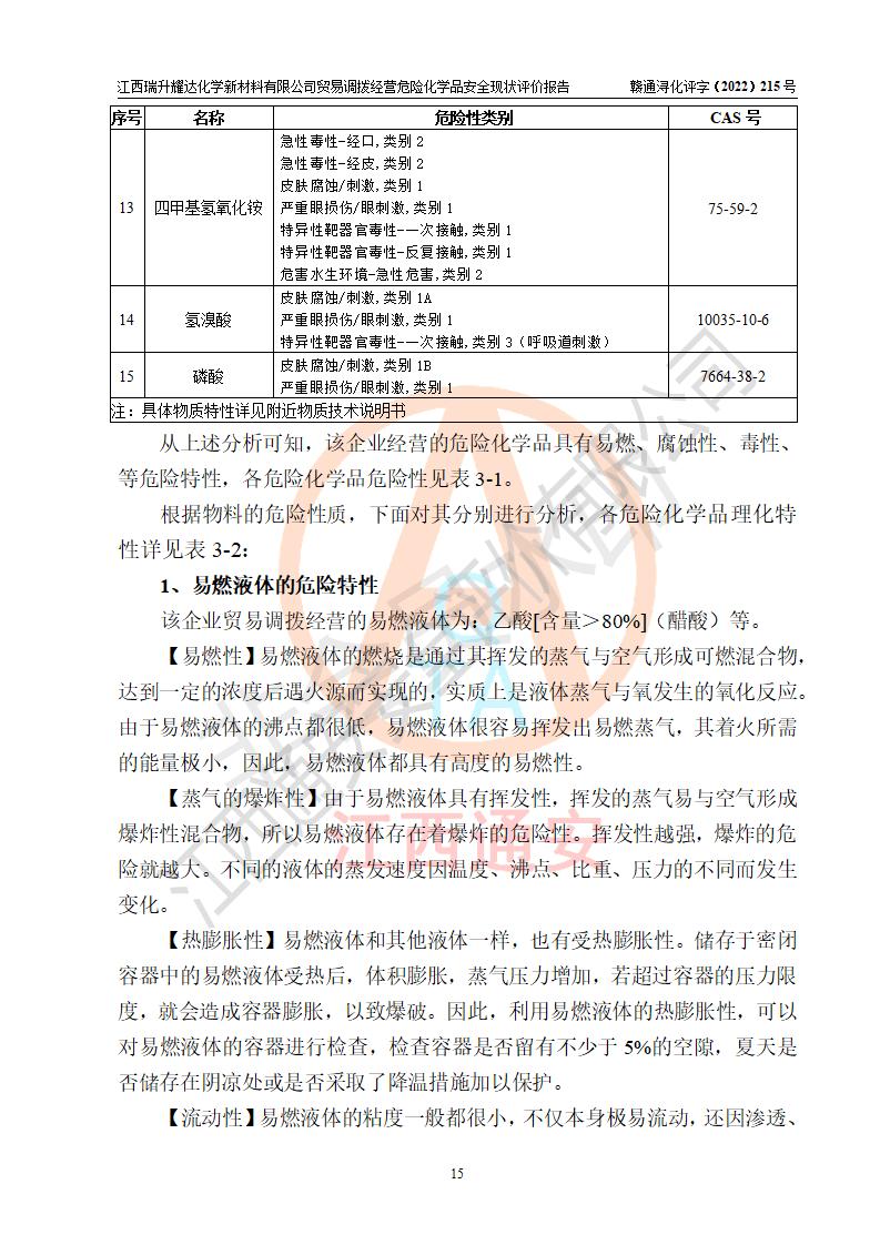 评价结论 | 江西瑞升耀达化学新材料有限公司贸易调拨经营危险化学品的安全条件符合**有关法规、标准、规范要求,落实评价报告有关建议后,风险可控,具备危险化学品经营安全条件。 | |||