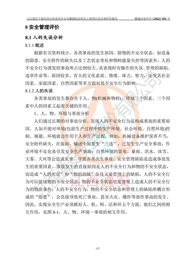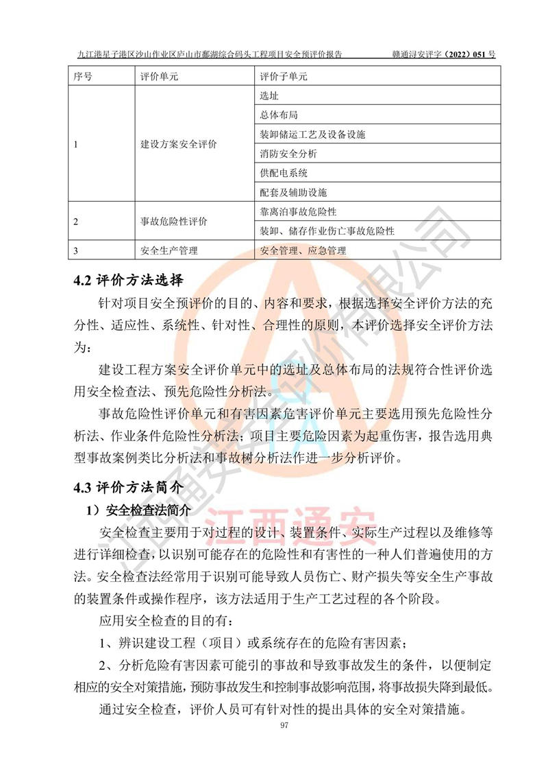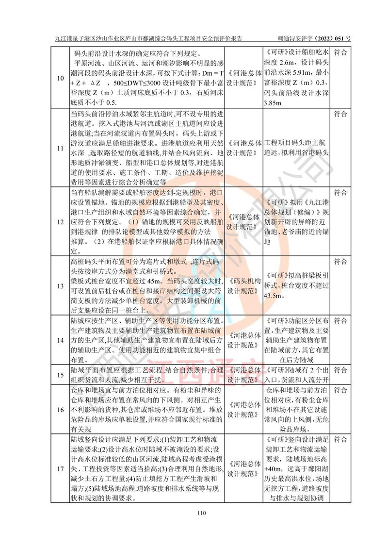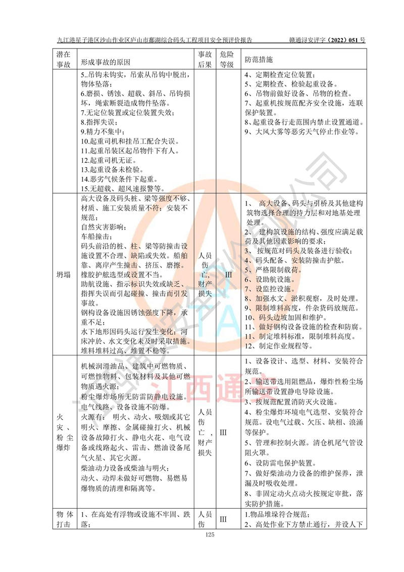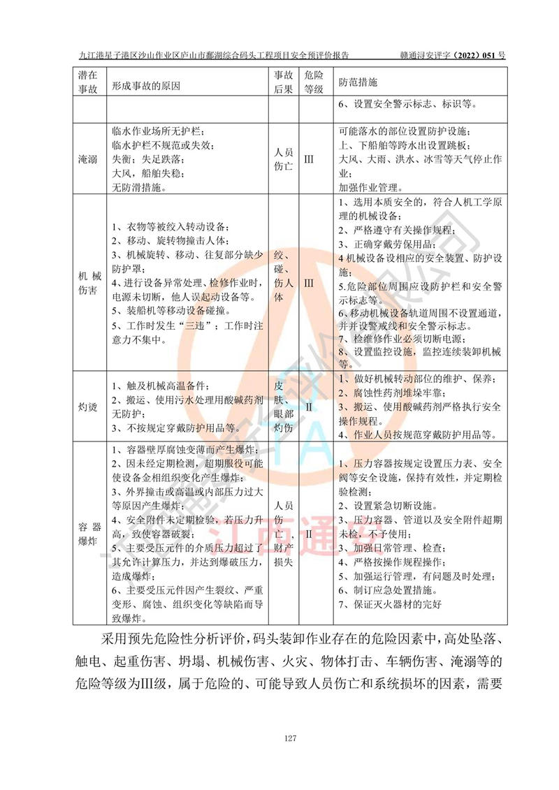 评价结论 | 九江港星子港区沙山作业区庐山市鄱湖综合码头工程项目的选址、周边环境、总体布局、自然环境能满足建设安全条件;项目选择的工艺过程及设备设施的安全可靠性能达到**法规、标准规定要求;项目存在的危险有害因素可控,在落实本评价报告和《可研》提出的有关安全对策措施后,其危险有害程度能达到可以接受的程度,项目建设能够实现安全运行的目标。 | |||||